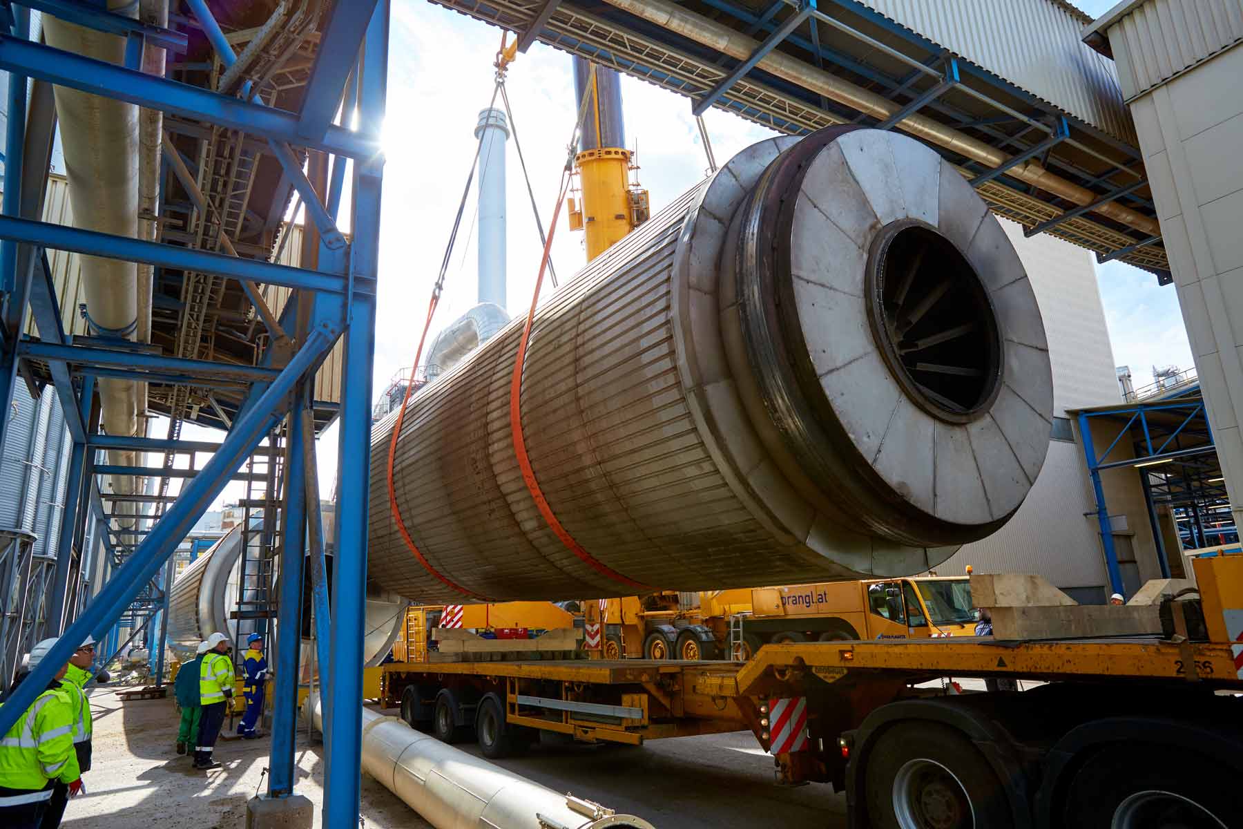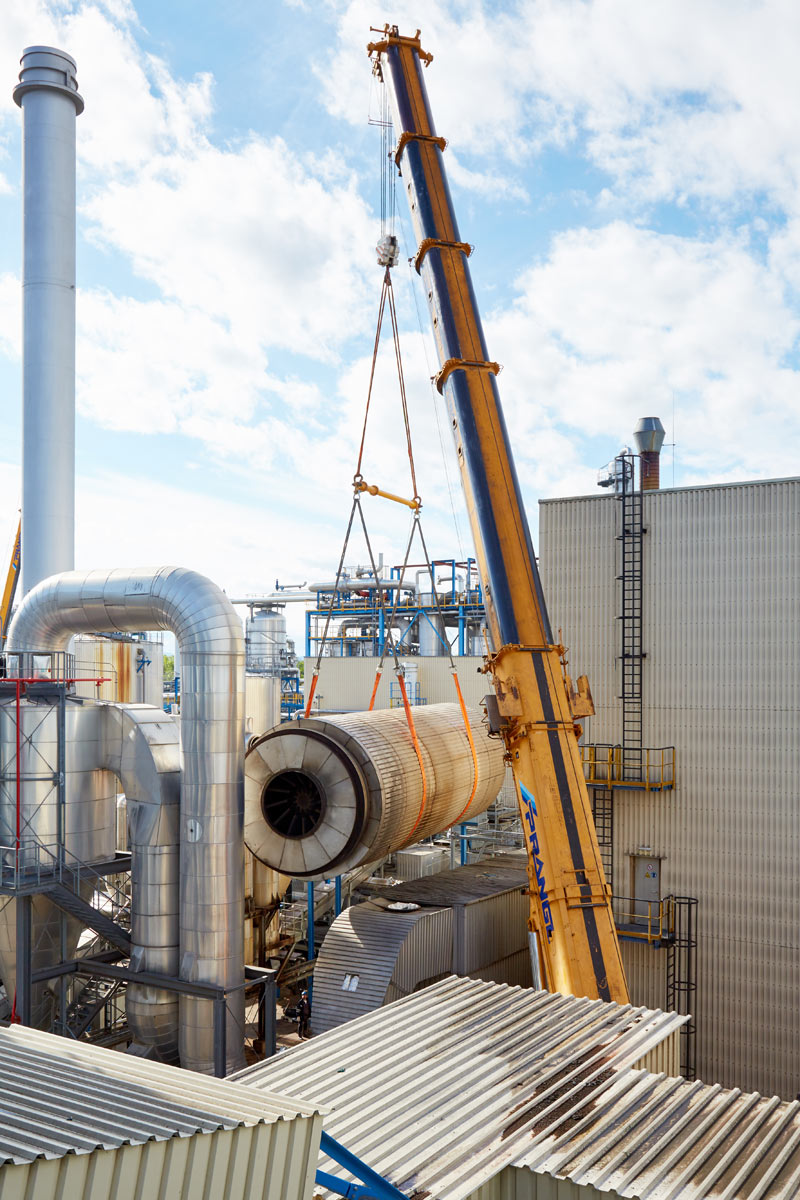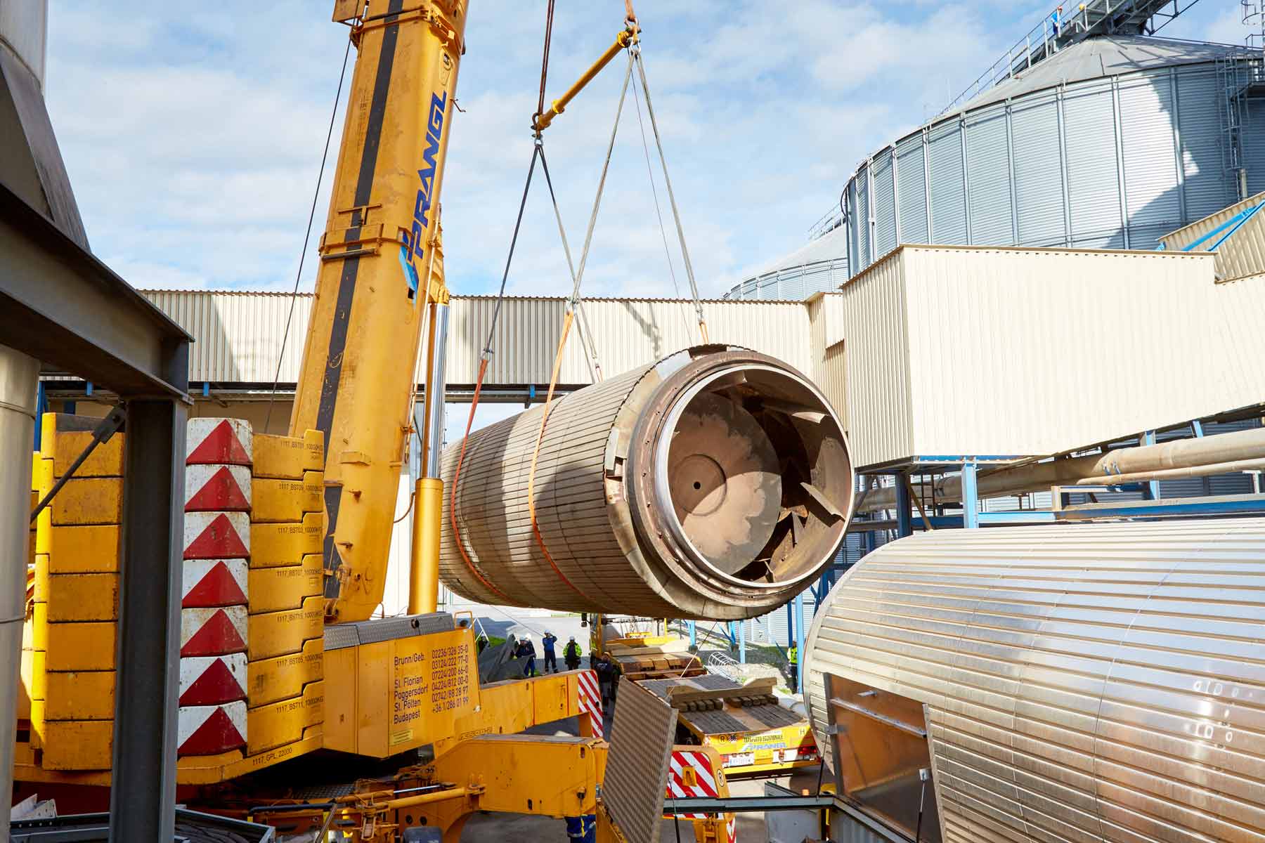Stari bubanj za sušenje velikom je dizalicom premješten izravno na poluprikolicu tvrtke Prangl i pomaknut za 200 metara. Odande ga je premjestila teleskopska dizalica koja teži 220 tona. Sljedeći dan pažljivo je podignut novi bubanj, koji teži 51 tonu, čime je mogla početi ponovna montaža postrojenja.
