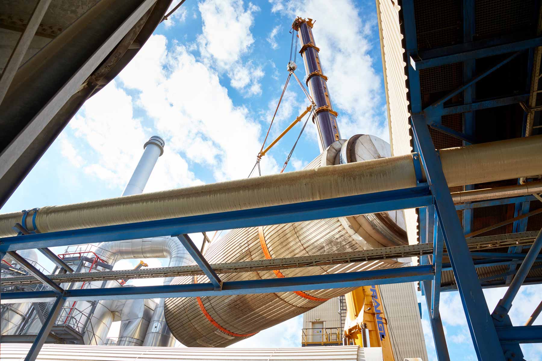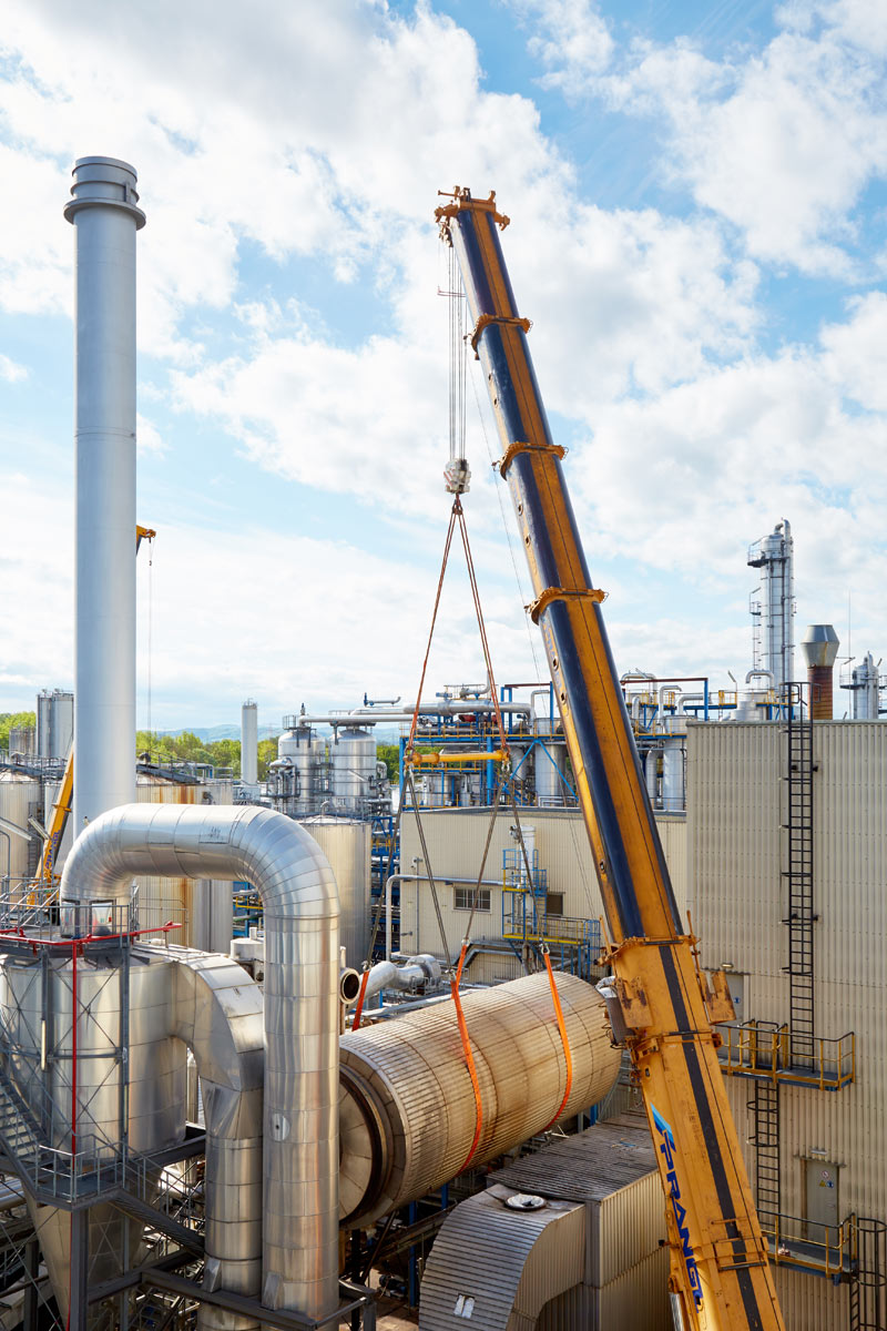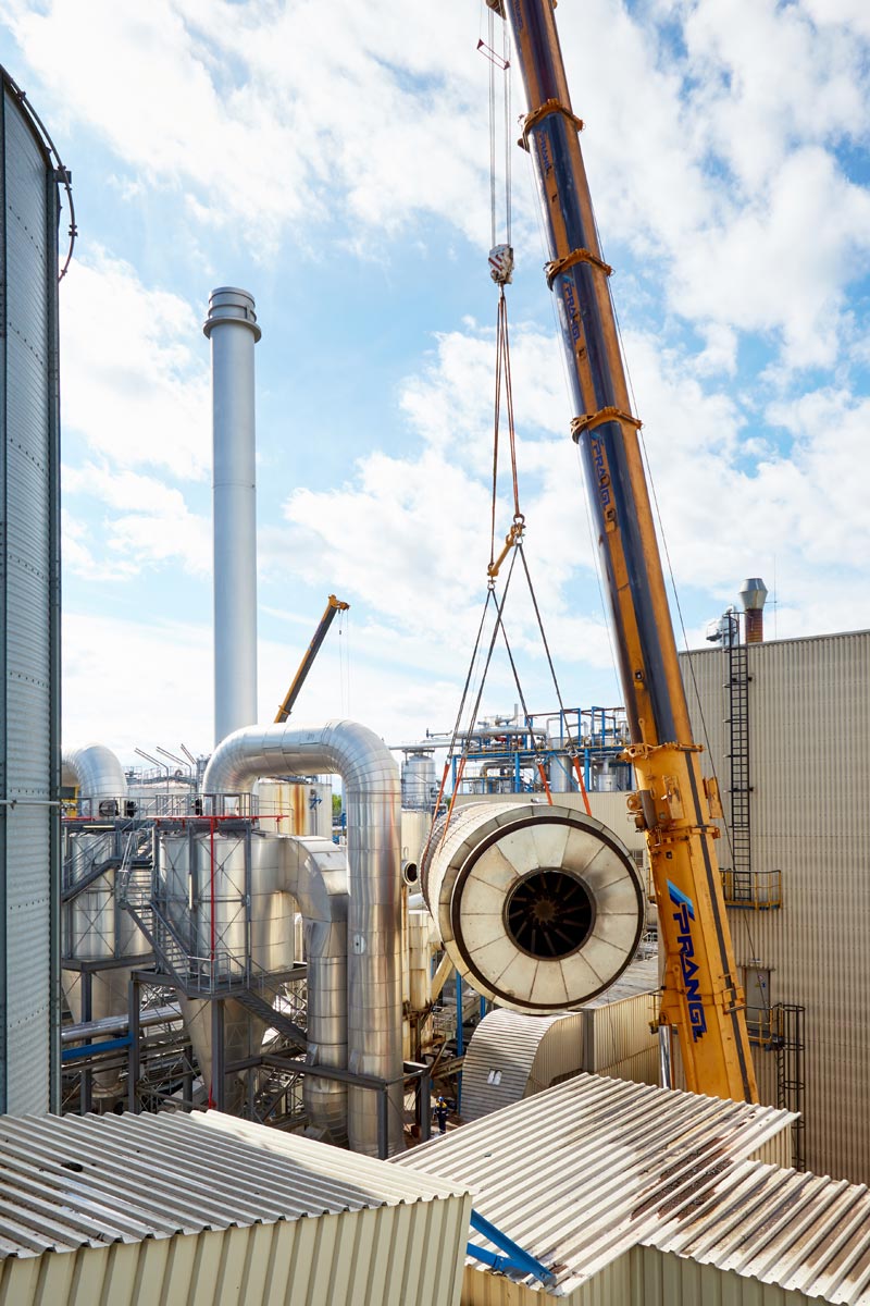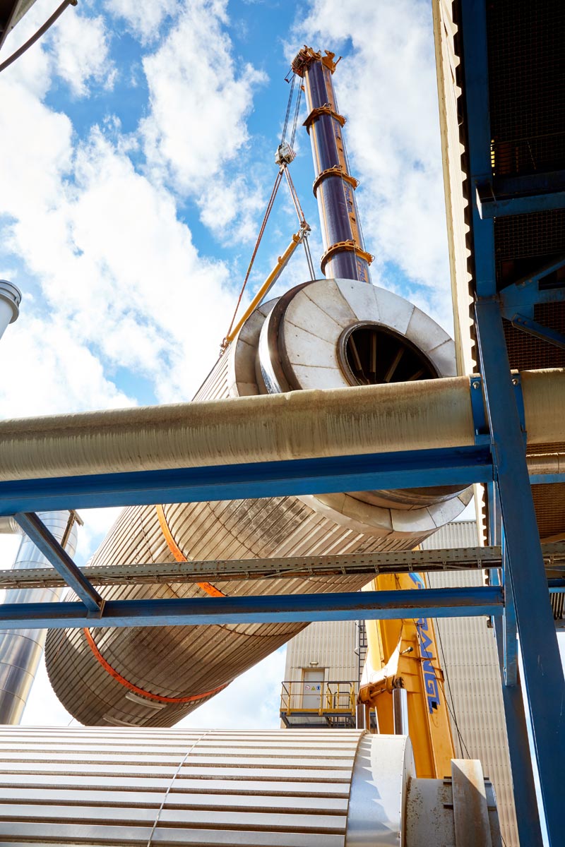 Stari bubanj za sušenje velikom je dizalicom premješten izravno na poluprikolicu tvrtke Prangl i pomaknut za 200 metara. Odande ga je premjestila teleskopska dizalica koja teži 220 tona. Sljedeći dan pažljivo je podignut novi bubanj, koji teži 51 tonu, čime je mogla početi ponovna montaža postrojenja.