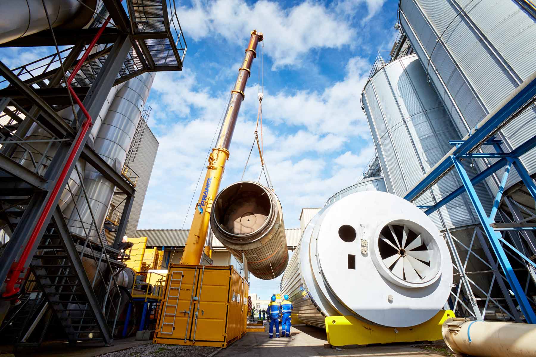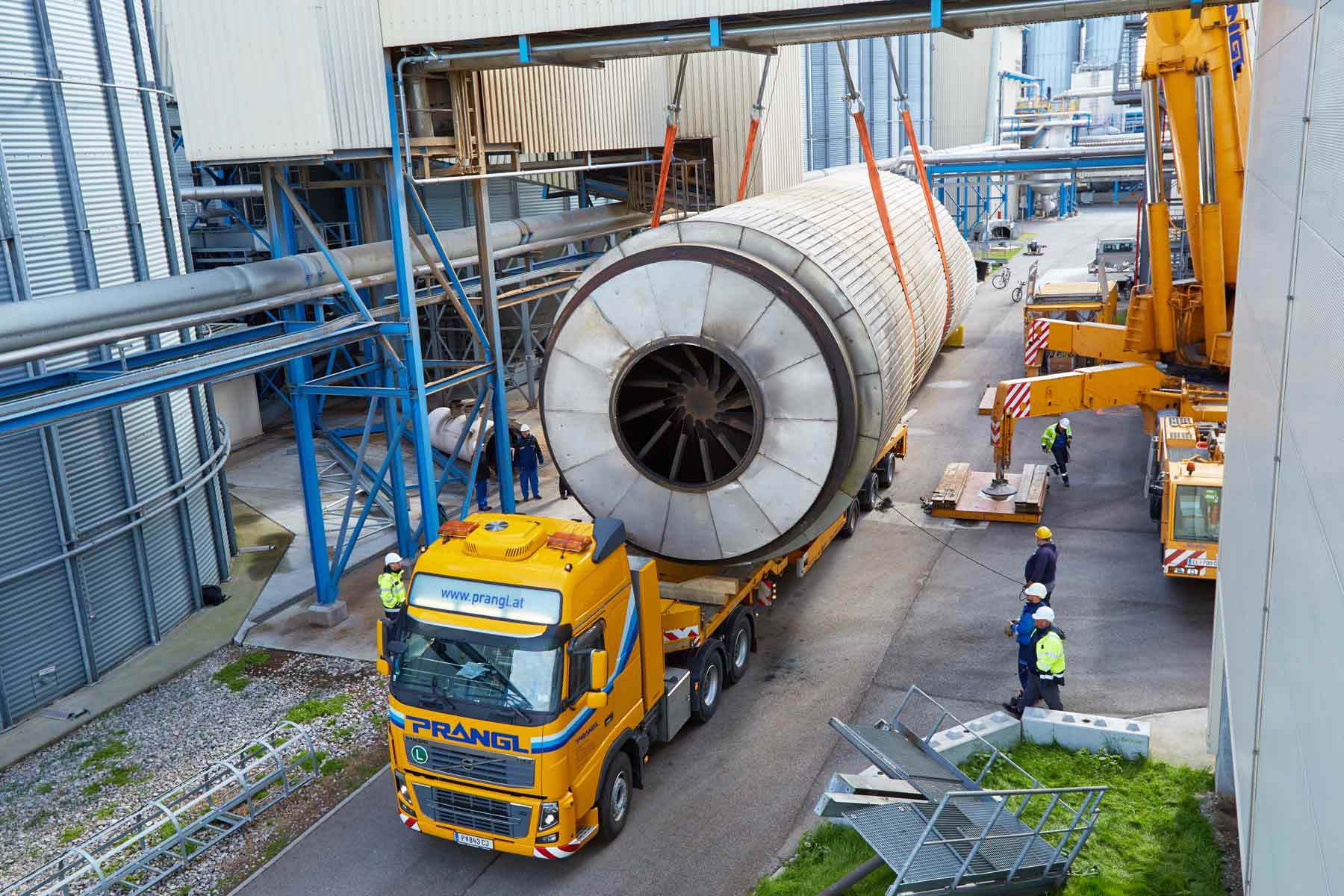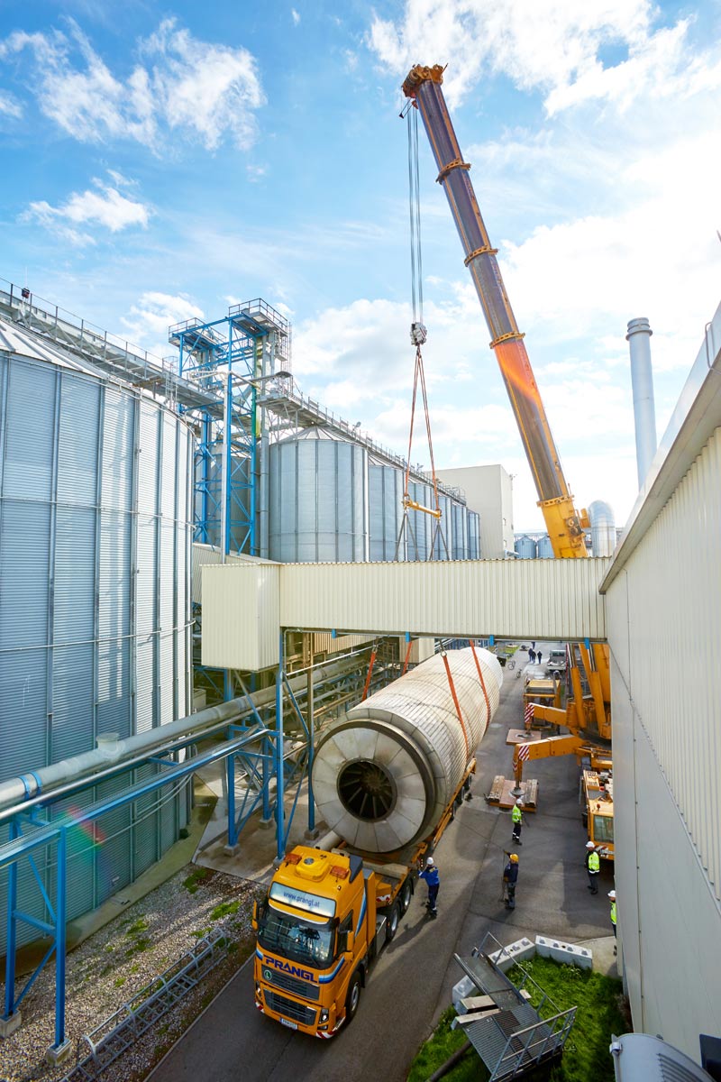 Tvrtka Prangl je na području postrojenja Agrana morala obaviti mnogo posla. Središnji događaj ovogodišnjeg zaustavljanja proizvodnje sigurno je bilo teško mijenjanje bubnja za sušenje koji je težio 51 tonu. U vrlo uskim razmjerima (između postojećih zgrada) trebao je podići stari bubanj i postaviti novi. Zahvaljujući dobrom planiranju i preciznom radu operatora dizalica, oba delikatna podizanja savršeno su obavljena.