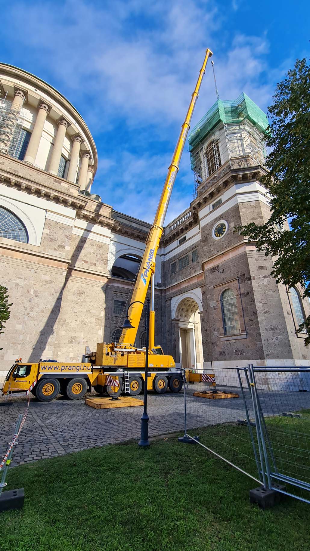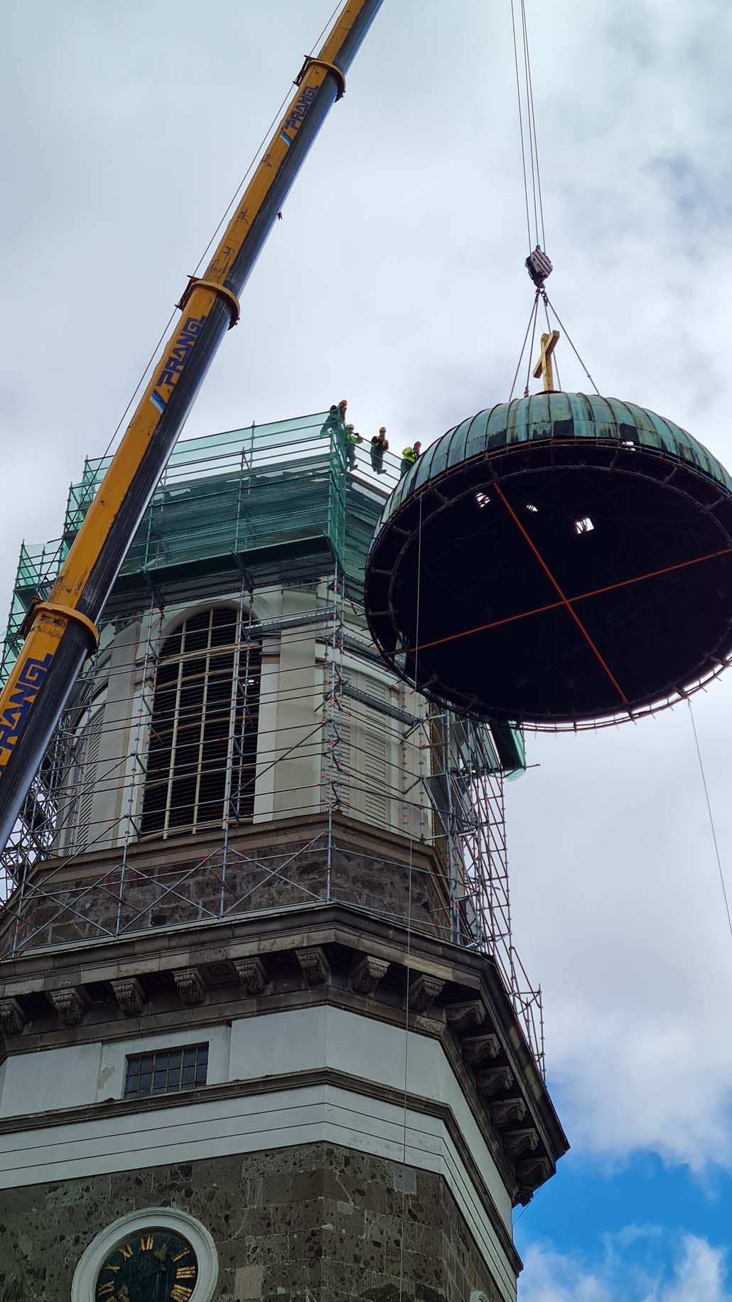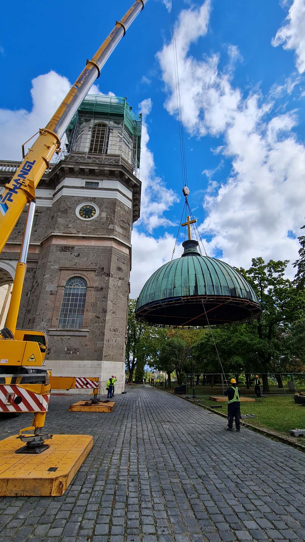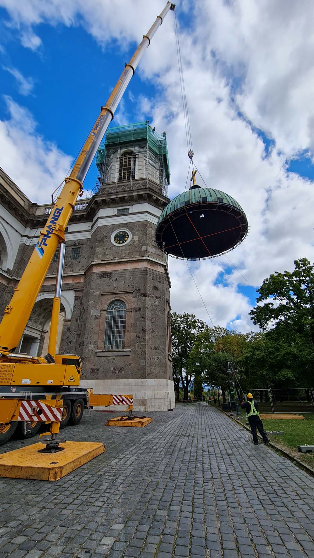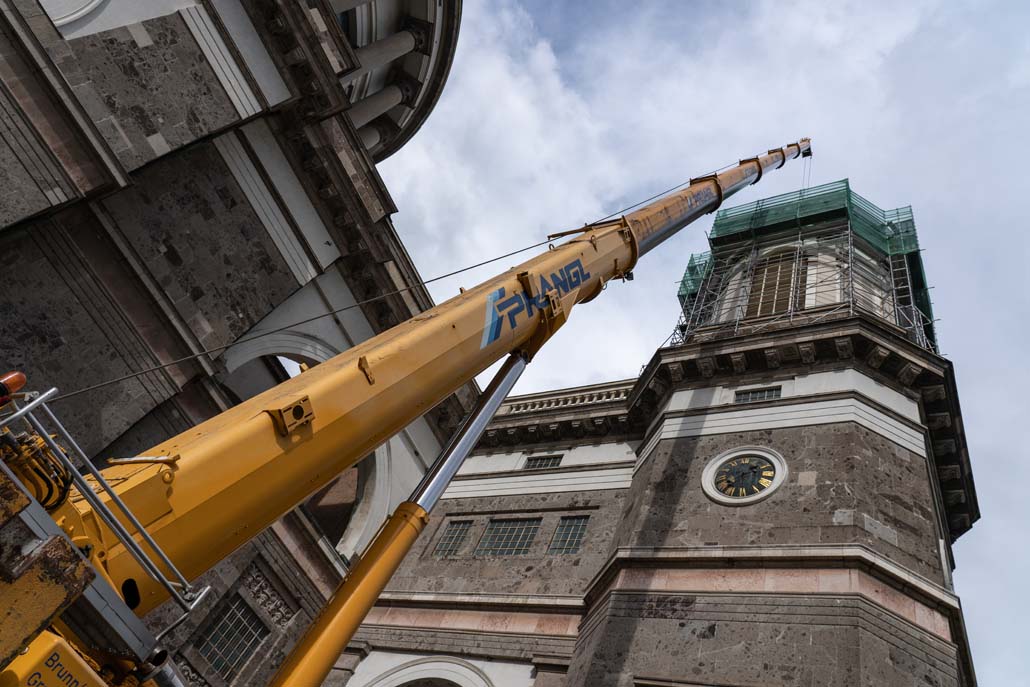Teleskopska dizalica nosivosti 250 tona pokazala se kao najučinkovitije rješenje u ovom slučaju. Iako bi i manja dizalica sa produžetkom bila dovoljna za podizanje tereta, gust raspored nije dopuštao montažu produžetka. Veća teleskopska dizalica uspjela je izvršiti sva dizanja sa svojom glavnim kranom od 72 metra (protuteža 47,5 tona). Kao prvi korak u opsežnim radovima na podizanju, pažljivo je podignuta kupola čija je najviša točka s križem na visini od 60 metara. Postavljena je na mjesto uz baziliku, gdje se također obavlja restauracija.