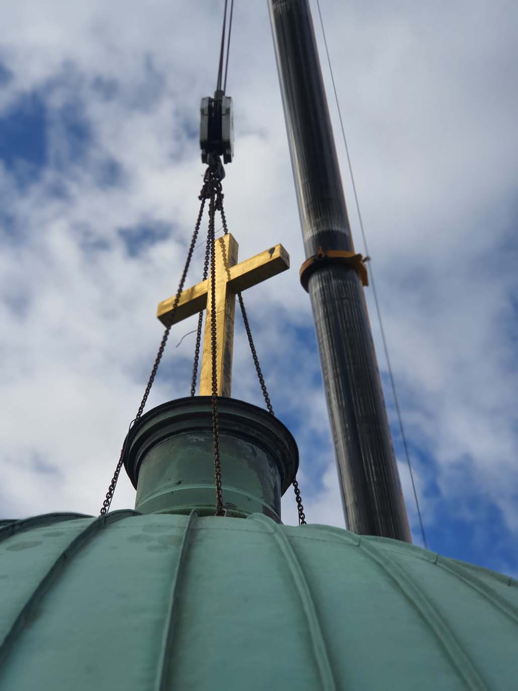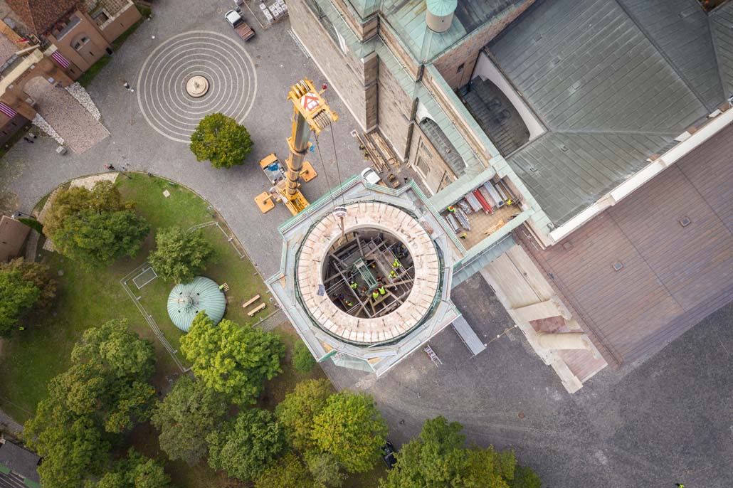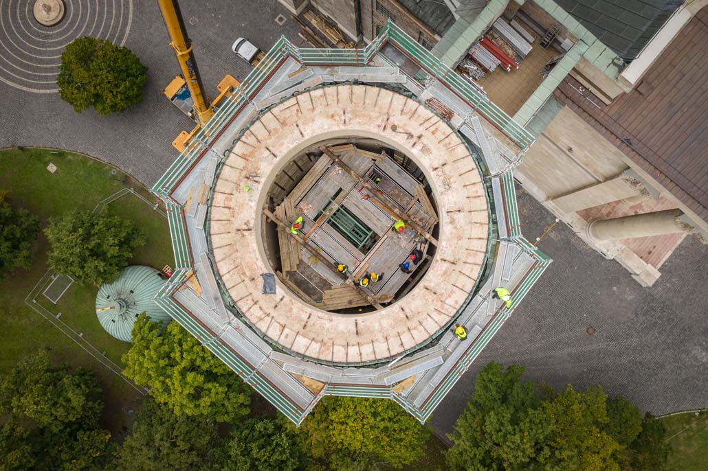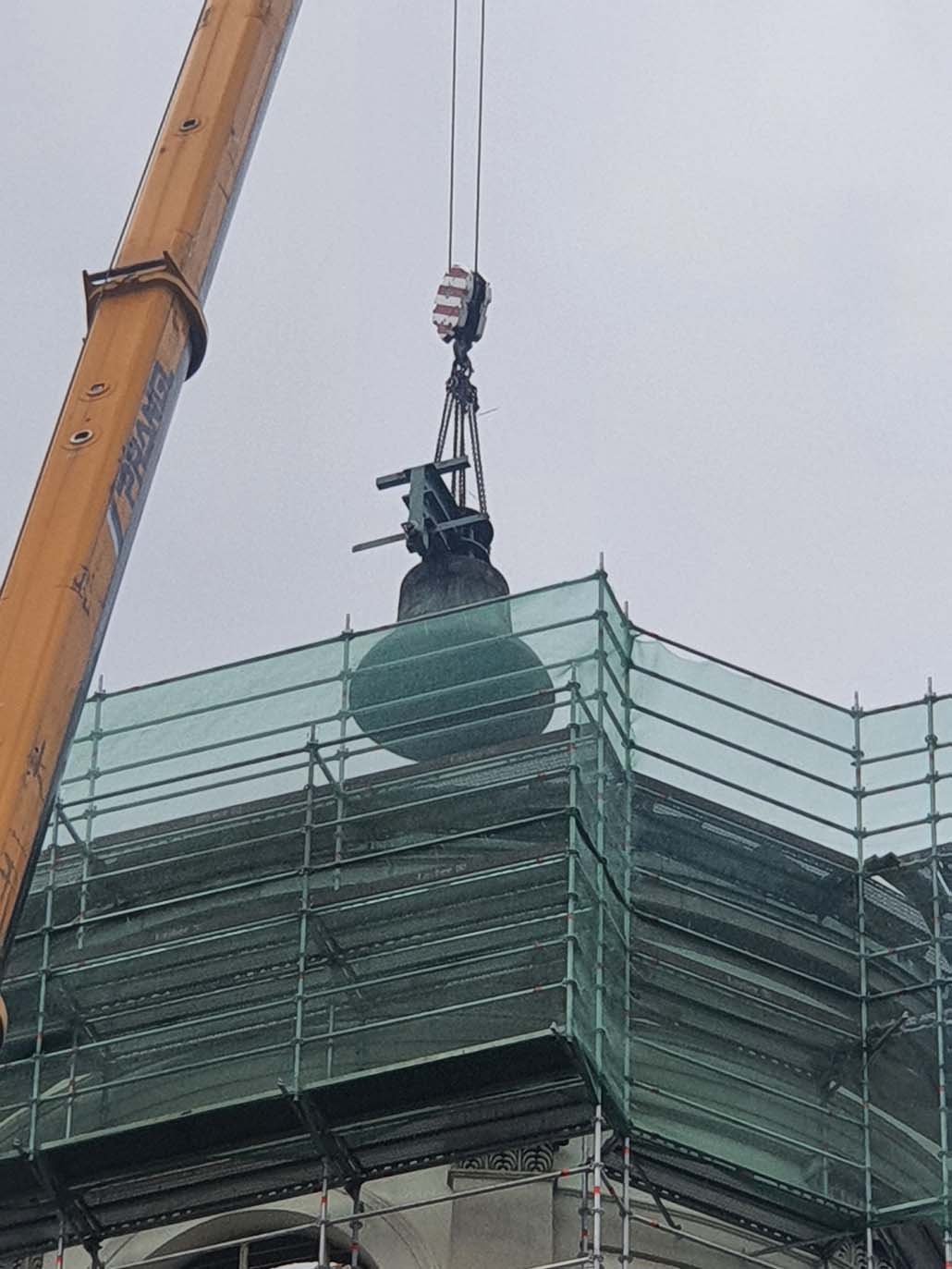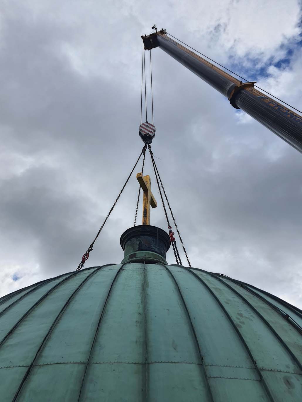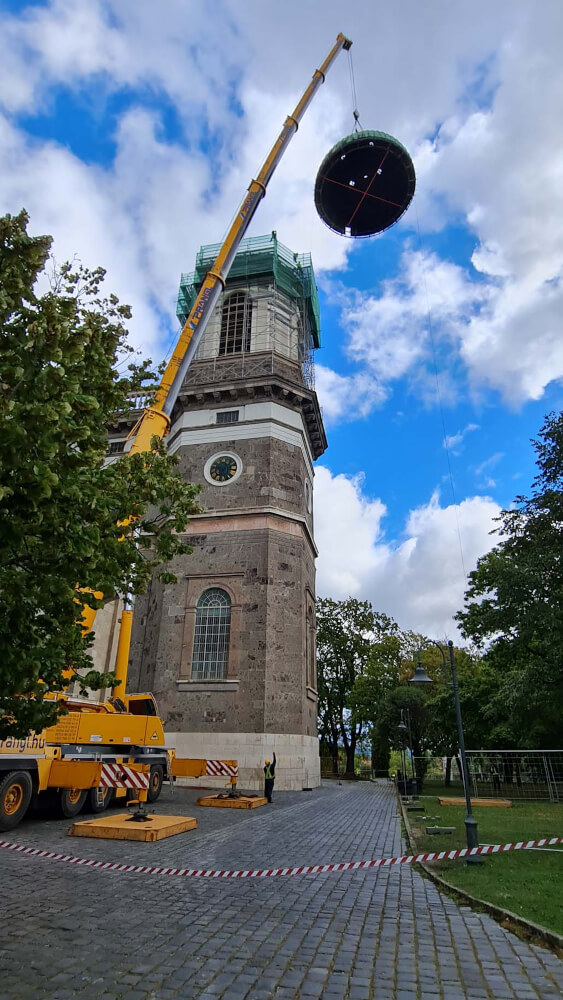 Teleskopska dizalica nosivosti 250 tona pokazala se kao najučinkovitije rješenje u ovom slučaju. Iako bi i manja dizalica sa produžetkom bila dovoljna za podizanje tereta, gust raspored nije dopuštao montažu produžetka. Veća teleskopska dizalica uspjela je izvršiti sva dizanja sa svojom glavnim kranom od 72 metra (protuteža 47,5 tona). Kao prvi korak u opsežnim radovima na podizanju, pažljivo je podignuta kupola čija je najviša točka s križem na visini od 60 metara. Postavljena je na mjesto uz baziliku, gdje se također obavlja restauracija.