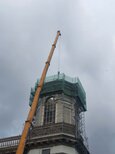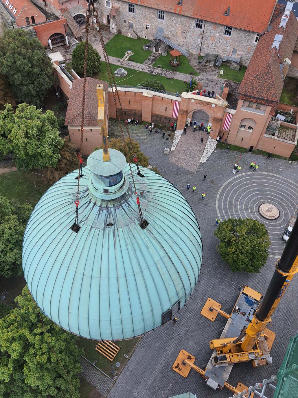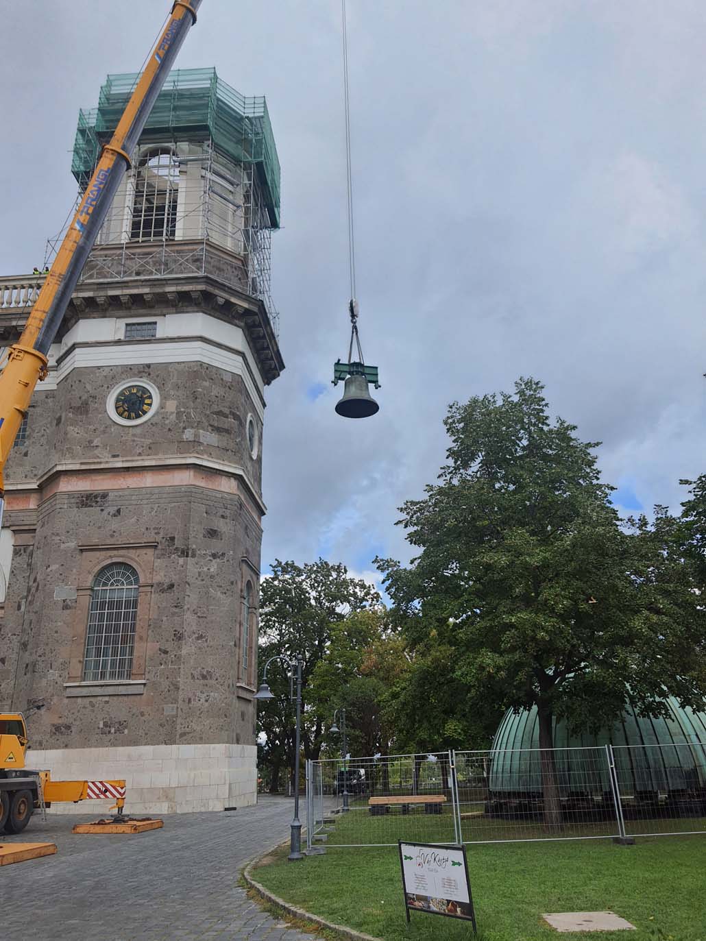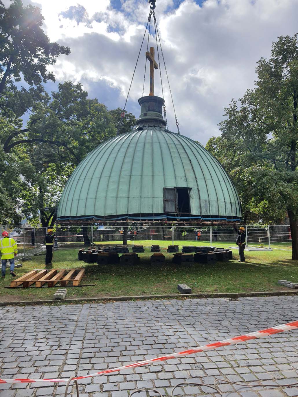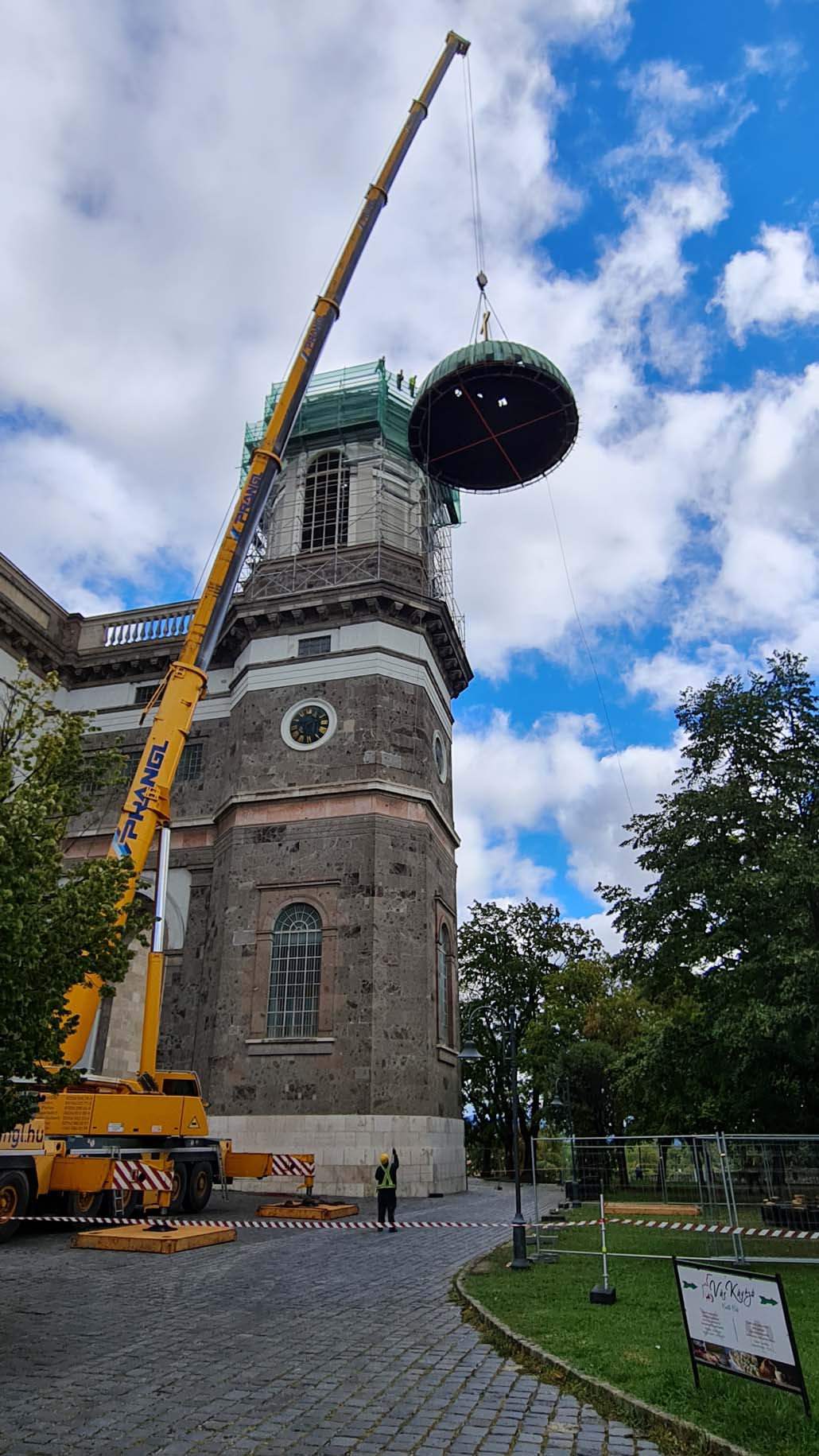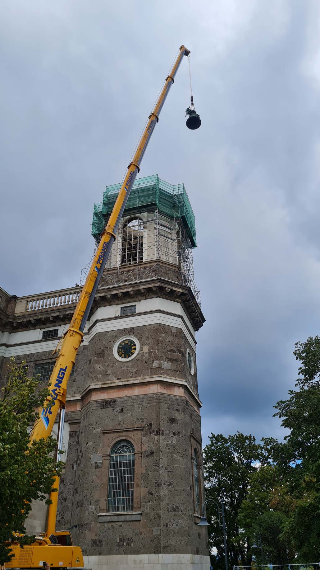 Teleskopska dizalica nosivosti 250 tona pokazala se kao najučinkovitije rješenje u ovom slučaju. Iako bi i manja dizalica sa produžetkom bila dovoljna za podizanje tereta, gust raspored nije dopuštao montažu produžetka. Veća teleskopska dizalica uspjela je izvršiti sva dizanja sa svojom glavnim kranom od 72 metra (protuteža 47,5 tona). Kao prvi korak u opsežnim radovima na podizanju, pažljivo je podignuta kupola čija je najviša točka s križem na visini od 60 metara. Postavljena je na mjesto uz baziliku, gdje se također obavlja restauracija.