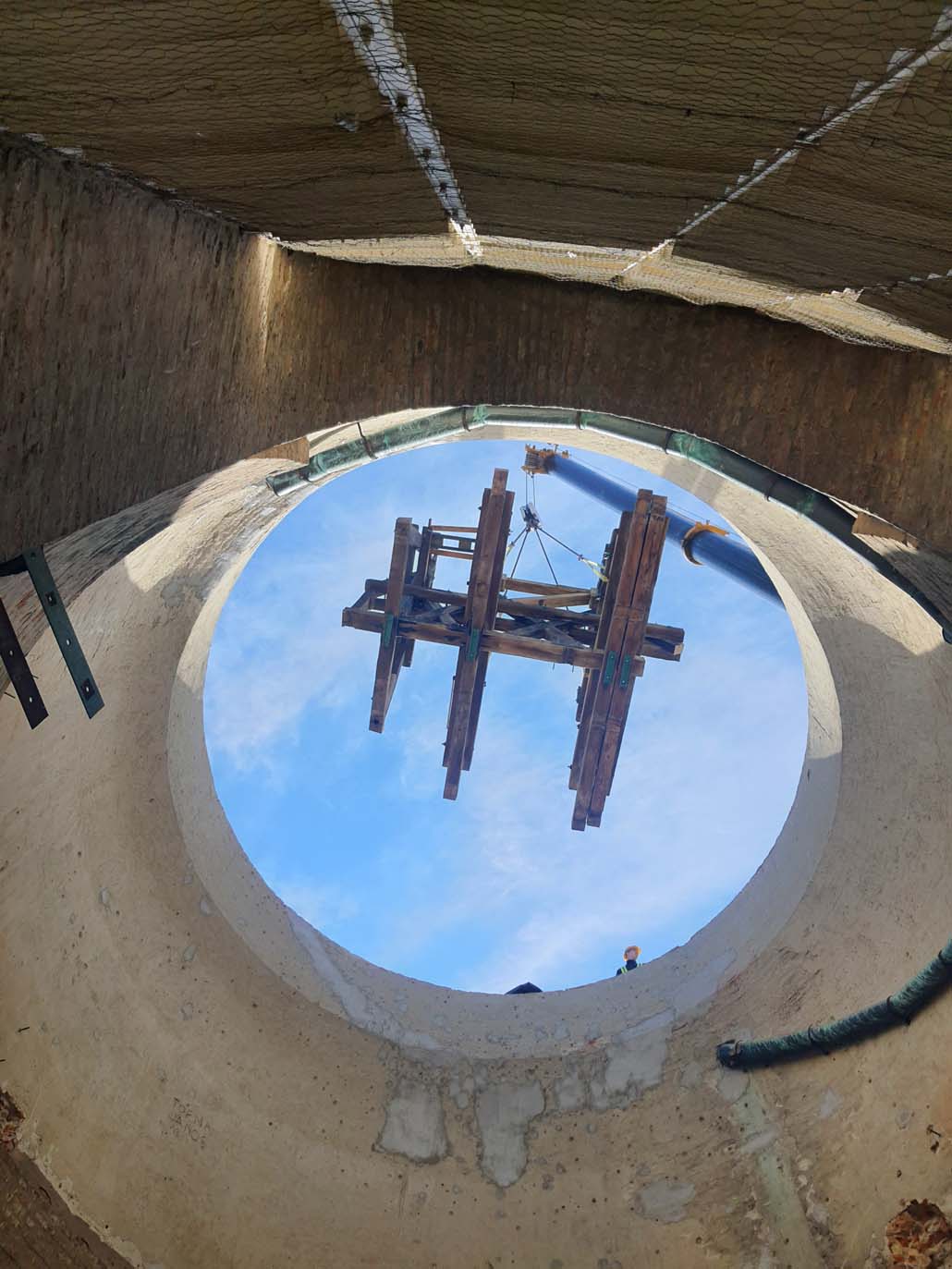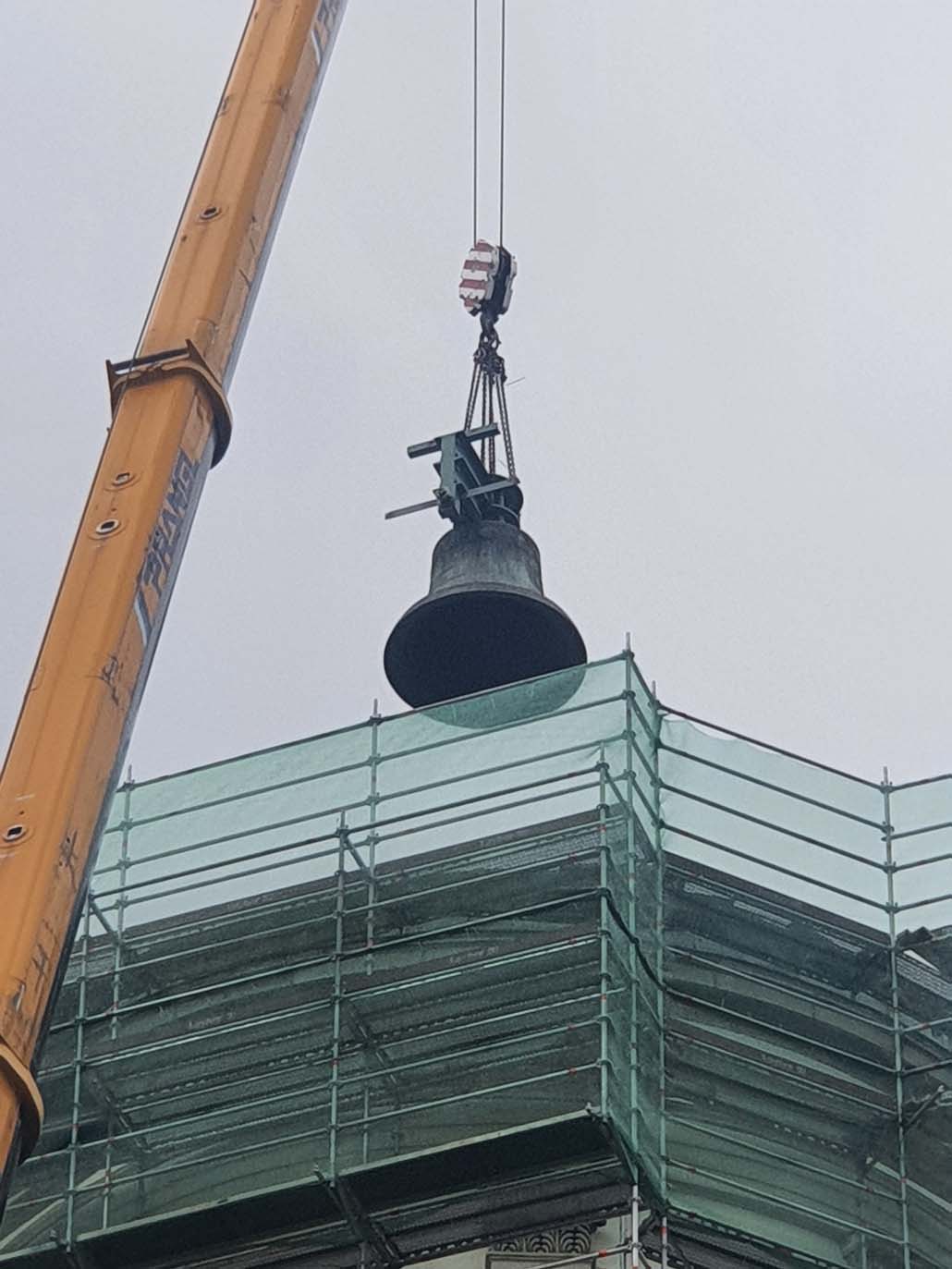 Sljedećih nekoliko dizalica poslužilo je za rušenje i uklanjanje stropa nad zvonima. Na redu je bilo veliko zvono promjera gotovo 2,2 metra i težine cca 6 tona. Izvučen je zajedno s nosačem teškim oko 1,3 tone. Uslijedilo je drugo zvono teško oko 300 kilograma i promjera 0,8 metara. Prilikom naknadnog iskapanja zvonika bilo je važno da se on izvadi u što većim cjelinama. Razbijena je na dva dijela, svaki težak 5,5 i 6 tona, te su izvučeni pojedinačno.