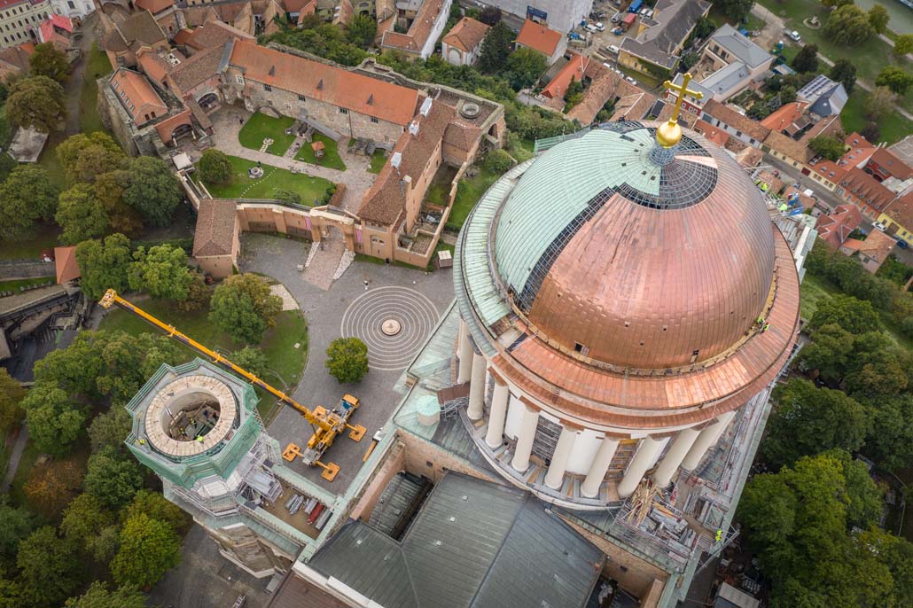 Katedrala Esztergom, 100 metara visoka neoklasična katedrala, nalazi se na najvišoj točki grada. S površinom od 5660 četvornih metara najveća je crkva u Mađarskoj i jedna od najvećih bazilika u Europi. Sada se veličanstvena crkva pažljivo obnavlja; posao napreduje. Važna faza je kompletna unutarnja i vanjska obnova južnog tornja. Da bi se najveće od tri ovdje smještena zvona moglo obnoviti - a da se pritom ne uništi zid tornja - trebalo je skinuti kupolu s tornja i ukloniti cijelu krovnu konstrukciju.