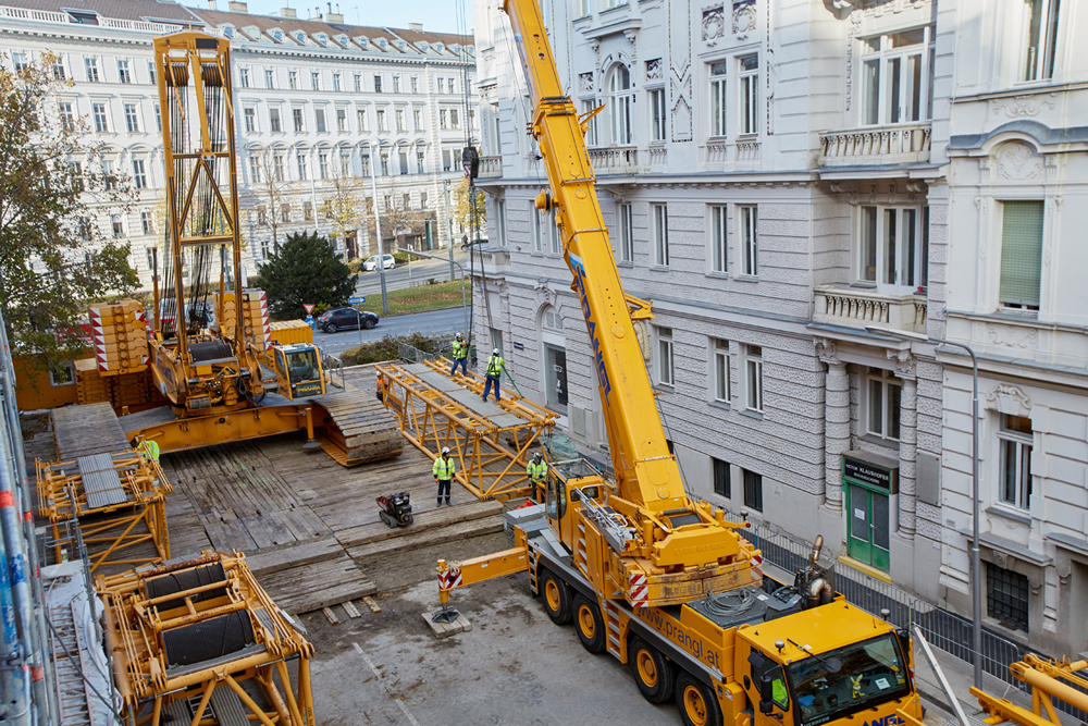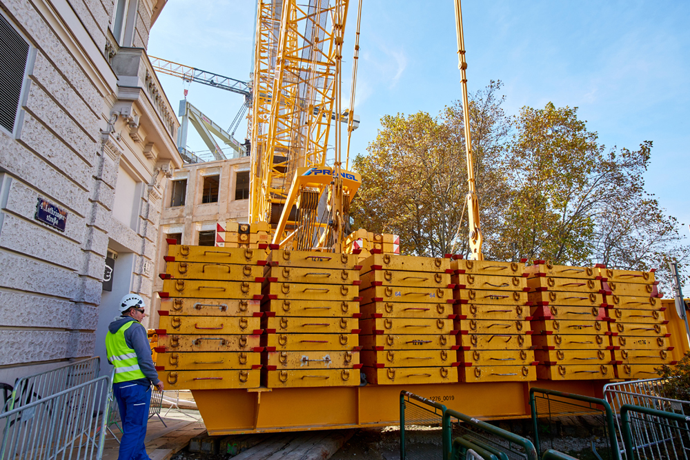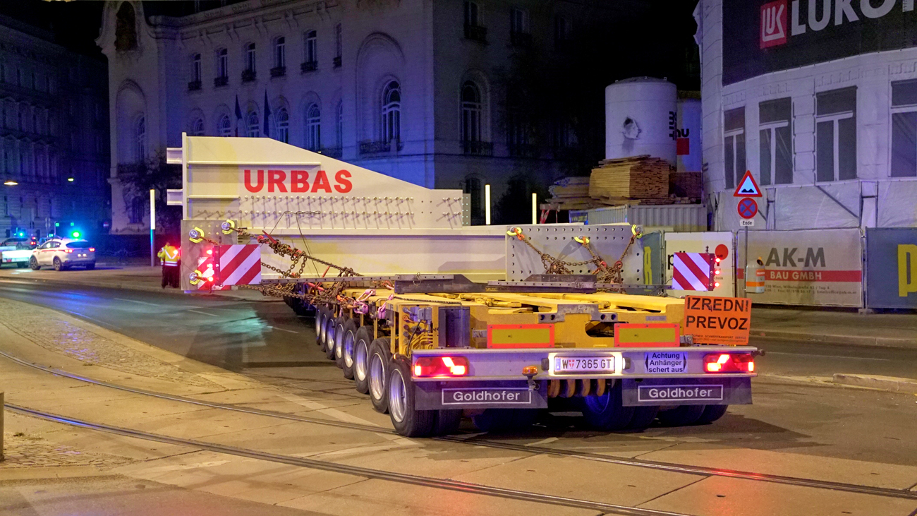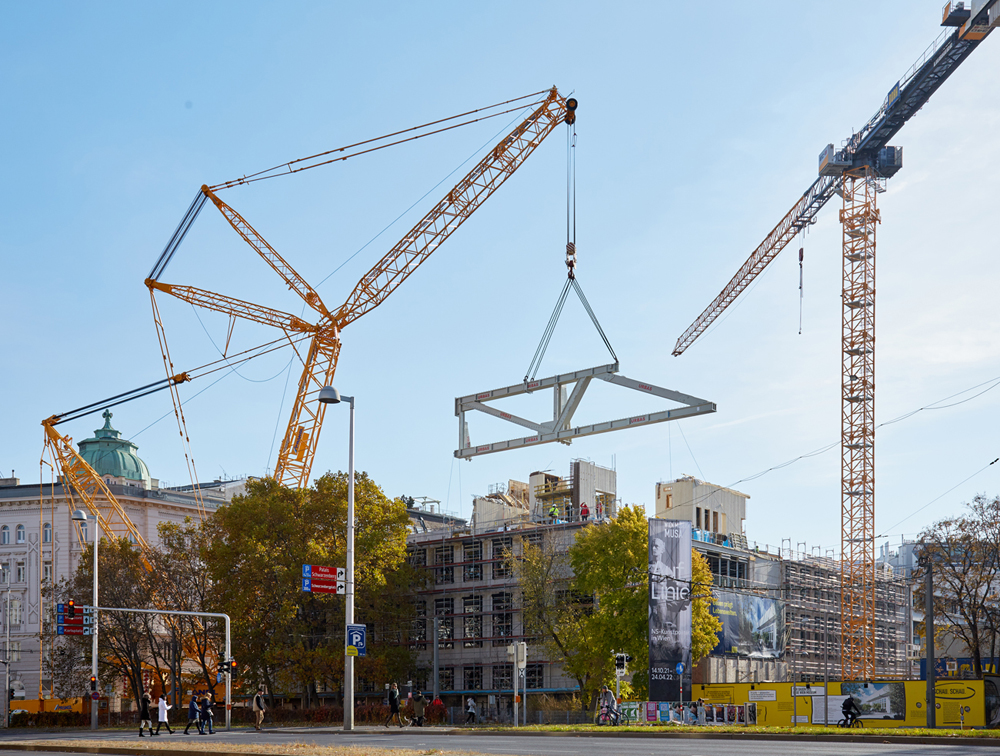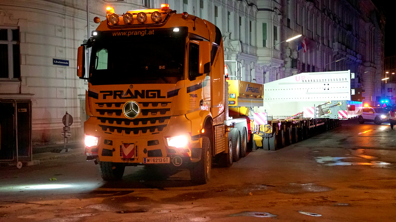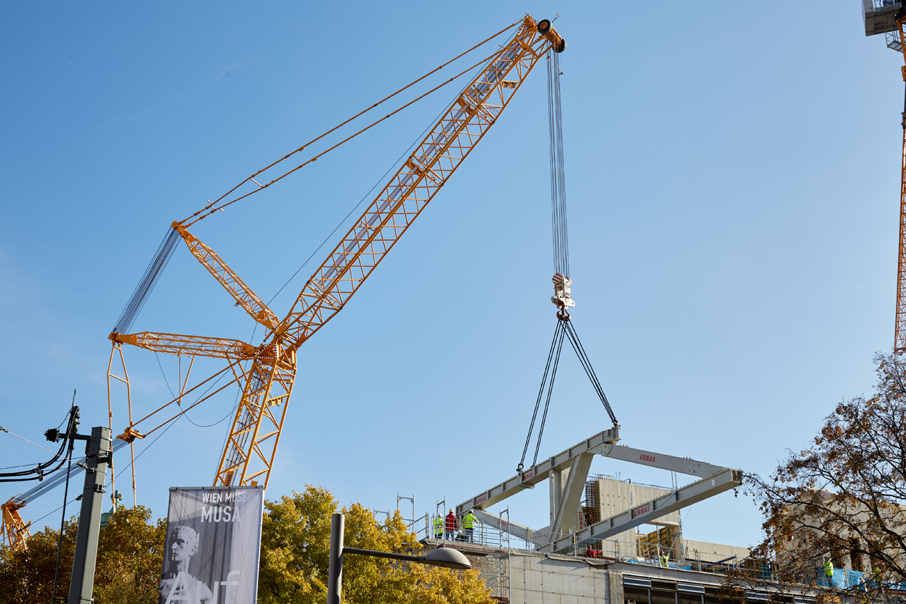 Osam vozila pratilo je teške prijevoze do Karlsplatza u Beču. Tamo ih je preuzela dizalica na gusjenicama s nosivošću od 600 tona te dužinom ruke od 84 metra. Neke od konstrukcija su podignute izravno, a druge su bile spojene na tlu. Najteži čelični element imao je jednu težinu od 165 tona. Kako bi se velika dizalica veličine obiteljske kuće mogla pozicionirati između dvije zgrade blizu stanice podzemne željeznice, bilo je potrebno nekoliko stvari: blokada ceste, brojne zabrane prometa, uklanjanje ulične rasvjete i promijene rute biciklističke staze.
