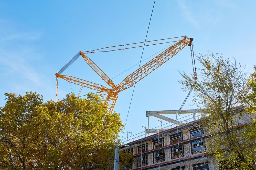 Podizanje velike dizalice bila je točno tempirana i slijedila je strogi slijed. Zbog ograničenog prostora sve se moralo obaviti na vrijeme. Također je iznimno značajno bilo i mjesto postavljanja dizalice na gusjenicama. Uostalom, žuti div težio je 750 tona. U tu svrhu cesta je zatvorena, a zatim potpuno prekrivena podlogama za bagere od tvrdog drveta. Složena logistika dizanja zaokružena je teleskopskom dizalicom s nosivošću od 500 tona, koja je nakon otprilike 1,5 tjedna zamijenila dizalicu na gusjenicama. Sa sustavnom dužinom od 79,2 metra, dizalica je zamijenila posljednja dizanja na dvije različite točke. Iznimno dobra suradnja svih sudionika je osigurala da ovaj jedinstveni pothvat na kraju bude uspješan.