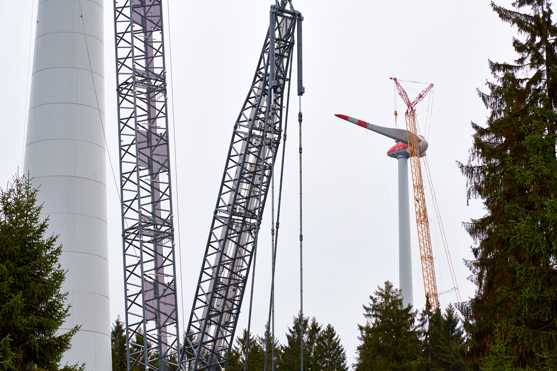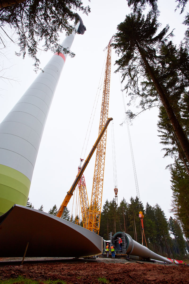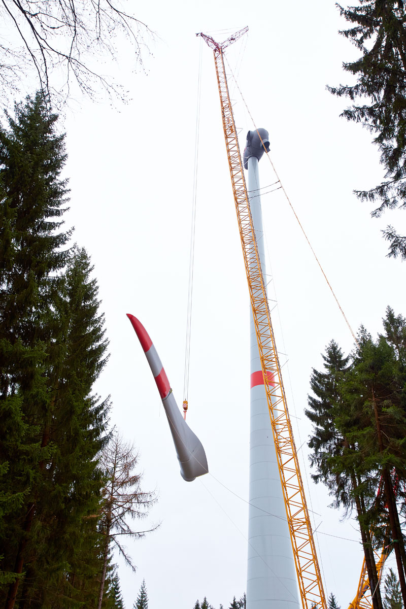 Kod svake vjetroturbine trebalo je podignuti dva čelična elementa s težinom od 55 tona. Najteže komponente predstavljaju dva kućišta motora od kojih svaki teži po 64 tona i po dvije glavine koje teže 65 tona. Budući da se vjetroelektrana nalazi u brdovitom šumskom području, prostor je prilično skučen - postavljanje i demontaža velikih dizalica predstavlja izazov. U kratkom roku trebalo je posjeći nekoliko stabala, što je učinjeno u koordinaciji s lokalnim operaterima, jer u suprotnom postavljanje vjetroturbina ne bi bilo moguće.