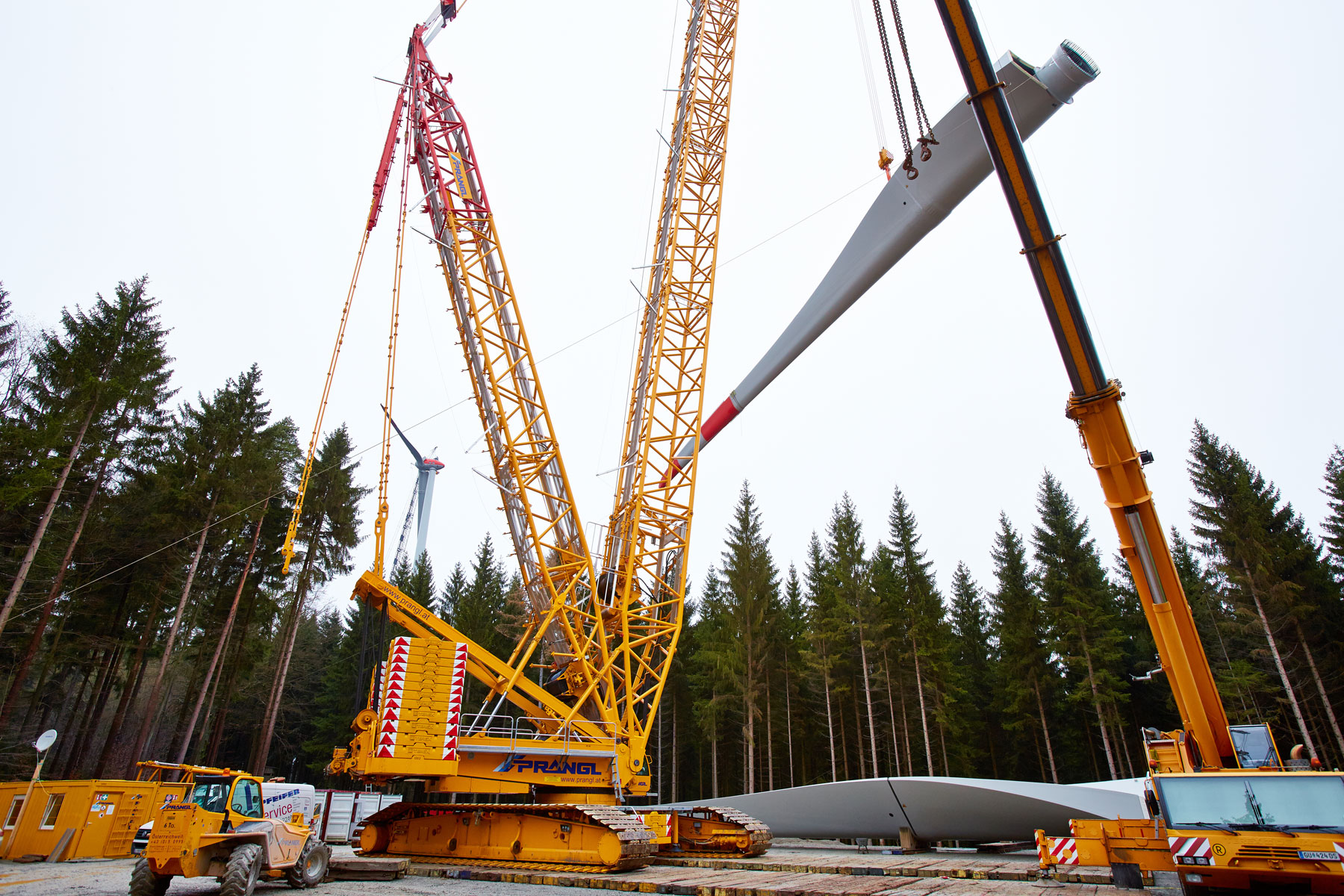 Stručnjaci tvrtke Prangl na licu mjesta podijelili su se u dvije ekipe koje su upravljale velike dizalice i koje su bile odgovorne za pravilno postavljanje vjetroturbina. U uporabi su dvije dizalice sa gusjenicama najnovije generacije, jedna od 600 tona, a druga od 650 tona. Svakoj ekipi pored toga pomaže i jedna pomoćna dizalica od 200 tona i teleskopski viličar od 6 tona. Kod nekoliko postrojenja pored toga u pomoć je priskočila još 80 tonska teleskopska dizalica na gusjenicama. Običajna teleskopska dizalica tu bi naletjela na krajnje granice svojih sposobnosti.