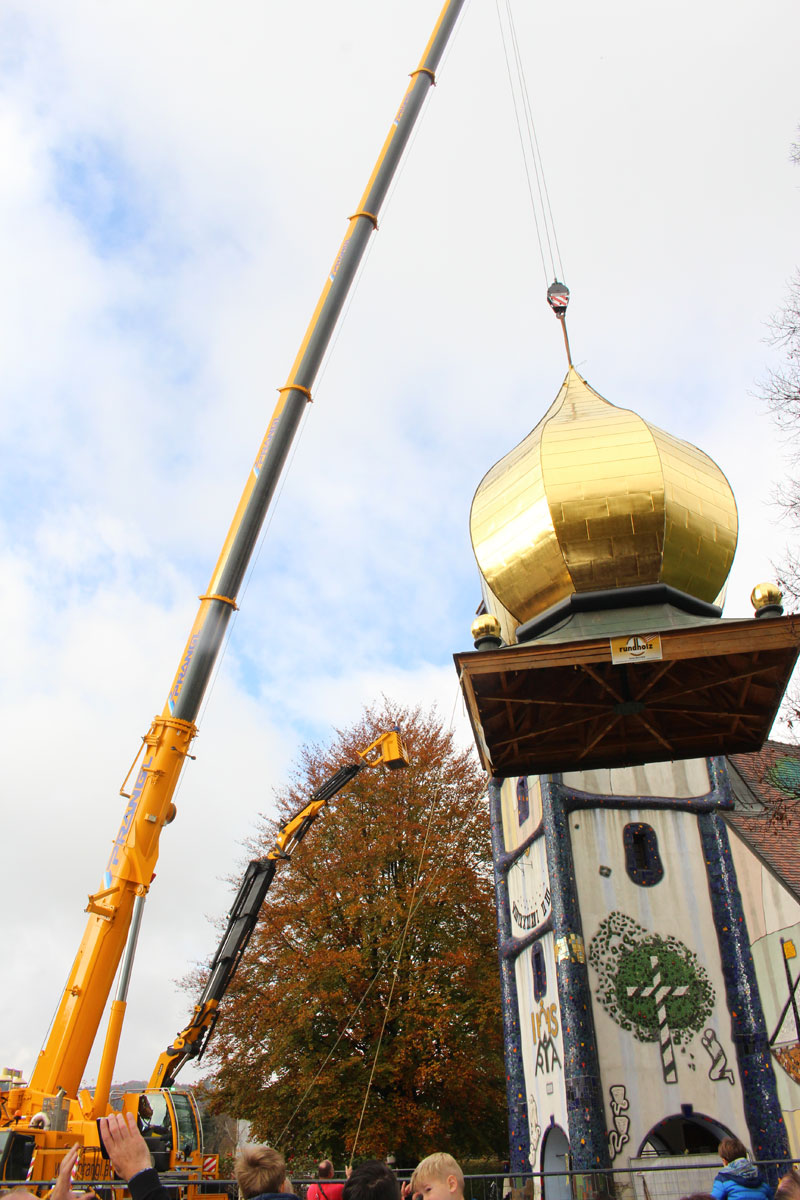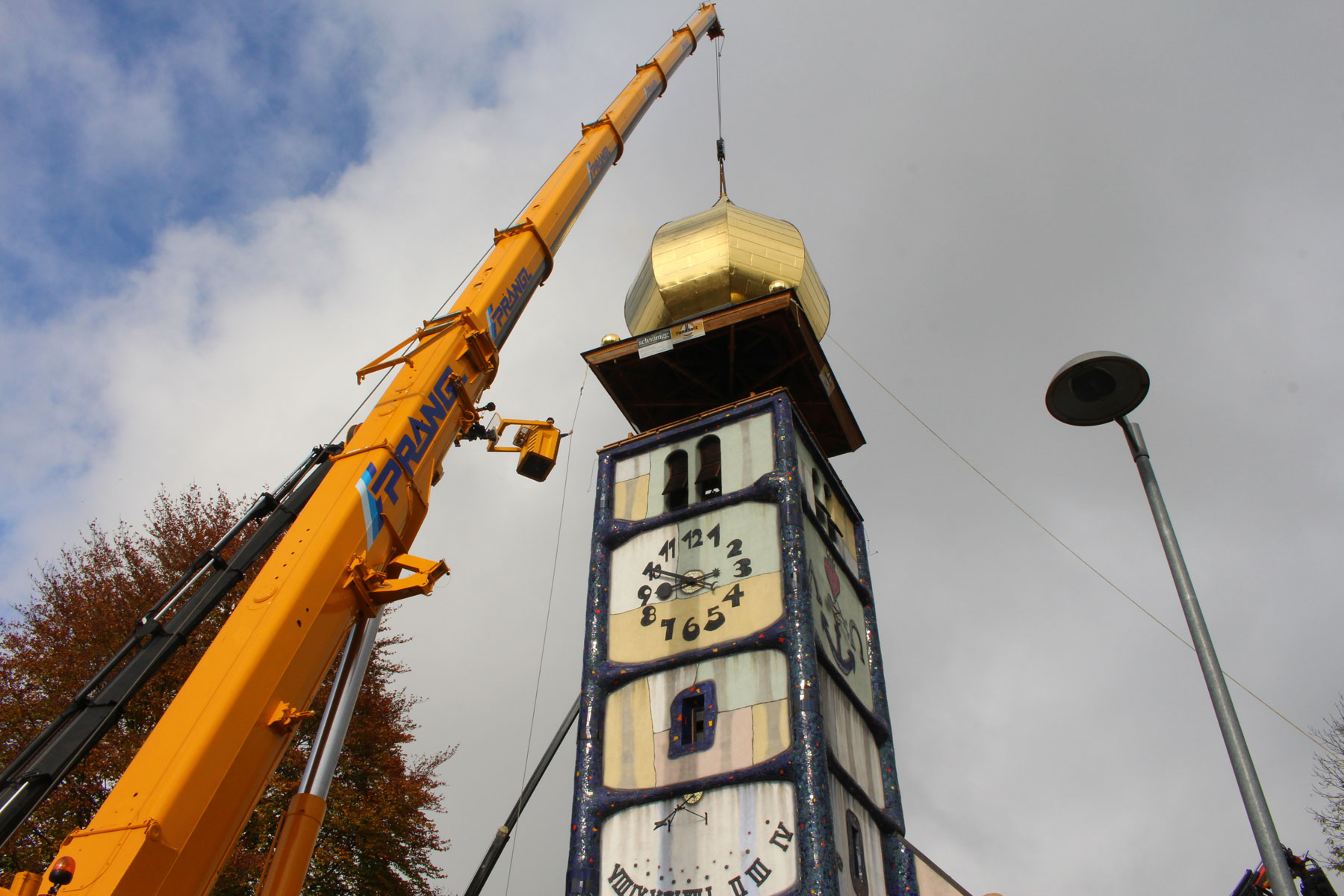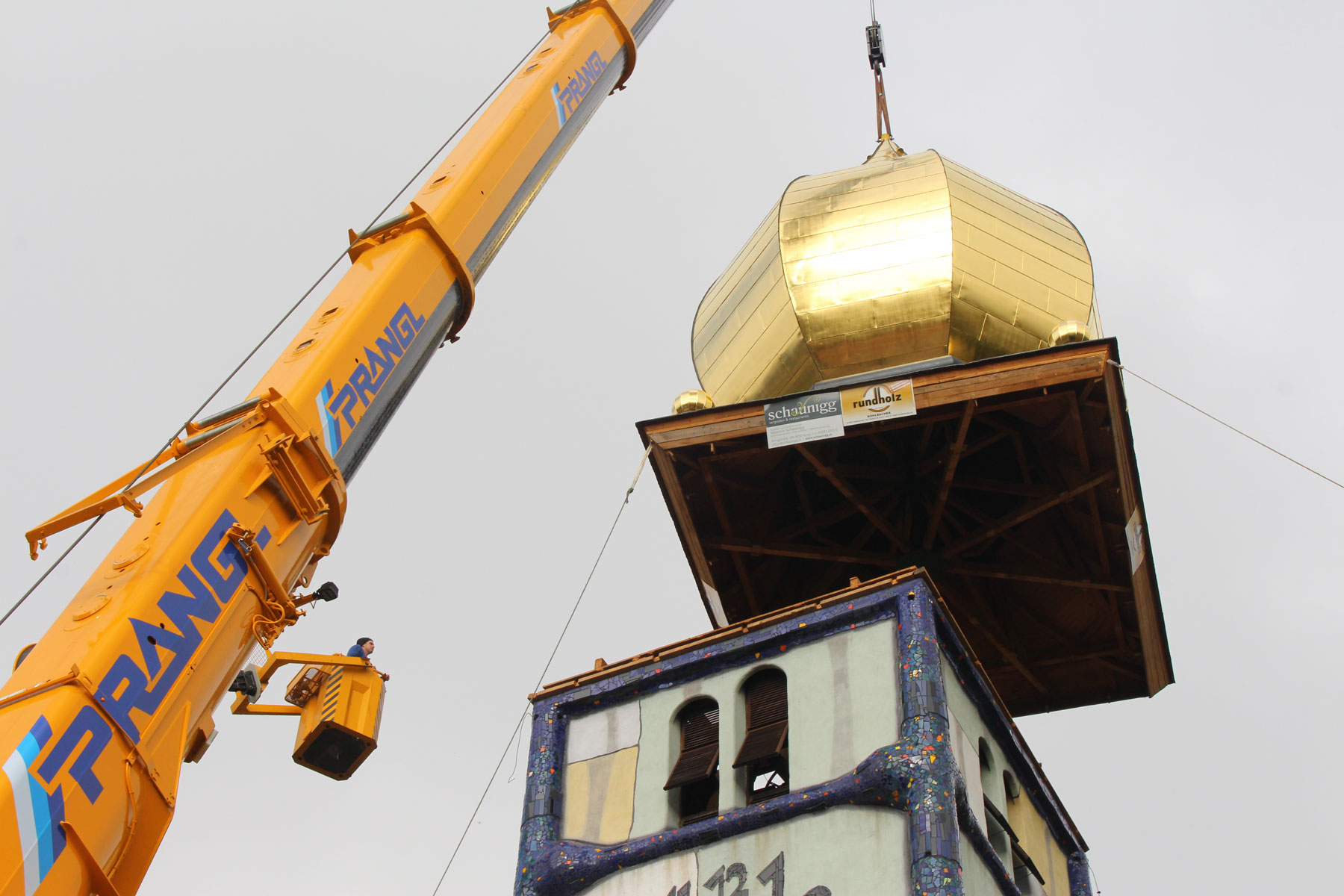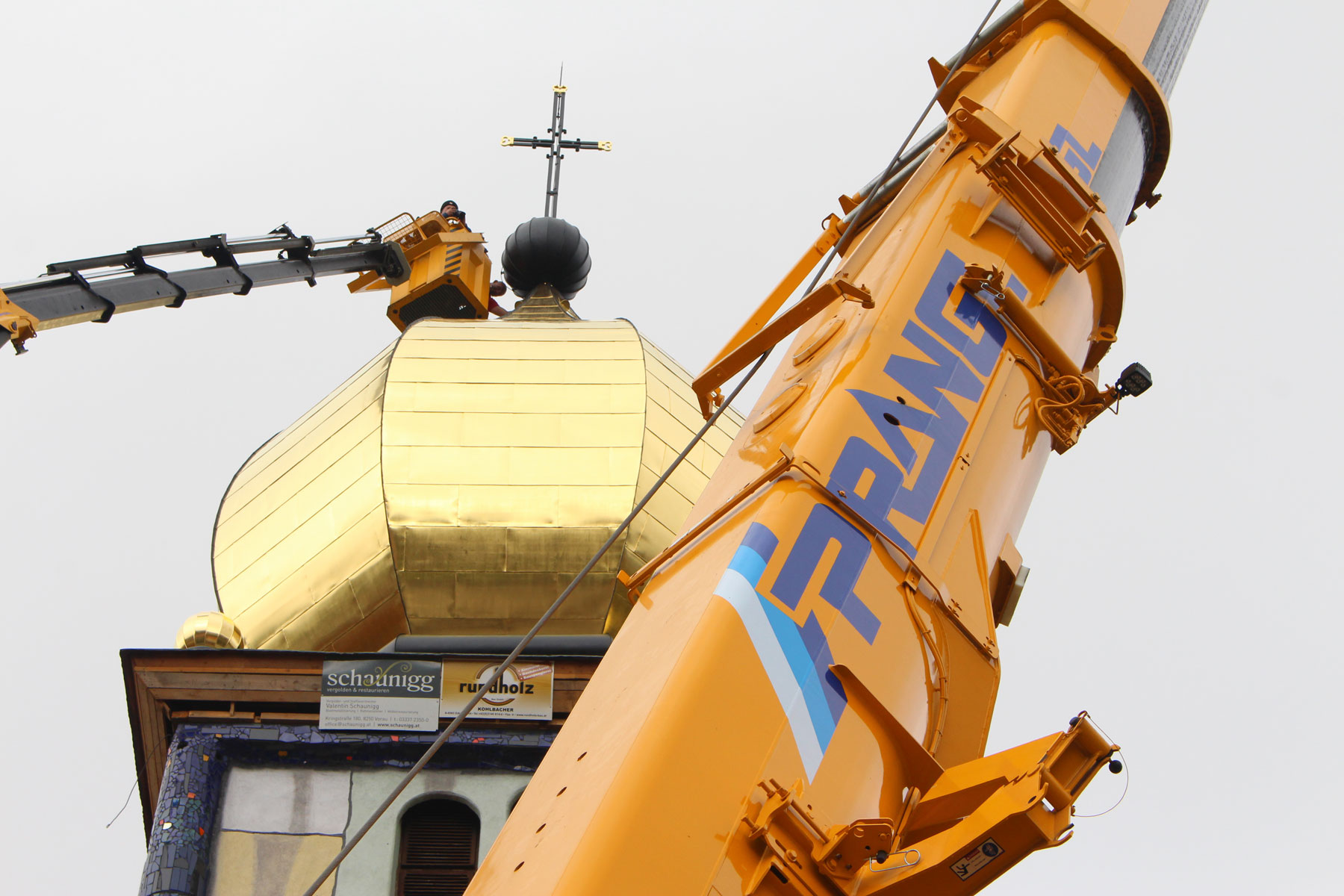 Mjesecima je poznata crkva u Bärnbachu bila podijeljena u dva dijela. Zbog renoviranja zlata na lukovičastoj kupoli, Hundertwasserova crkva bila je bez tornja, jer je kupola zbog radova bila obložena skelama. Na državni praznik zlatna lukovičasta glava konačno je vraćena na crkveni toranj. Pored restauracijskih radova i s time povezane nove pozlate, stručno i pažljivo podizanje odnosno repozicioniranje glave kupole predstavljalo je ključni izazov. Izbor za provedbu ovog zahtjevnog zadatka pala je na ekipu tvrtke Prangl.