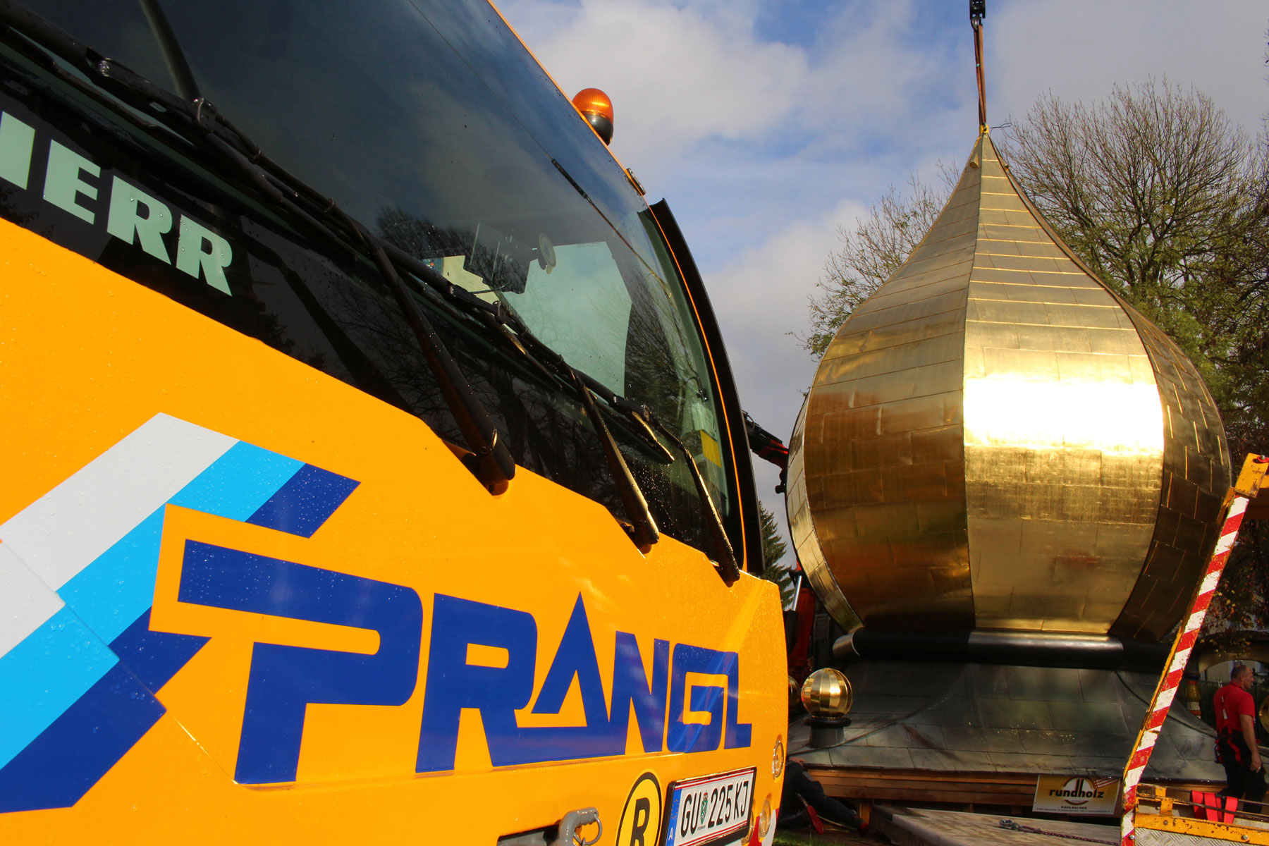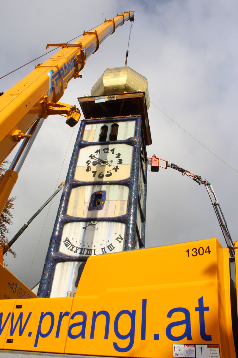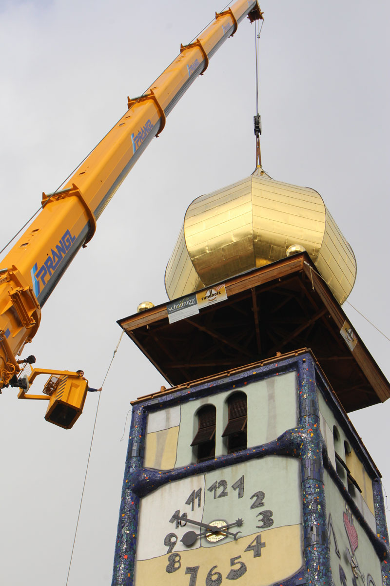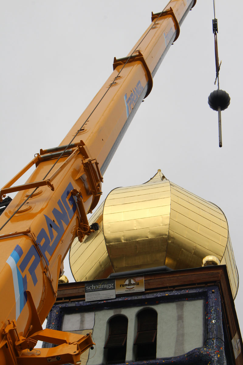 Mjesecima je poznata crkva u Bärnbachu bila podijeljena u dva dijela. Zbog renoviranja zlata na lukovičastoj kupoli, Hundertwasserova crkva bila je bez tornja, jer je kupola zbog radova bila obložena skelama. Na državni praznik zlatna lukovičasta glava konačno je vraćena na crkveni toranj. Pored restauracijskih radova i s time povezane nove pozlate, stručno i pažljivo podizanje odnosno repozicioniranje glave kupole predstavljalo je ključni izazov. Izbor za provedbu ovog zahtjevnog zadatka pala je na ekipu tvrtke Prangl.