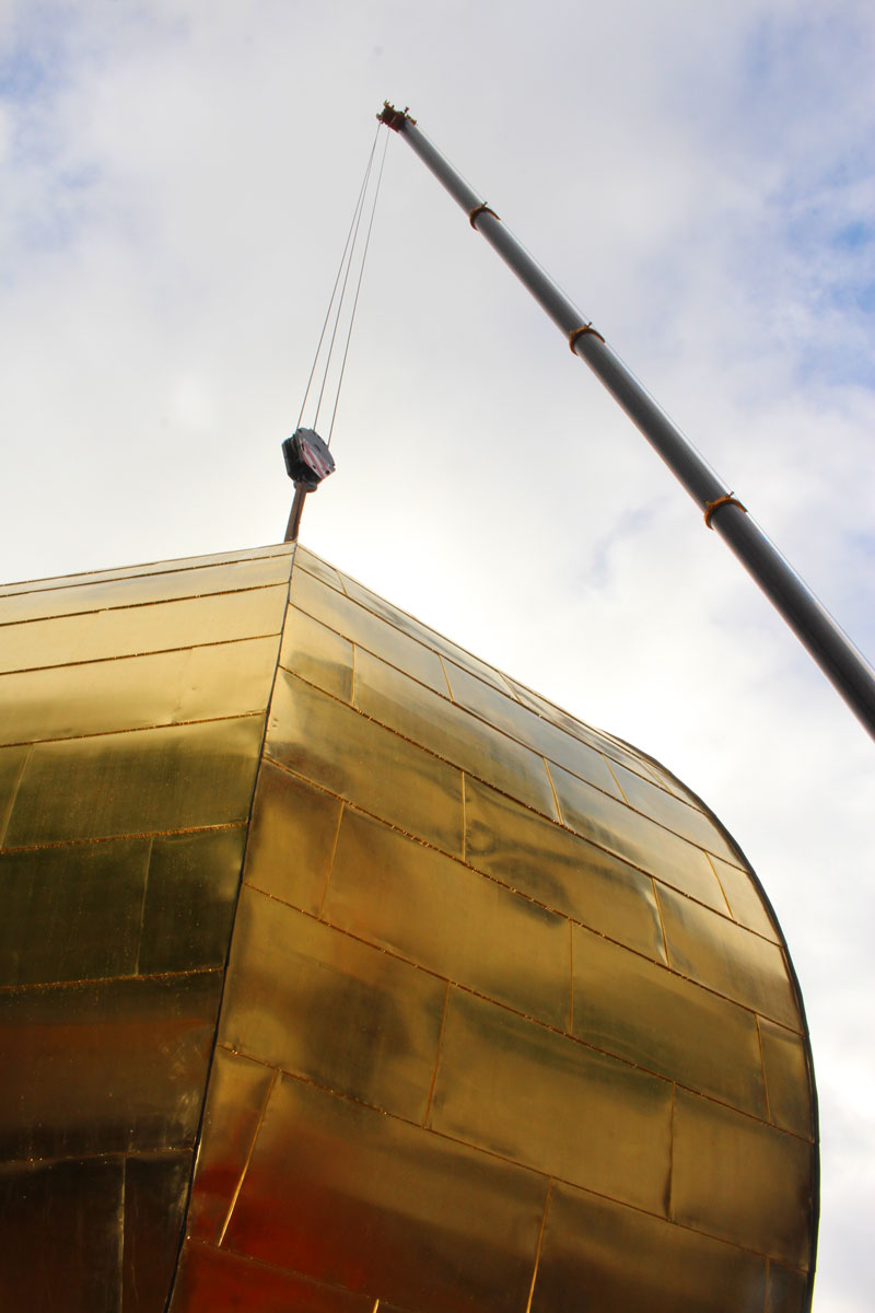 Vrlo značajna pri tom detaljnom tehničkom planiranju bila je i podrška nalogodavca. 1. lipnja 2016. skoro devet tona teška zlatna lukovičasta glava kupole s crkvenog tornja pažljivo je spuštena na zemlju. To je učinjeno sa 100-tonskom teleskopskom dizalicom. Za podršku pri montažnim radovima pored toga upotrjebljena je dizalica od 100 metričkih tona s košarom za osoblje. Sljedećih pet mjeseci odvijali su se restauracijski radovi odnosno izvođena je nova pozlata vrha zvonika, pri čemu je prvo podignuto kućište, a nakon toga pedantnim radom naneseno je oko 15.000 listića duple pozlate.