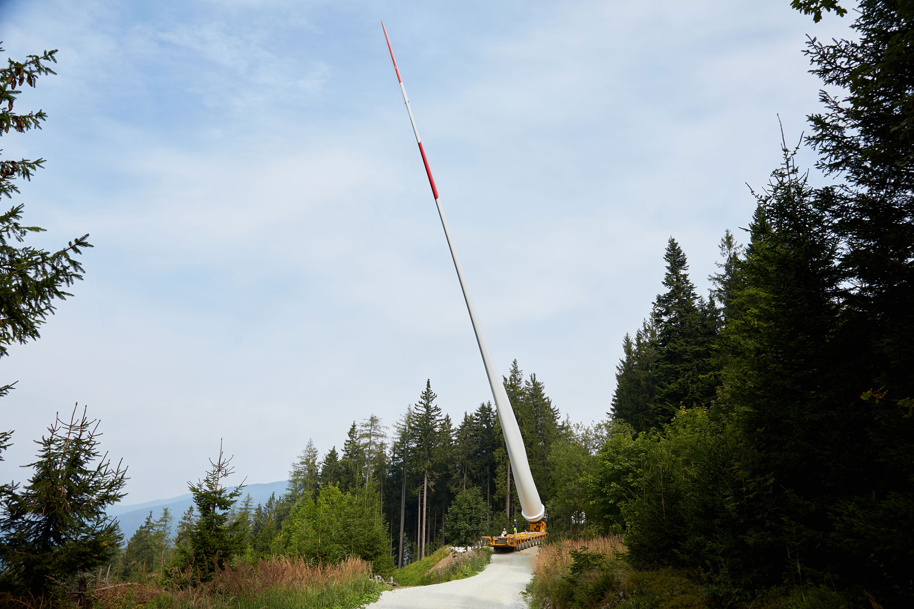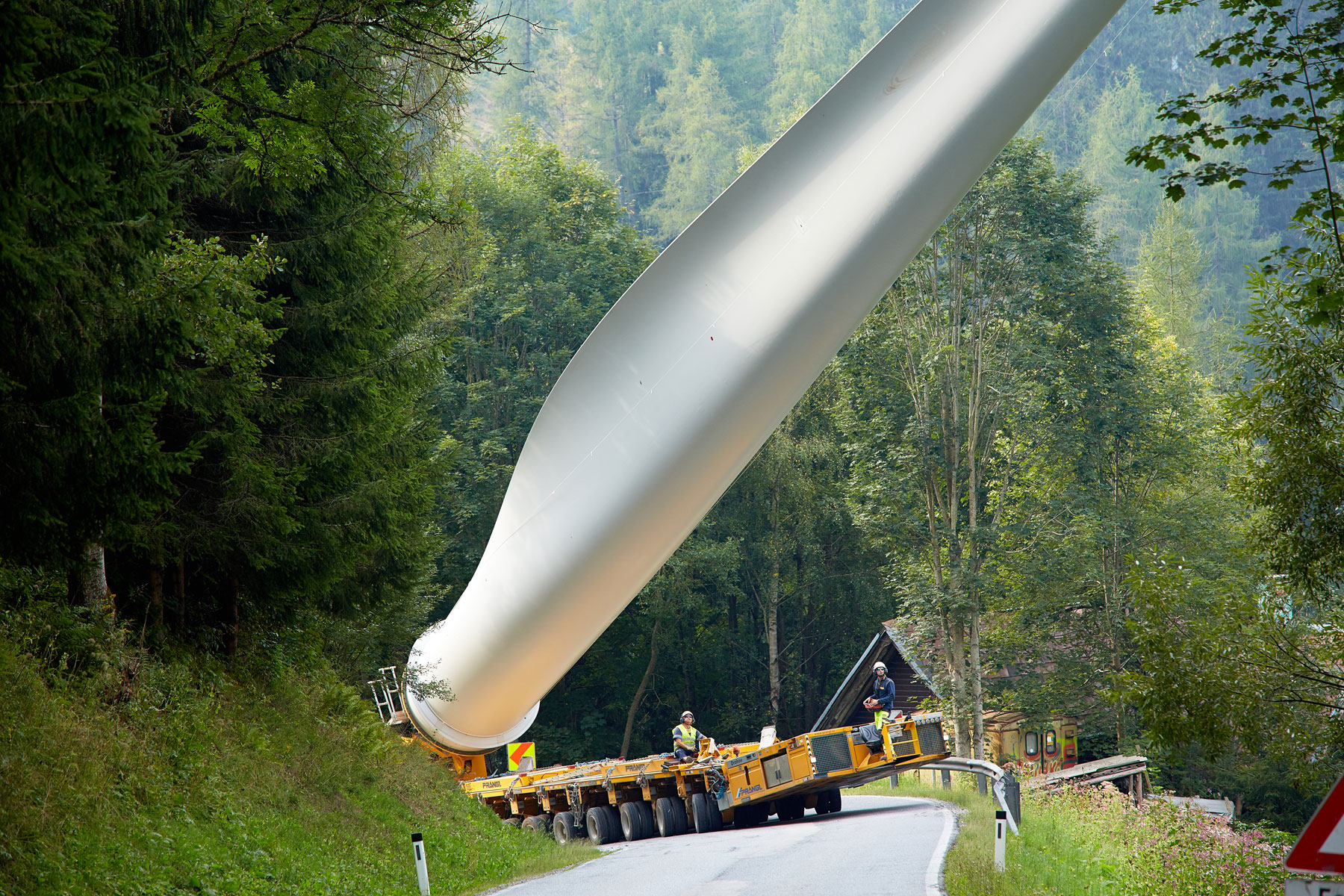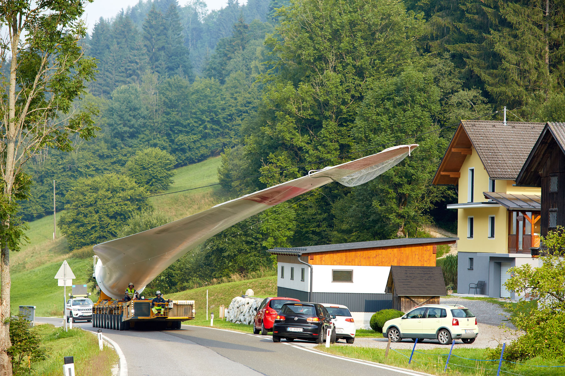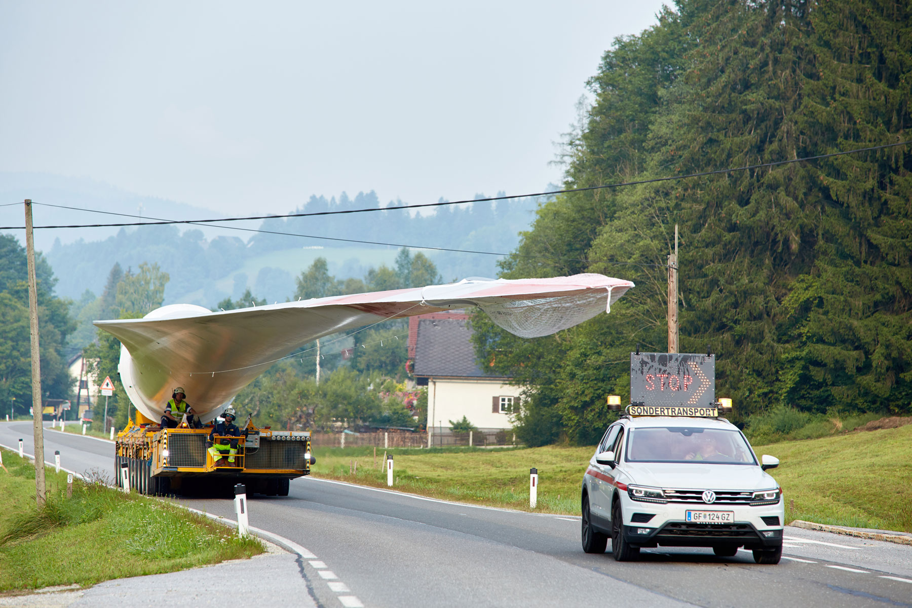 Prijevoznici teških tereta su iz Danske u Austriju prevezli građevine strojeva (neto težina 65,0 tona), glavčine (neto težina 31,5 tona), pogonski vlak (61,0 tona neto težine) i lopatice rotora (neto težine 14,7 tona). Segmenti tornja stigli su iz Njemačke. Najteže i najveće dijelove trebalo u unutrašnjosti dopremiti riječnim brodom. Nakon pretovara u luci grada Enns, koji je također izvršila tvrtka Prangl, čelični dijelovi s maksimalnom težinom od 87,0 tona mogli su nastaviti svoj put. Čelični segmenti imali su duljine do 30,0 metara.