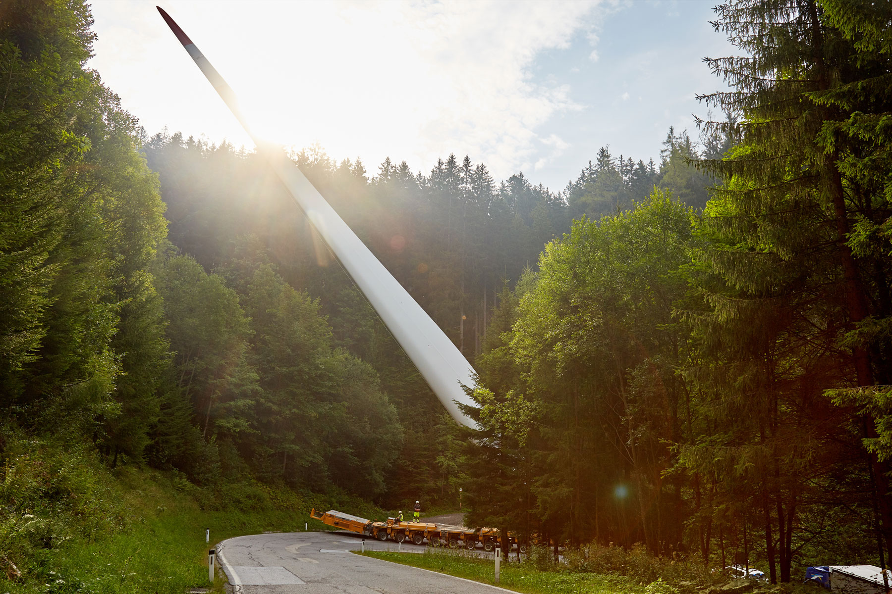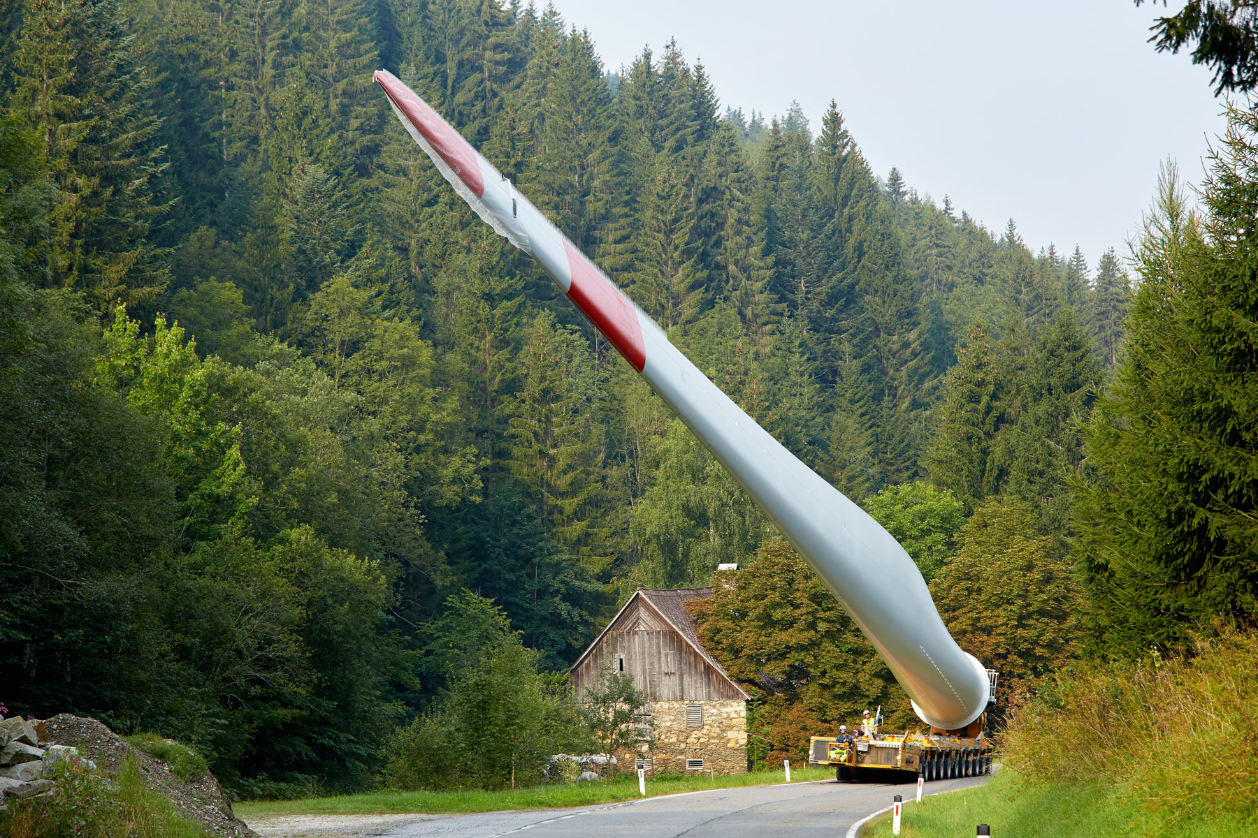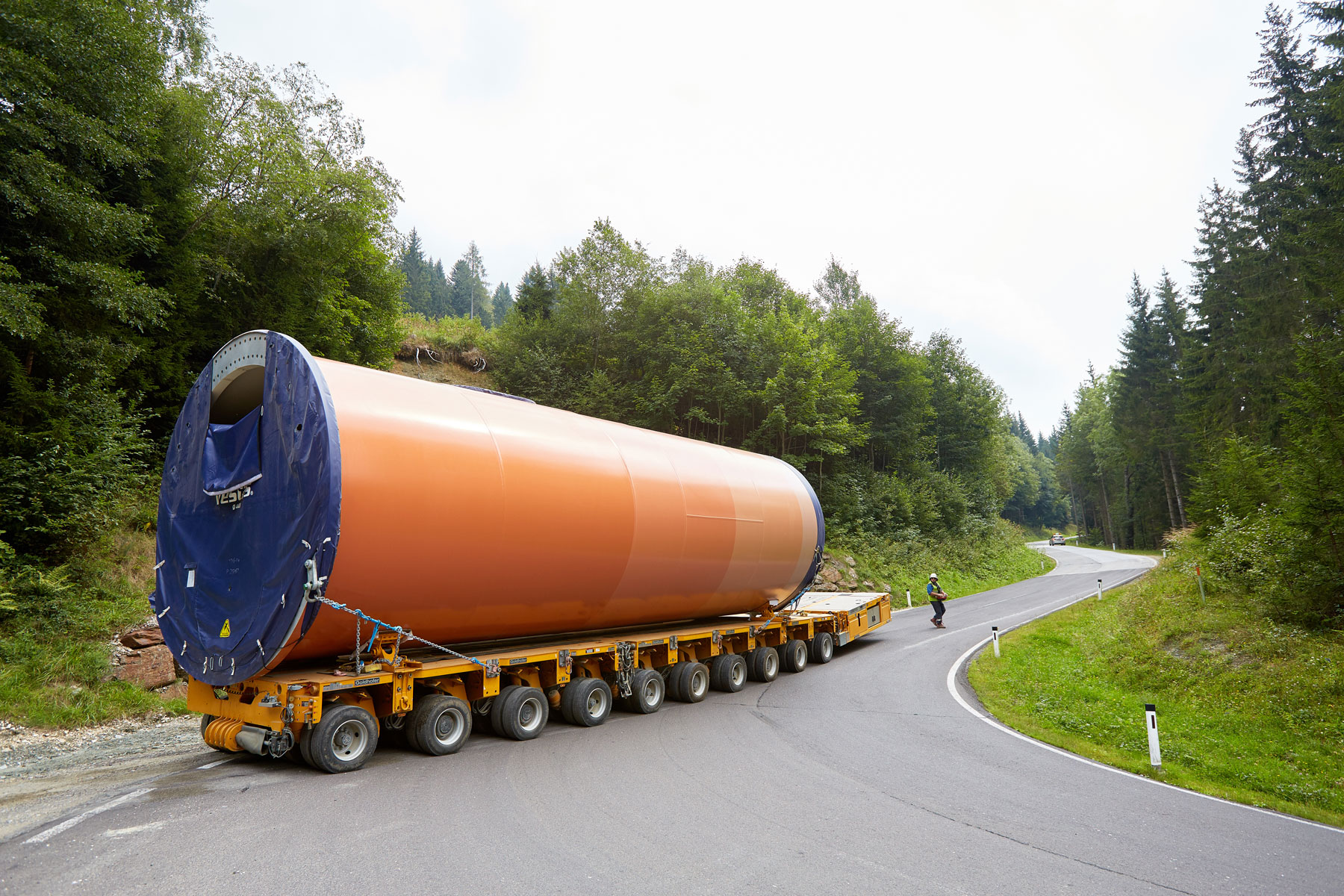 Prijevoznici teških tereta su iz Danske u Austriju prevezli građevine strojeva (neto težina 65,0 tona), glavčine (neto težina 31,5 tona), pogonski vlak (61,0 tona neto težine) i lopatice rotora (neto težine 14,7 tona). Segmenti tornja stigli su iz Njemačke. Najteže i najveće dijelove trebalo u unutrašnjosti dopremiti riječnim brodom. Nakon pretovara u luci grada Enns, koji je također izvršila tvrtka Prangl, čelični dijelovi s maksimalnom težinom od 87,0 tona mogli su nastaviti svoj put. Čelični segmenti imali su duljine do 30,0 metara.
