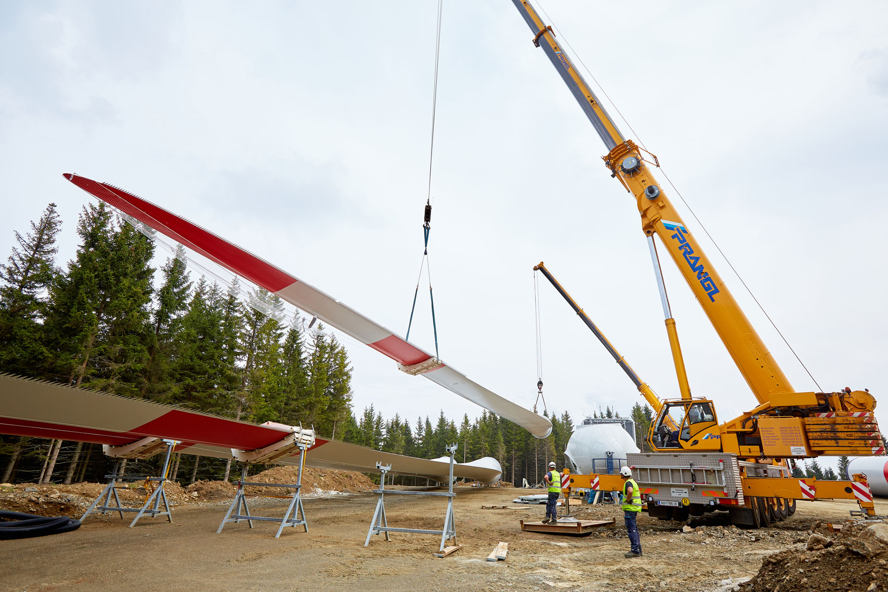 Budući da je bilo na raspolaganju malo prostora, dijelovi sustava mogli su se privremeno skladištiti samo na parkirnim mjestima za dizalice. Stoga su se komponente morale isporučiti točno na vrijeme. To je zauzvrat zahtijevalo optimalnu logističku koordinaciju između svih članova tima tvrtke Prangl. Vjetroturbine su bile iskrcane na planini i postavljene pomoću dizalice na gusjenicama koja teži 650 tona i teleskopske dizalice koja teži 200 tona. Za primjenu tijekom postavljanja vjetroturbina koristili smo dodatne transportne jedinice.