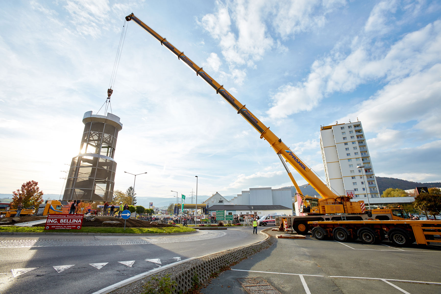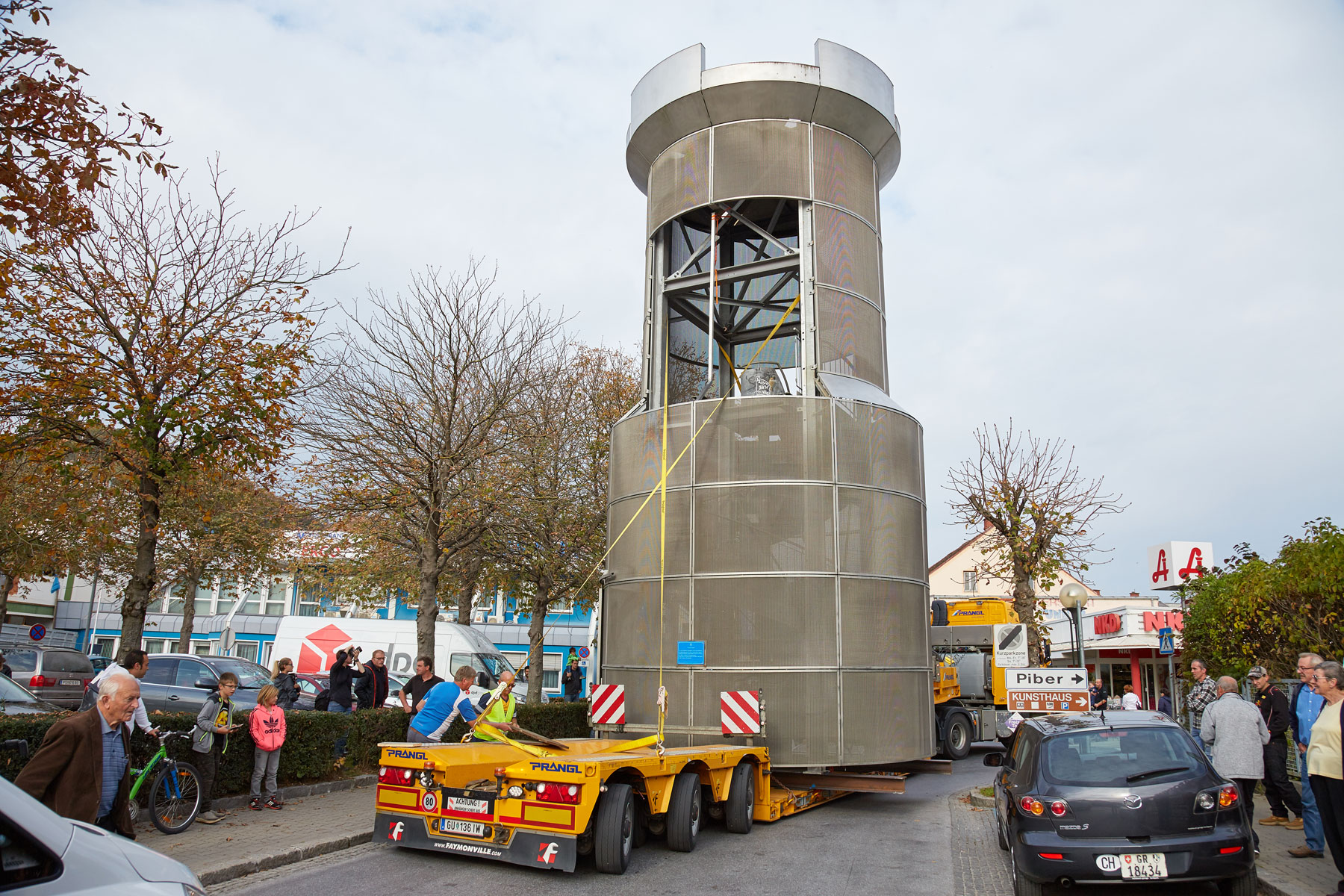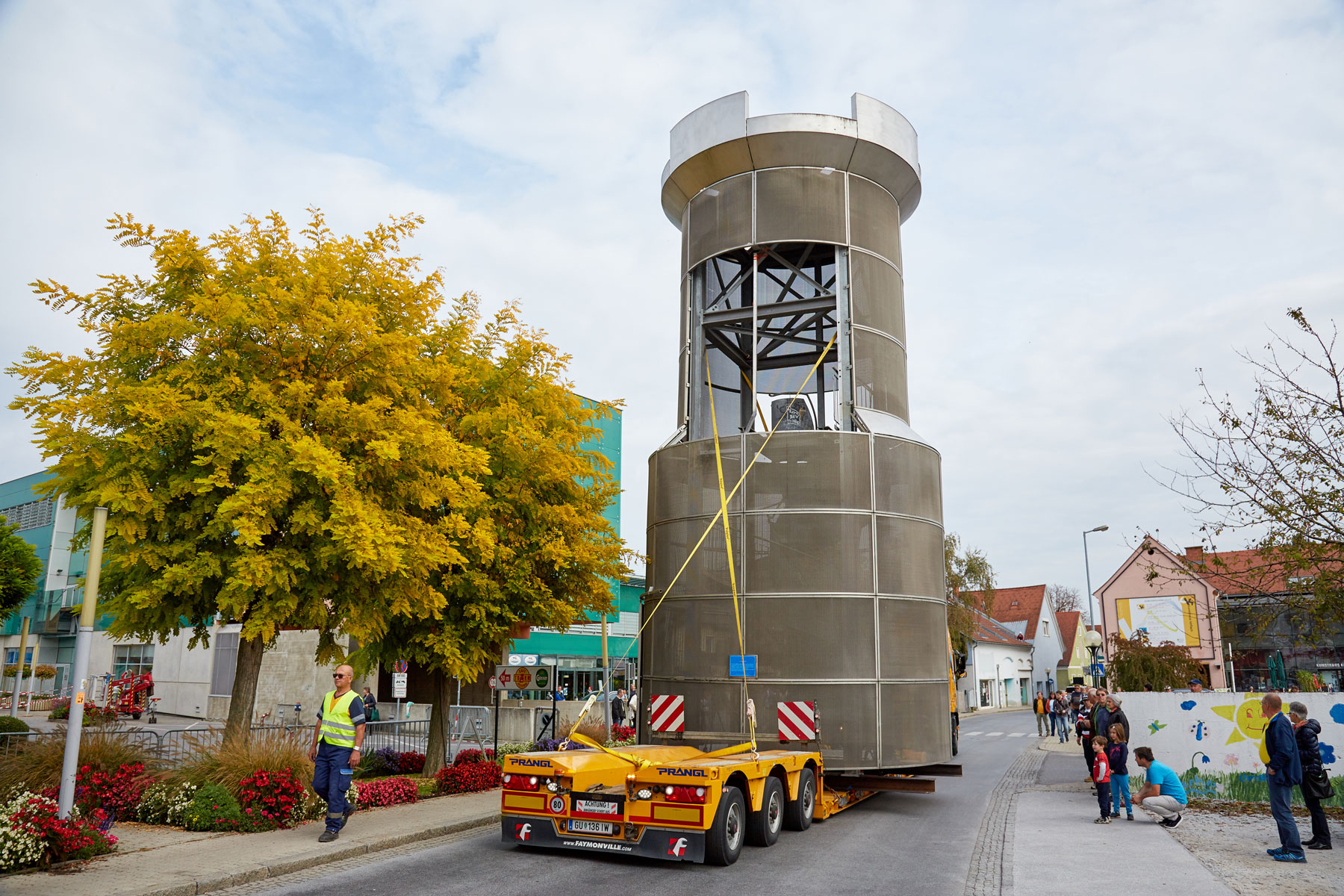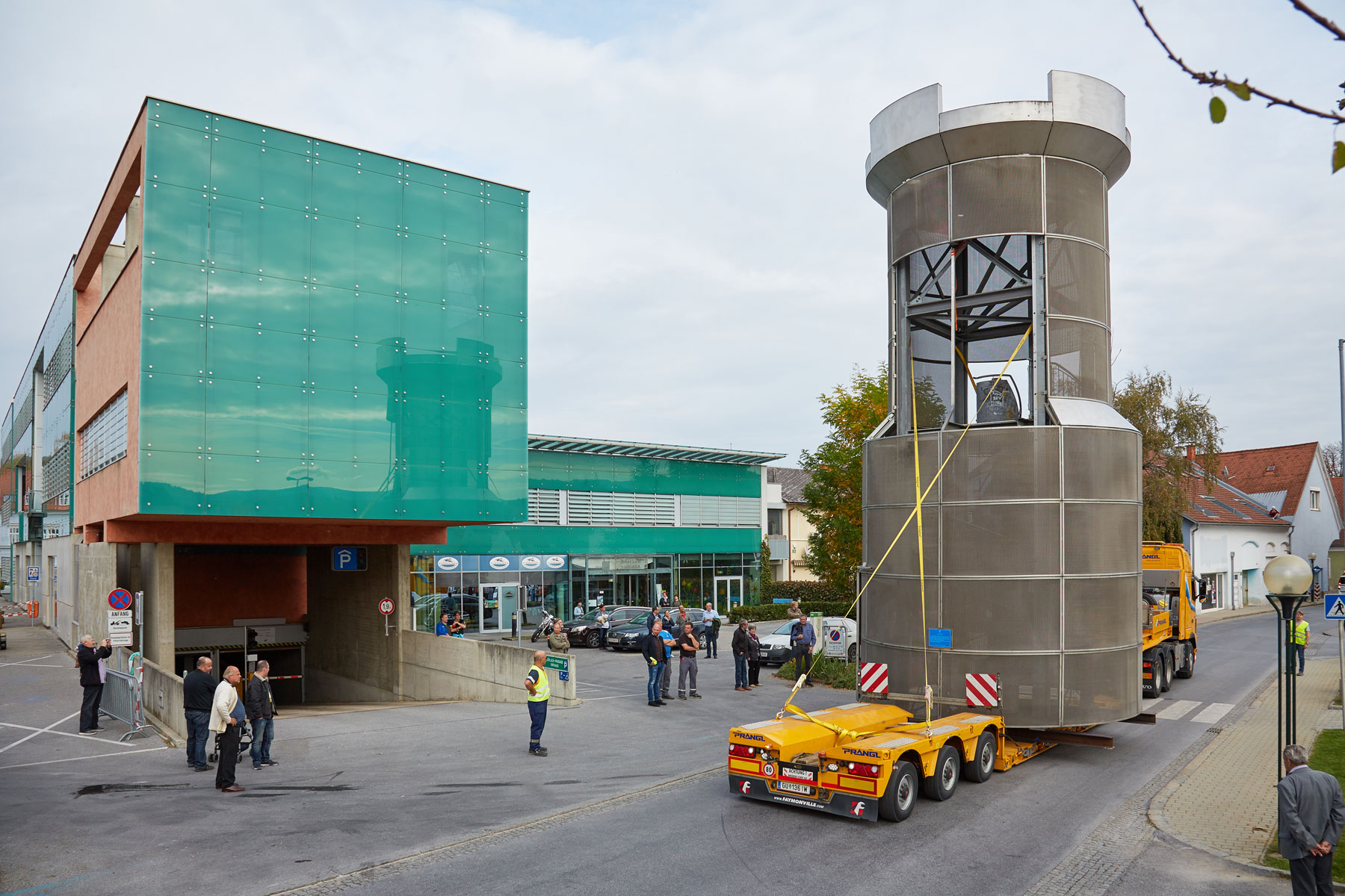 Puno je promatrača pratilo toranj na putu do njegovog novog, reprezentativnog mjesta. Uz velik interes medija i prolaznika nova znamenitost u Köflachu uspješno i sigurno je podignuta na sredinu kružnog toka s pomoću teleskopske dizalice koja teži 200 tona. Tako su još jednom prezentirane sve prednosti koje omogućuje naručivanje besprijekornih usluga pri tvrtki Prangl.