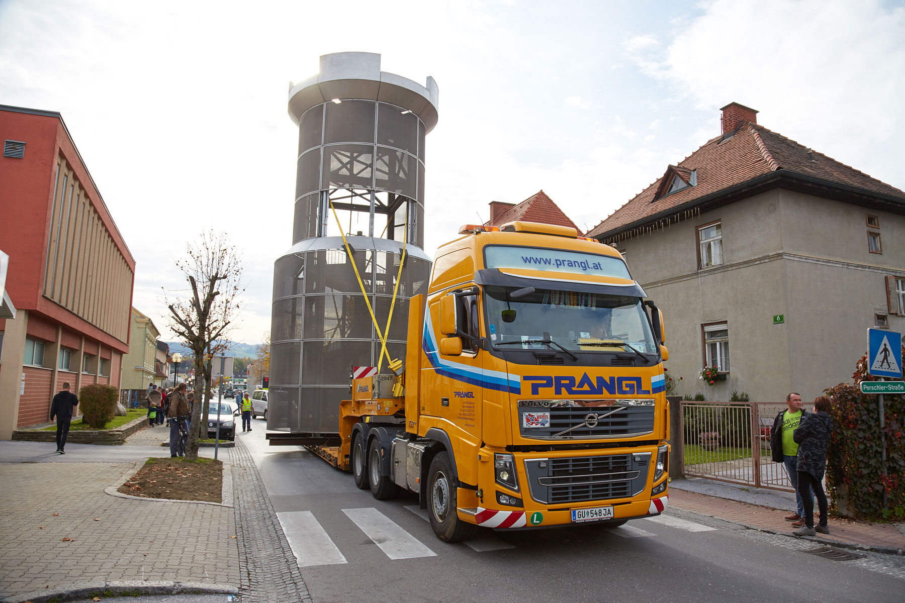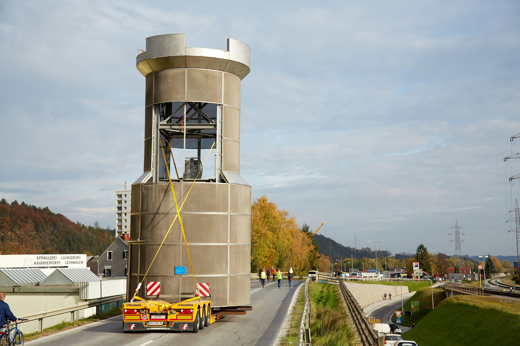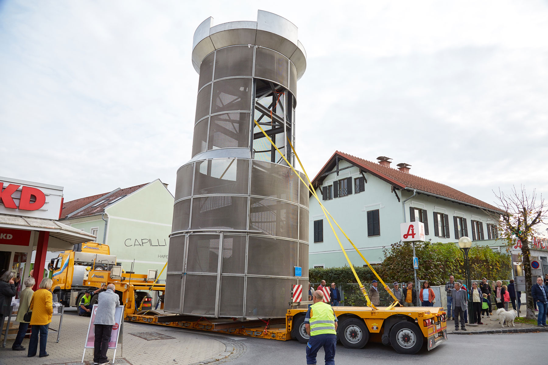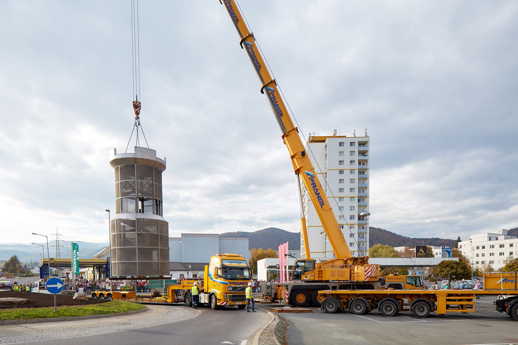 Puno je promatrača pratilo toranj na putu do njegovog novog, reprezentativnog mjesta. Uz velik interes medija i prolaznika nova znamenitost u Köflachu uspješno i sigurno je podignuta na sredinu kružnog toka s pomoću teleskopske dizalice koja teži 200 tona. Tako su još jednom prezentirane sve prednosti koje omogućuje naručivanje besprijekornih usluga pri tvrtki Prangl.