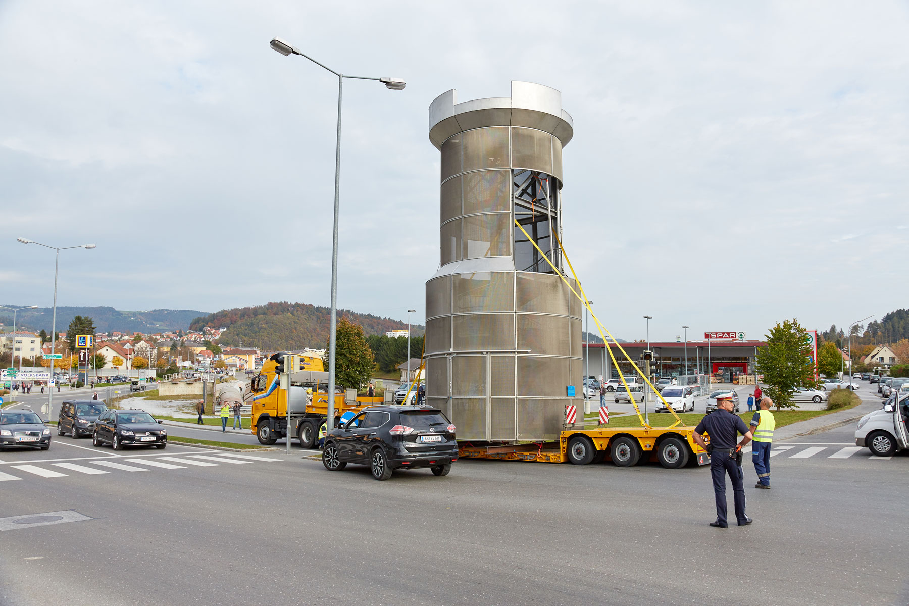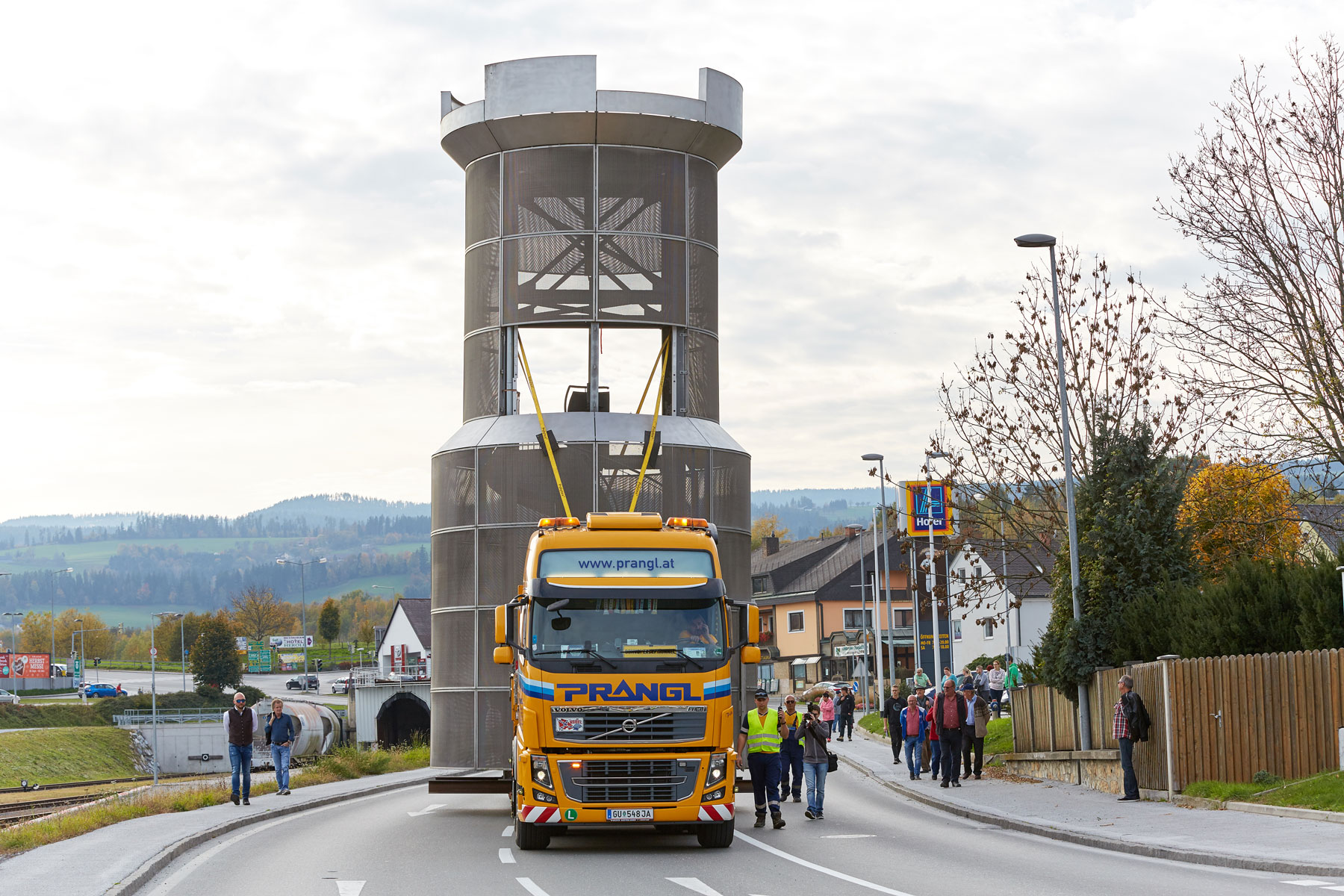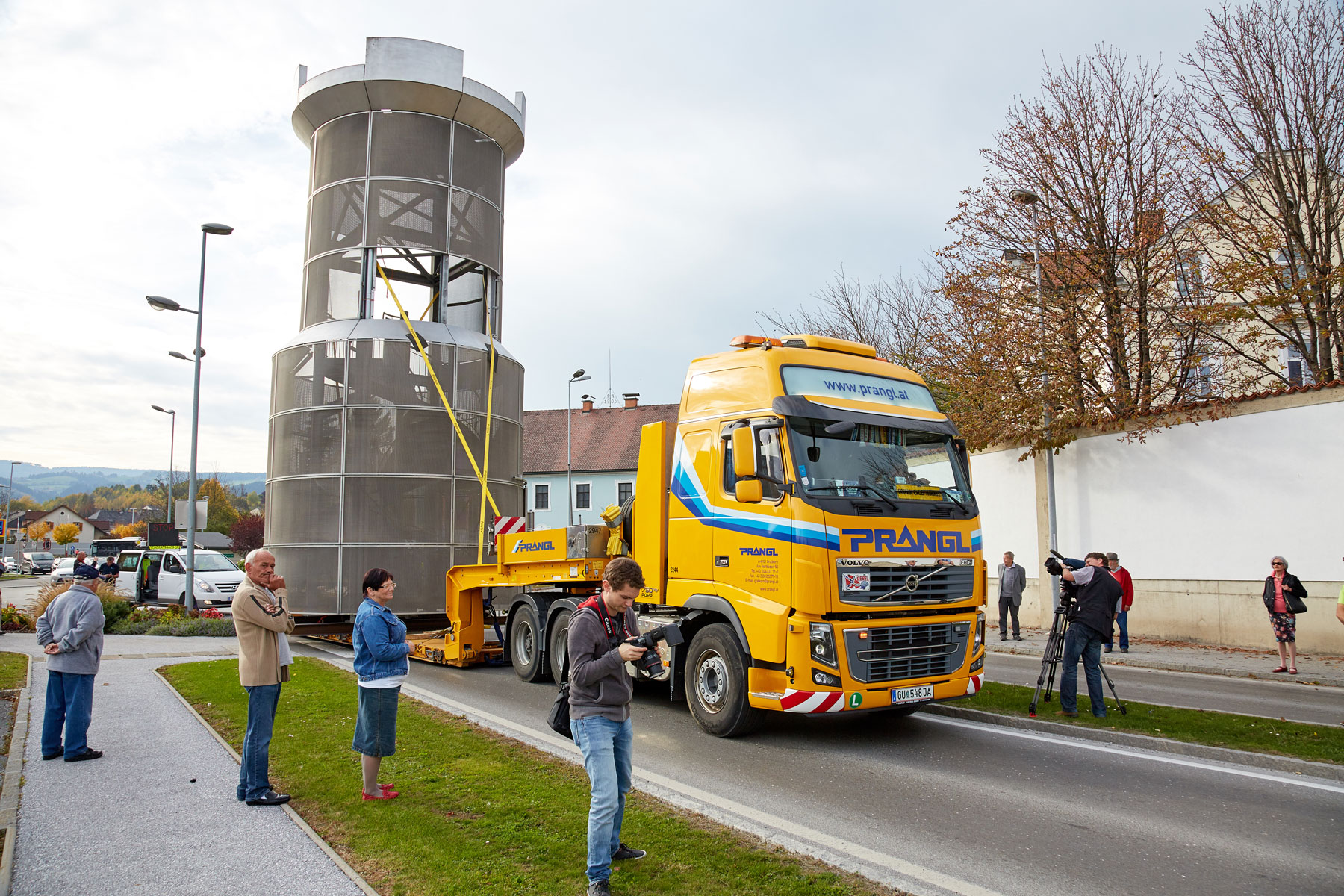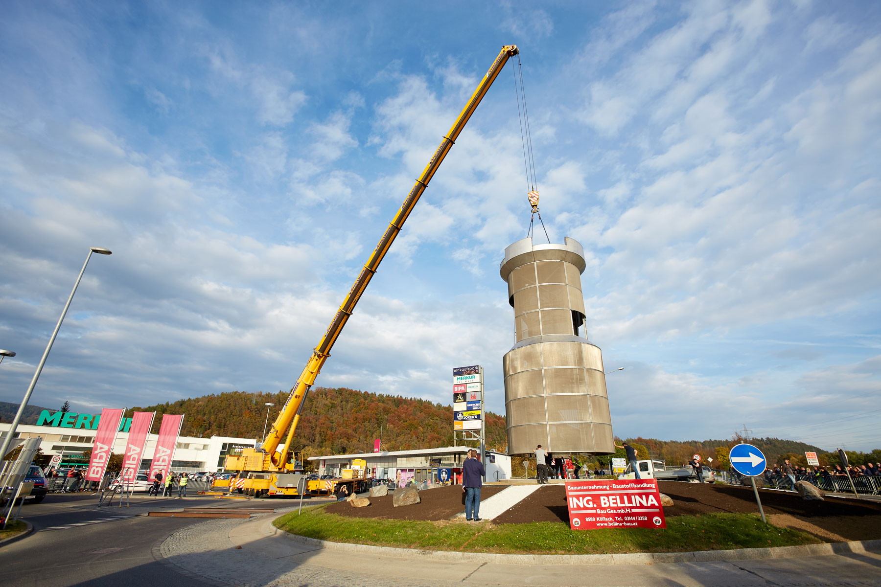 Puno je promatrača pratilo toranj na putu do njegovog novog, reprezentativnog mjesta. Uz velik interes medija i prolaznika nova znamenitost u Köflachu uspješno i sigurno je podignuta na sredinu kružnog toka s pomoću teleskopske dizalice koja teži 200 tona. Tako su još jednom prezentirane sve prednosti koje omogućuje naručivanje besprijekornih usluga pri tvrtki Prangl.