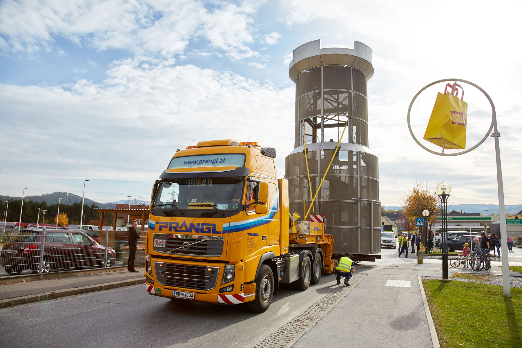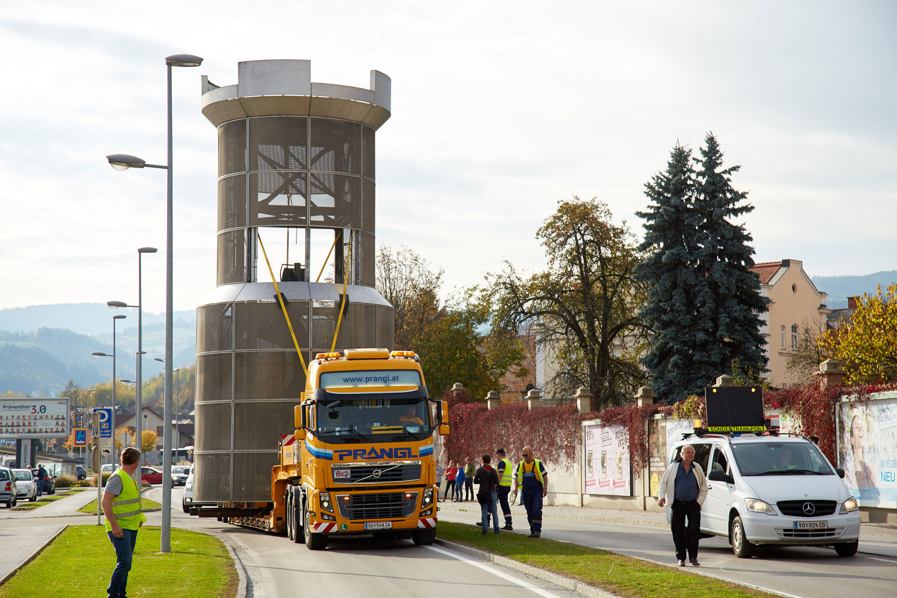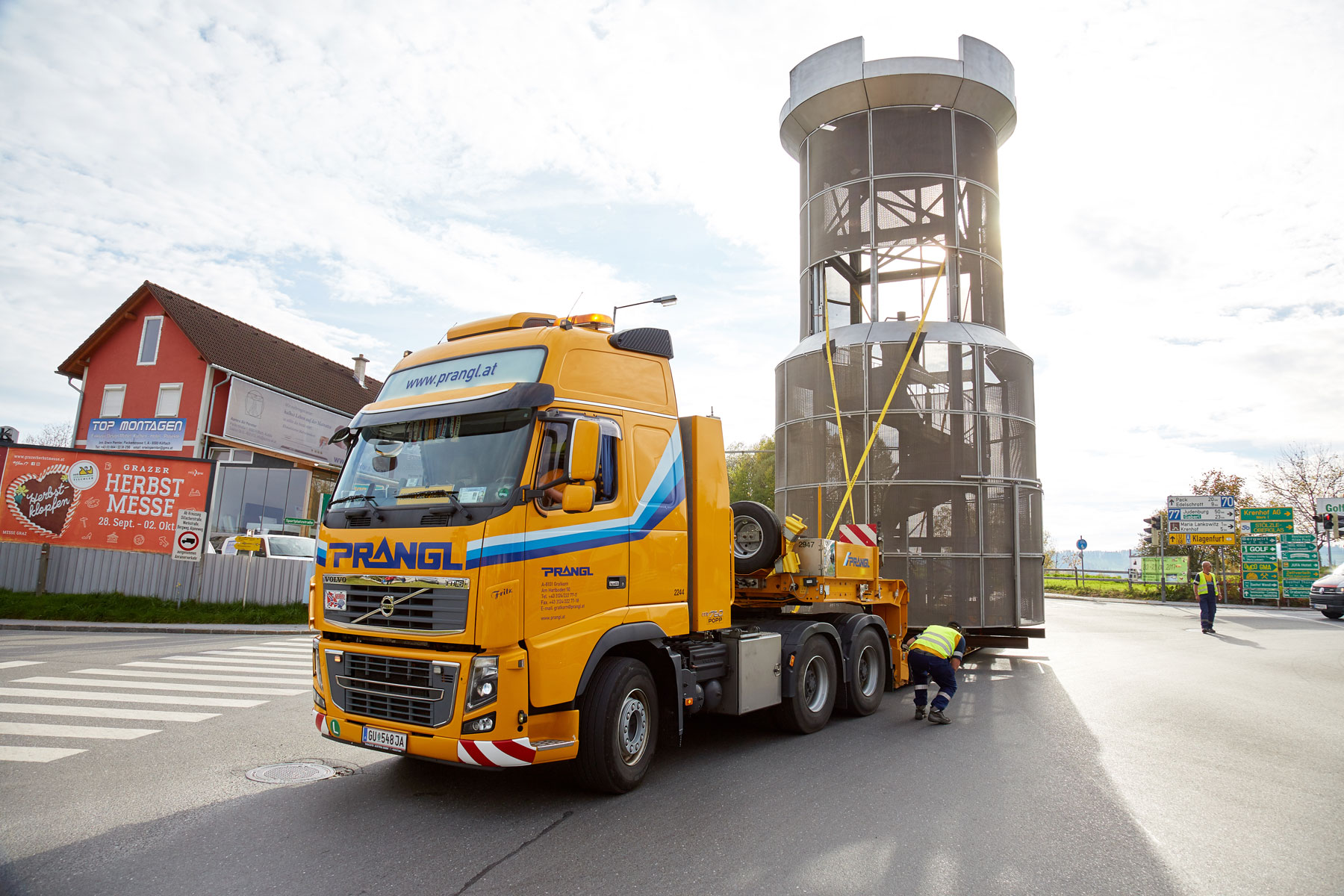 Štajerska općina Köflach dobila je novu znamenitost. Gradski toranj koji je dosad bio postavljen pored gradske vijećnice, sada je premješten na sredinu kružnog toka na cesti B70. Sve radove posebnog prijevoza i podizanja ekskluzivno je obavljala tvrtka Prangl.