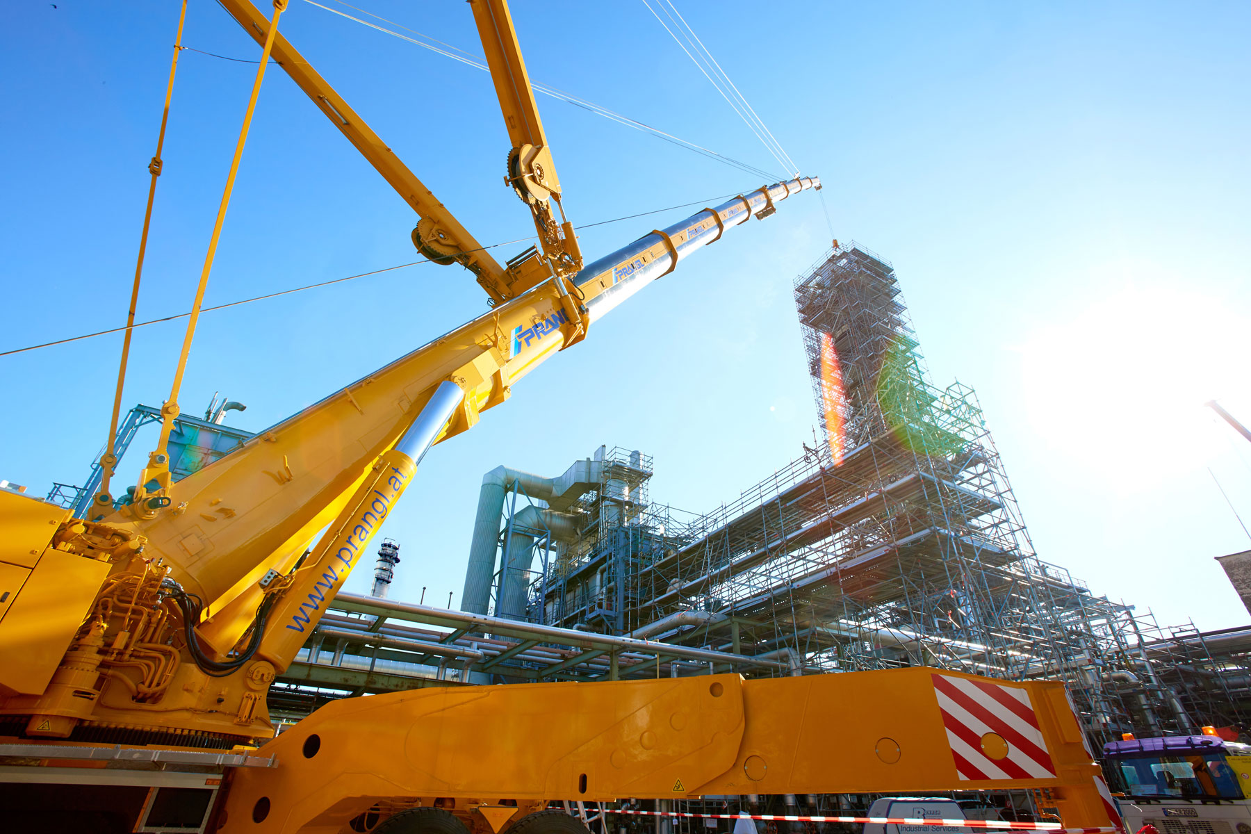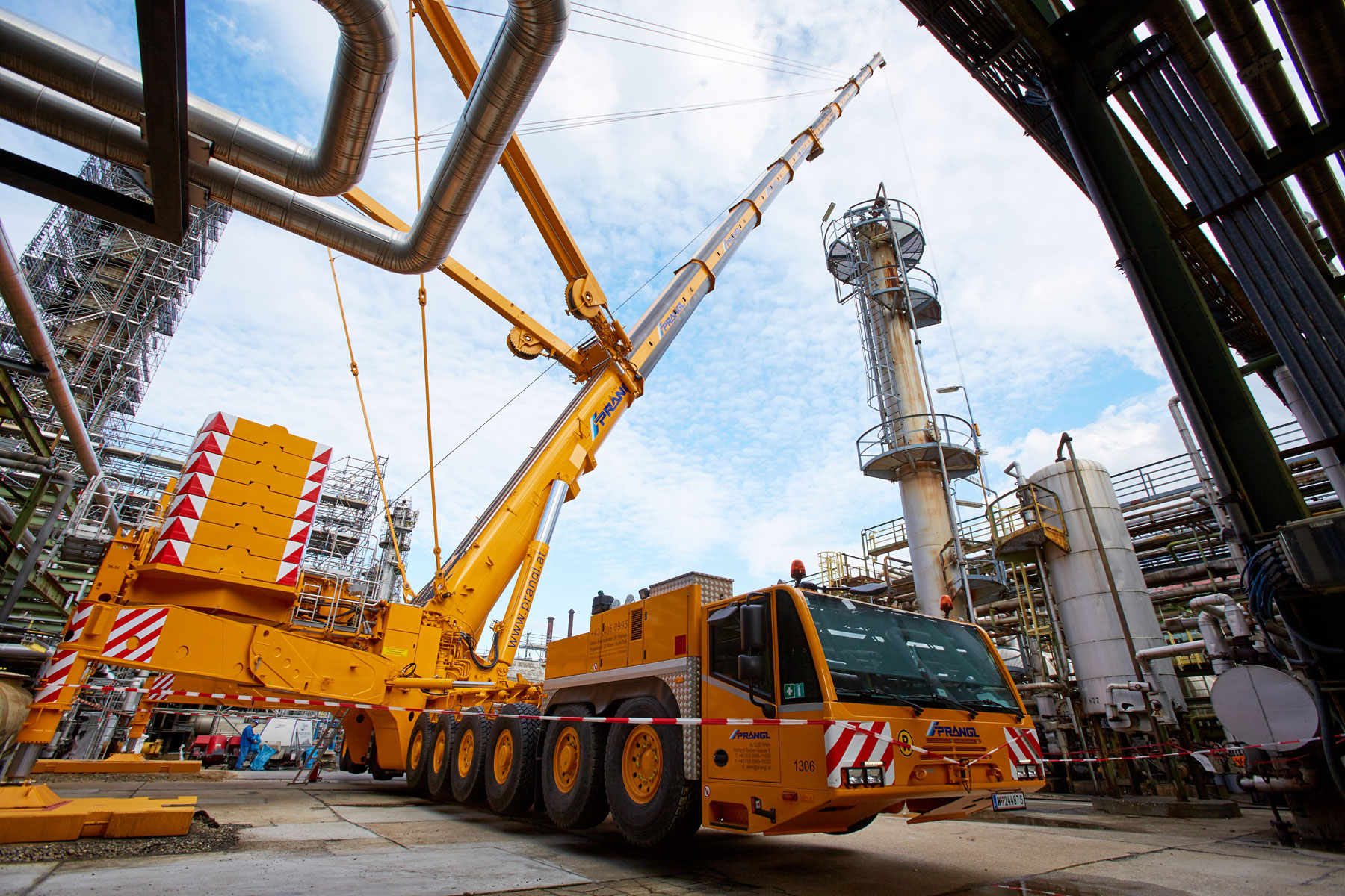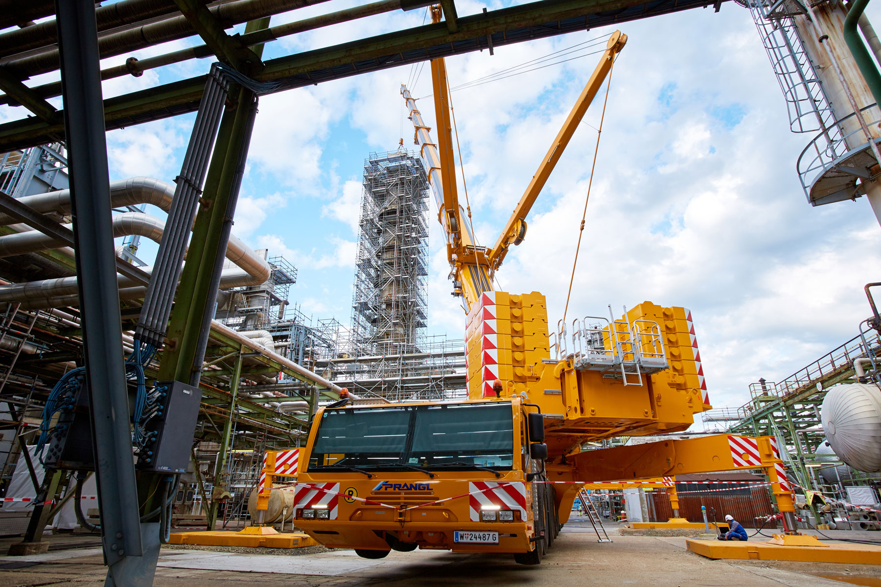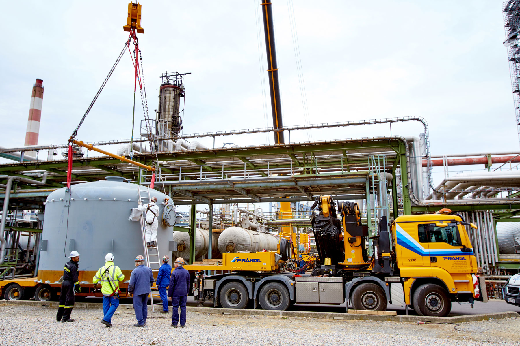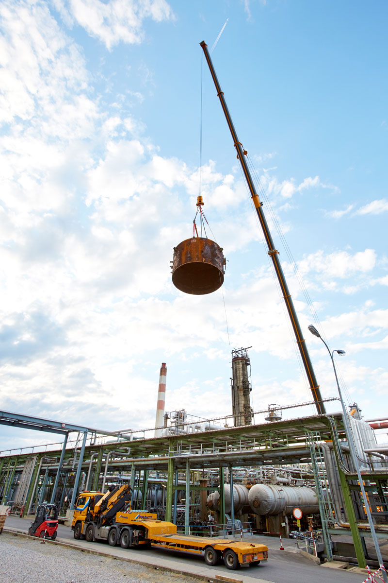 I u tvrtki Prangl svaki je potez bio isplaniran do posljednjeg detalja jer su radovi izvođeni u ograničenom prostoru i pod velikim vremenskim pritiskom. Jednako pedantno odabrani su i uređaji za tu veliku narudžbu: Stručnjaci tvrtke Prangl na radilištu su se iskazali s ukupno 45 teleskopskih dizalica, 11 utovarnih dizalica, 25 viličara i teleskopskih viličara, tri tegljača i 50 metara visokim radnim platformama za kamione. Srce cjelokupne generalne inspekcije za 2017. godinu sigurno je bila teleskopska dizalica koja teži 1000 tona i najveća je u Austriji. Upotrijebljena je tijekom zamjene vrha stupa u postrojenju „HDS 3 Splitter“ zbog svog neusporedivog lateralnog raspona.
