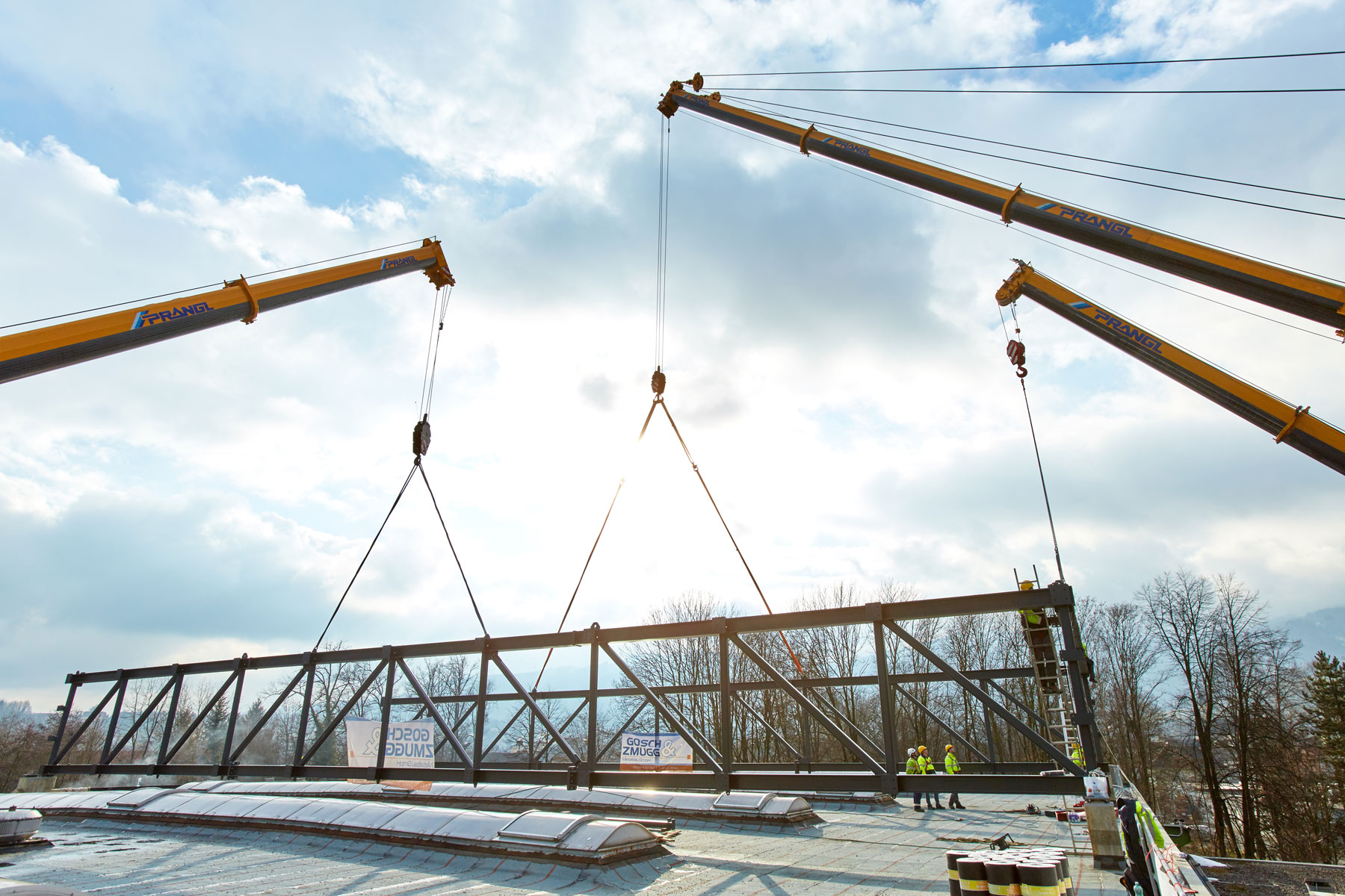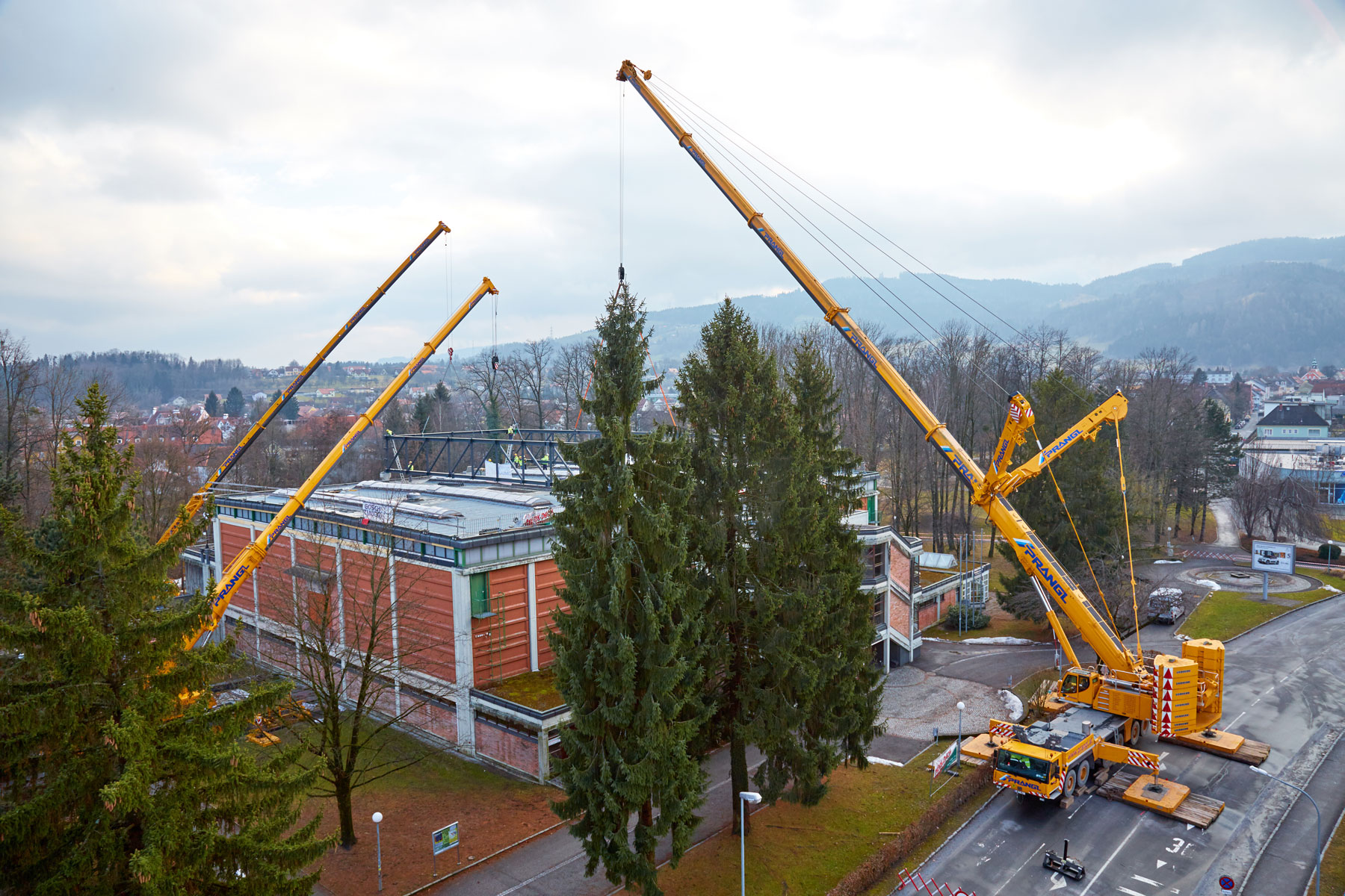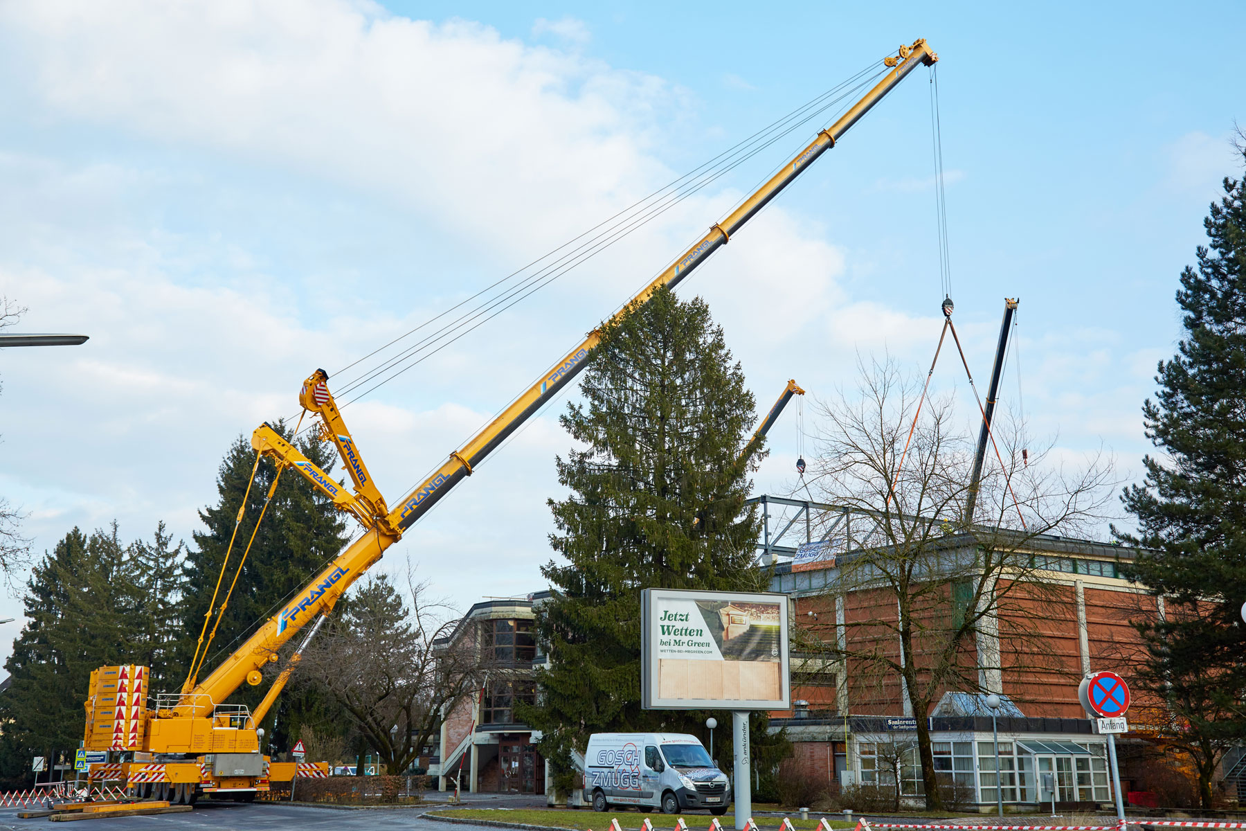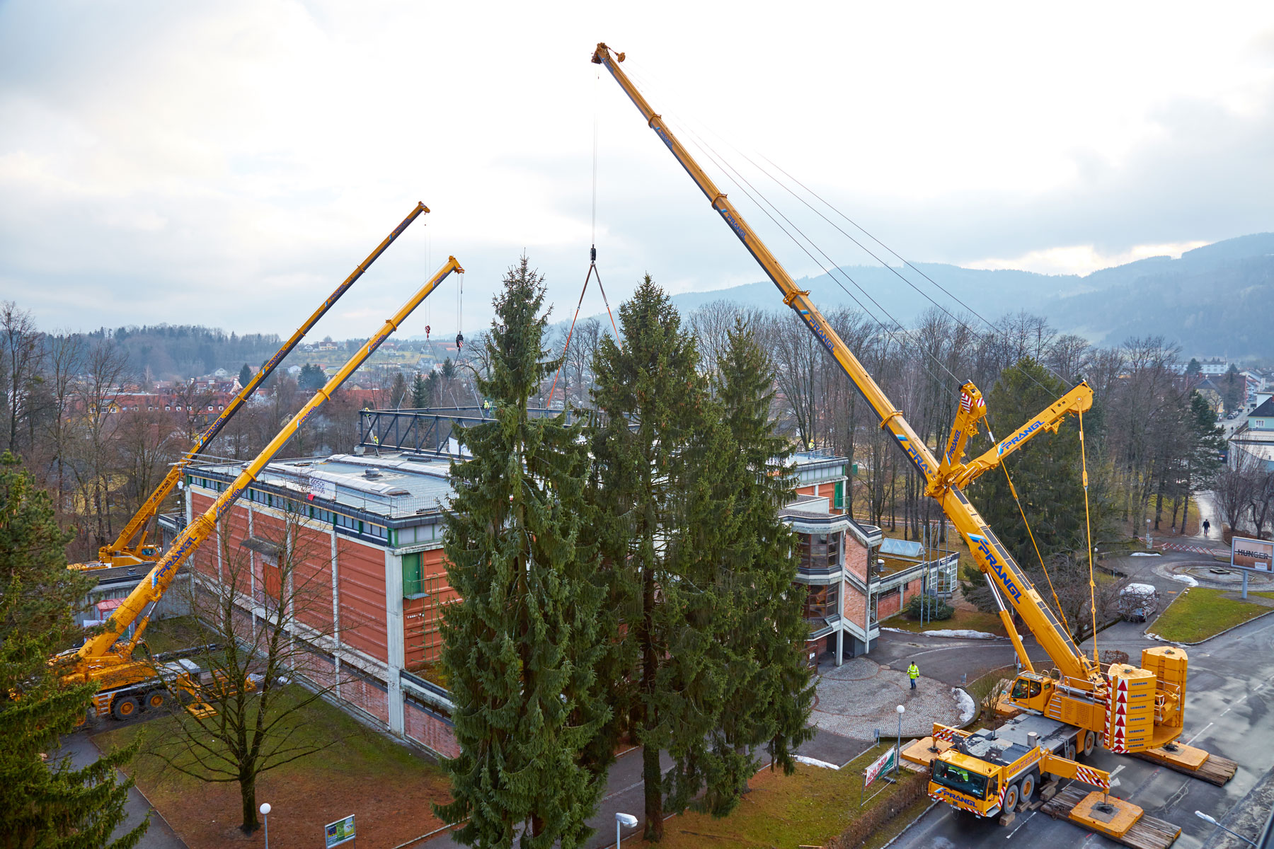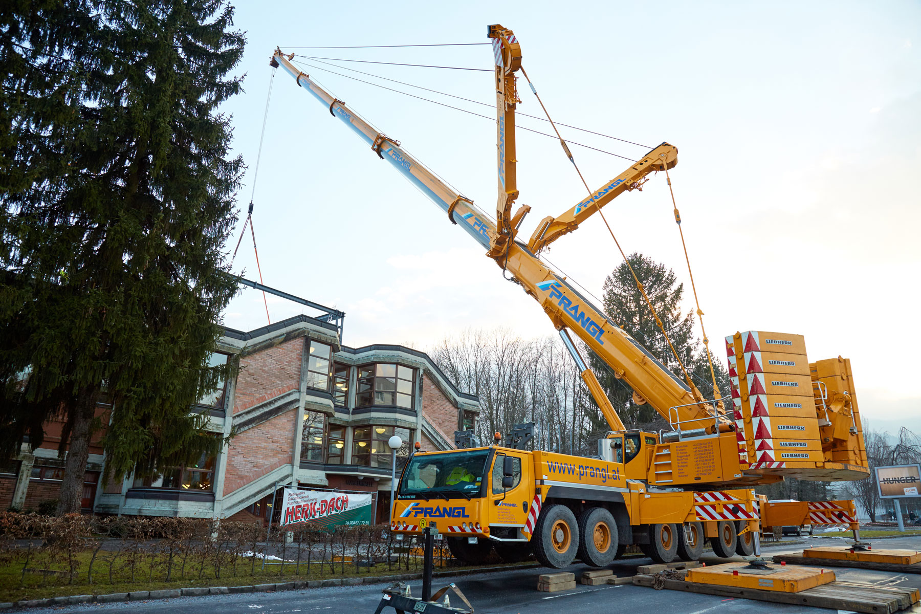 Kako bi osigurali što jednostavniju logistiku podizanja, metalni dijelovi su pripremljeni za podizanje na parkiralištu koje se nalazi preko puta dvorane, a onda su s pomoću mobilne dizalice koja teži 350 tona podignuti na armiranobetonske stupove dvorane Koralmhalle. Akcija se odvijala dva dana. Cjelokupno podizanje podržavale su još teleskopske dizalice od 55 i 70 tona. Još jednom je uhodani tim tvrtke Prangl posao obavio na potpuno zadovoljstvo stranke i krajnjeg korisnika, općine Deutschlandsberg.