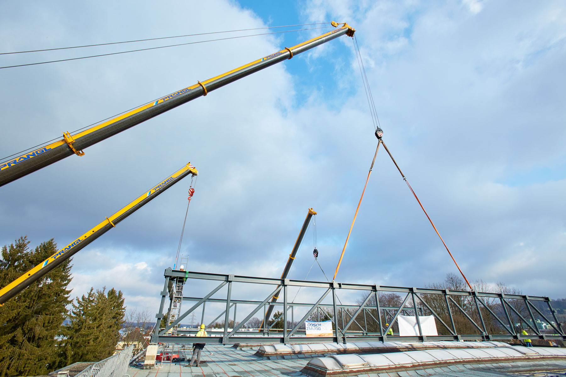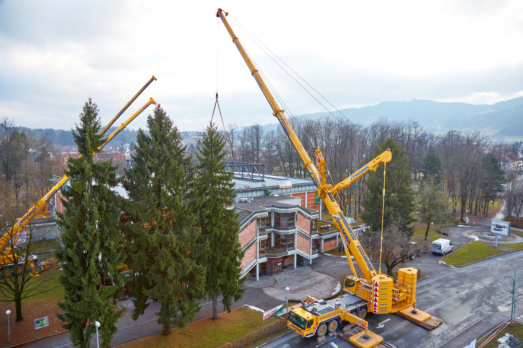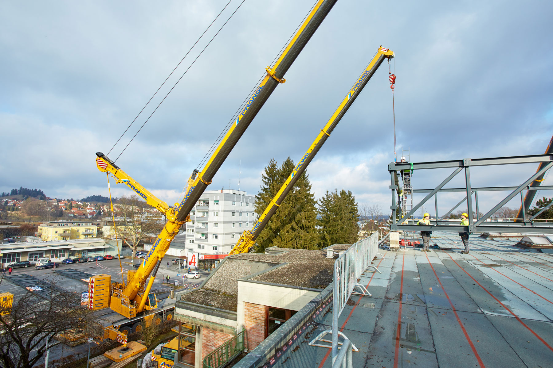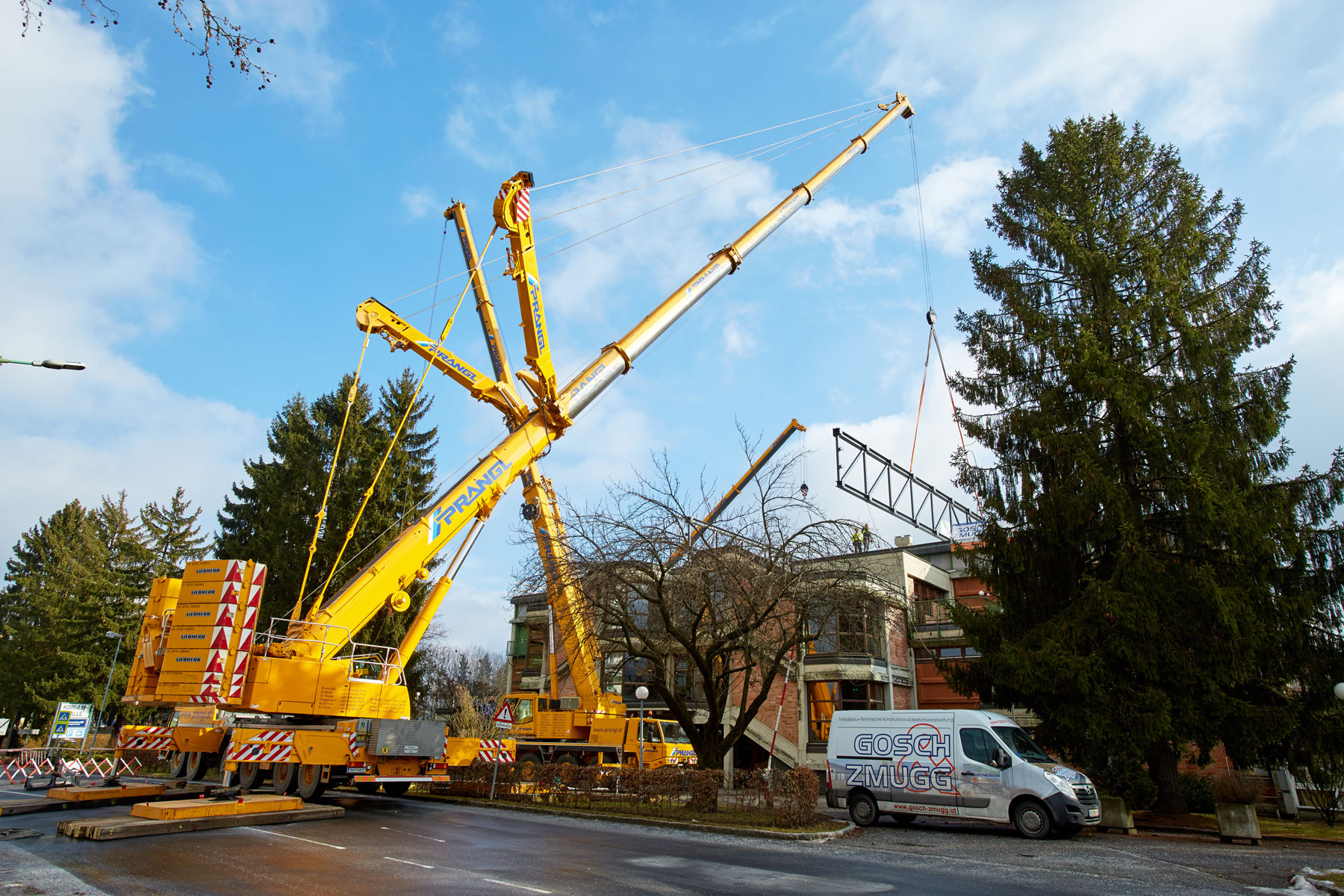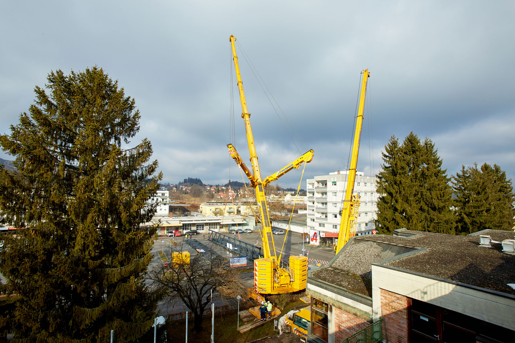 Kako bi osigurali što jednostavniju logistiku podizanja, metalni dijelovi su pripremljeni za podizanje na parkiralištu koje se nalazi preko puta dvorane, a onda su s pomoću mobilne dizalice koja teži 350 tona podignuti na armiranobetonske stupove dvorane Koralmhalle. Akcija se odvijala dva dana. Cjelokupno podizanje podržavale su još teleskopske dizalice od 55 i 70 tona. Još jednom je uhodani tim tvrtke Prangl posao obavio na potpuno zadovoljstvo stranke i krajnjeg korisnika, općine Deutschlandsberg.