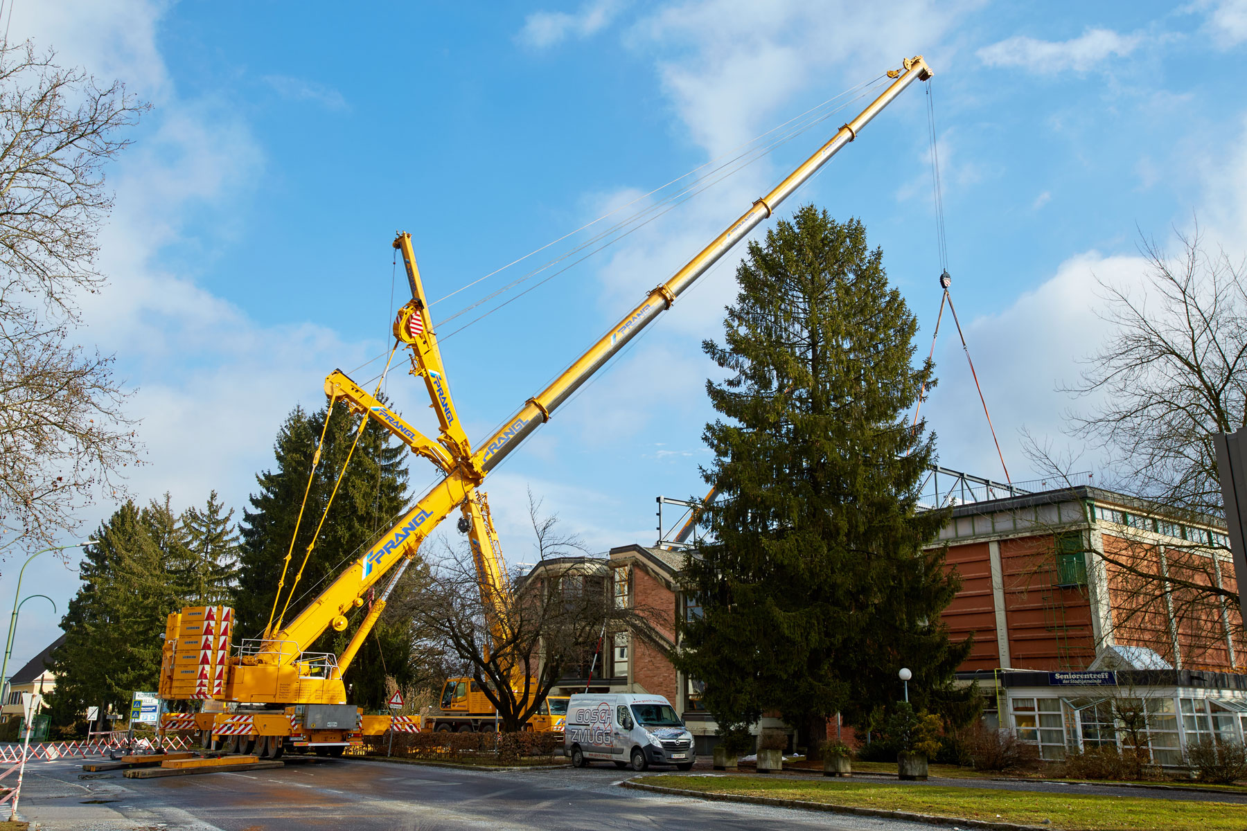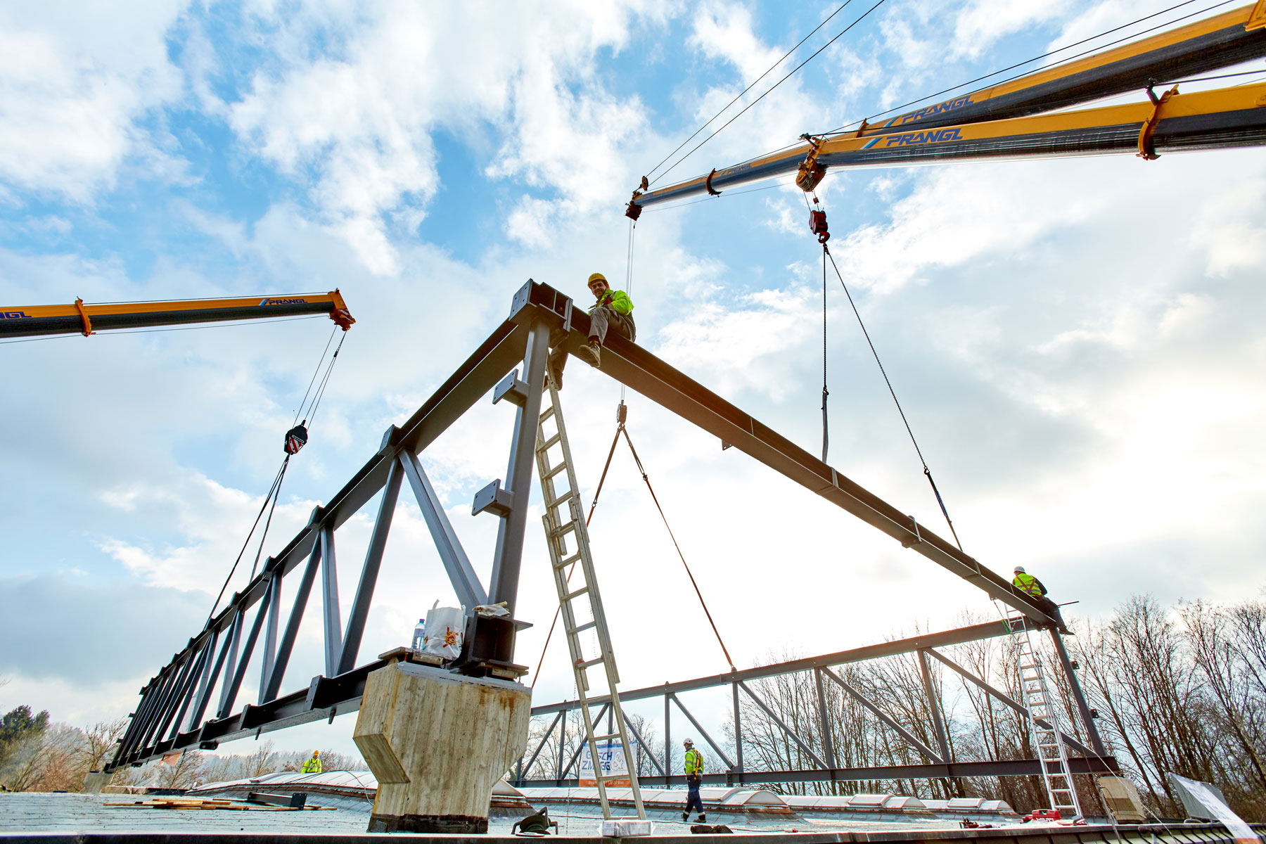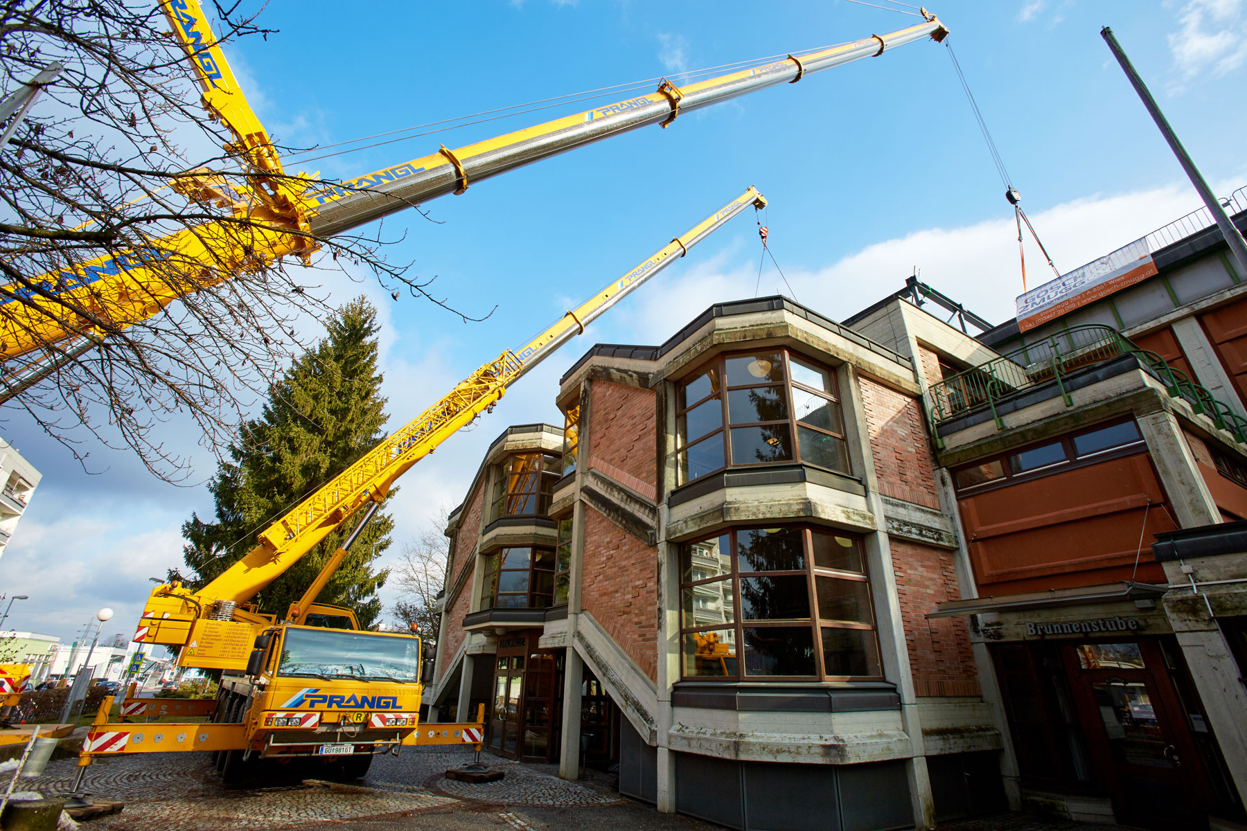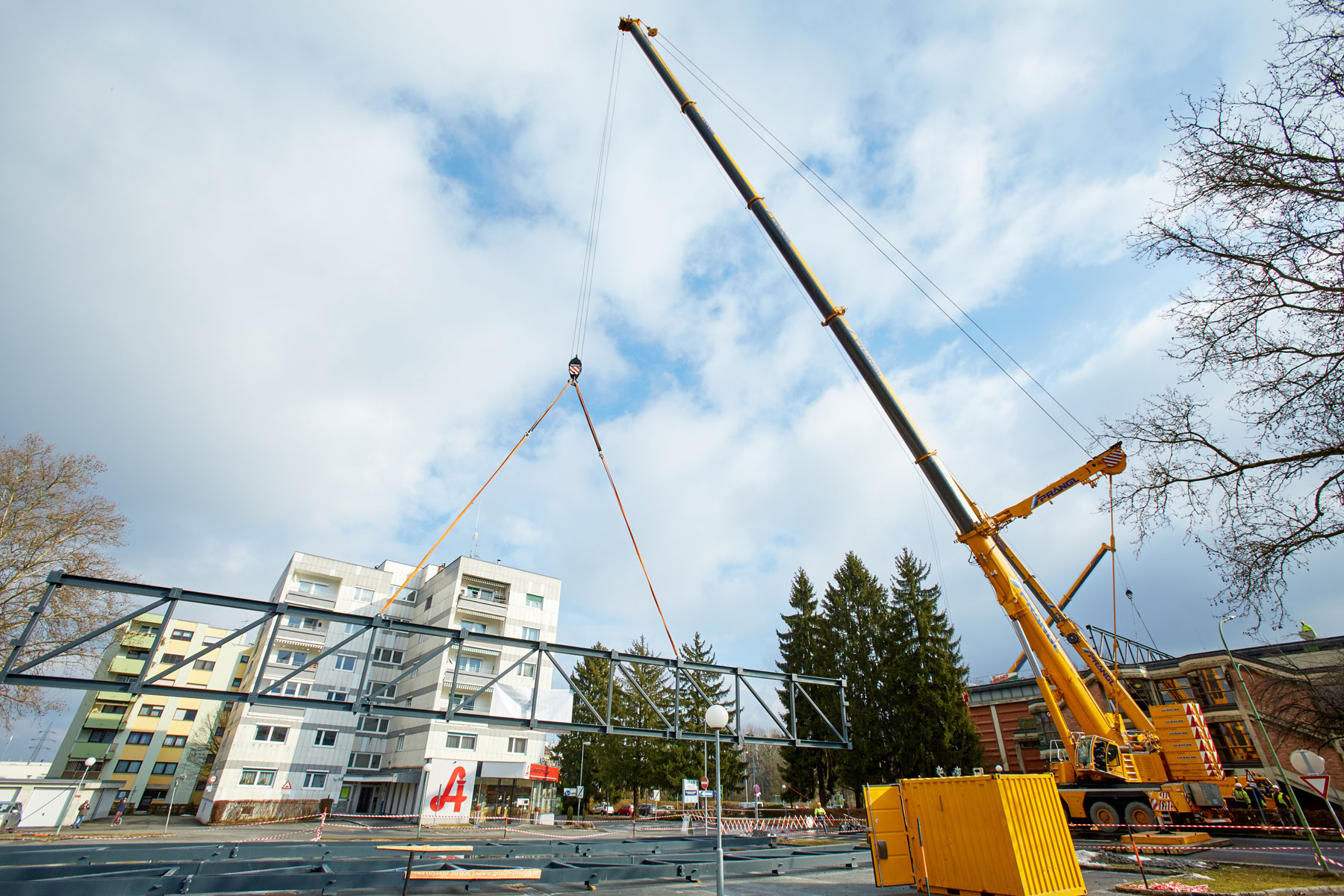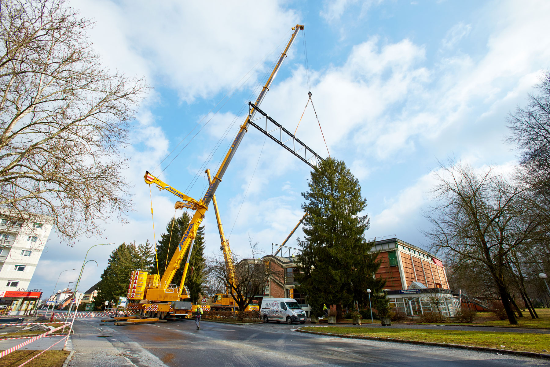 Kako bi osigurali što jednostavniju logistiku podizanja, metalni dijelovi su pripremljeni za podizanje na parkiralištu koje se nalazi preko puta dvorane, a onda su s pomoću mobilne dizalice koja teži 350 tona podignuti na armiranobetonske stupove dvorane Koralmhalle. Akcija se odvijala dva dana. Cjelokupno podizanje podržavale su još teleskopske dizalice od 55 i 70 tona. Još jednom je uhodani tim tvrtke Prangl posao obavio na potpuno zadovoljstvo stranke i krajnjeg korisnika, općine Deutschlandsberg.