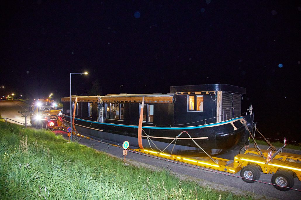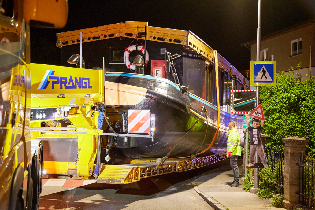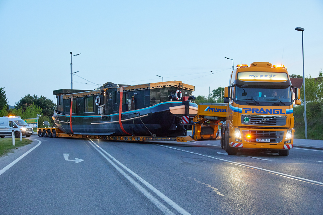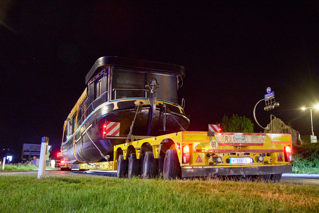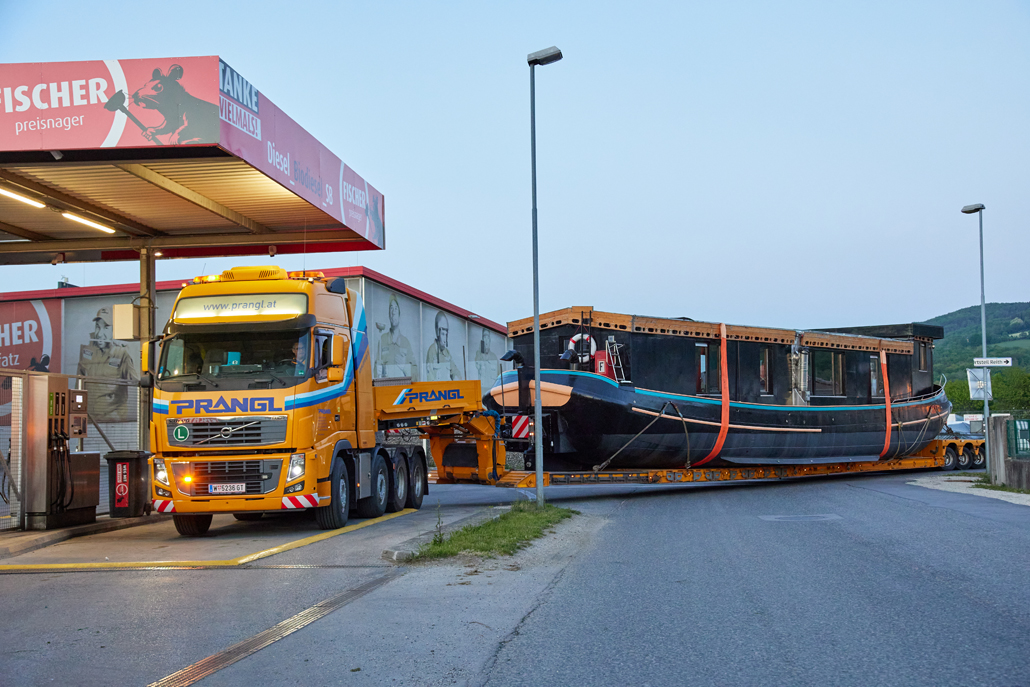 Plutajuća kuća od 31 tone, duljine 20,0 metara, širine 4,3 metra i visine 4,0 metra, naravno, nije mala stvar. Prijevoz tereta ove veličine postavlja vrlo posebne zahtjeve pred prijevoznike. Naravno, bilo je potrebno unaprijed razjasniti koja ruta između Wilhelmsburga i Pöchlarna odgovara težini, širini i visini. Osim toga, trebalo je osigurati kompletnu transportnu opremu. U skladištu je za dizanje bila dostupna teleskopska dizalica nosivosti 250 tona, koja je brod-kuću podigla na 4-osovinski tegljač s 4-osovinskom niskom prikolicom.