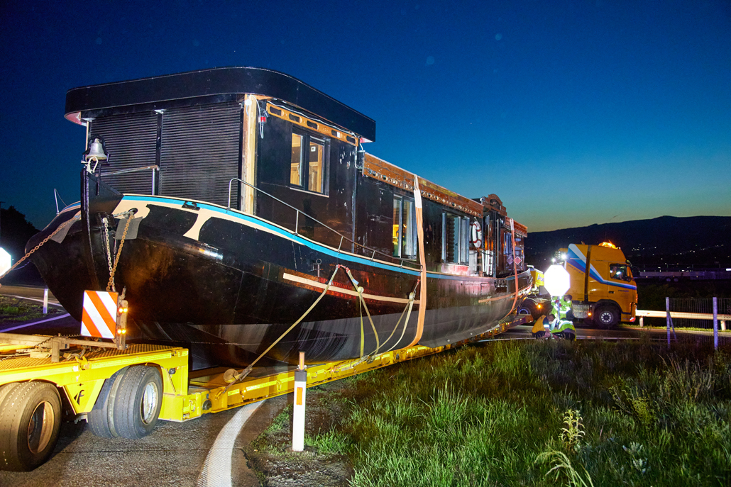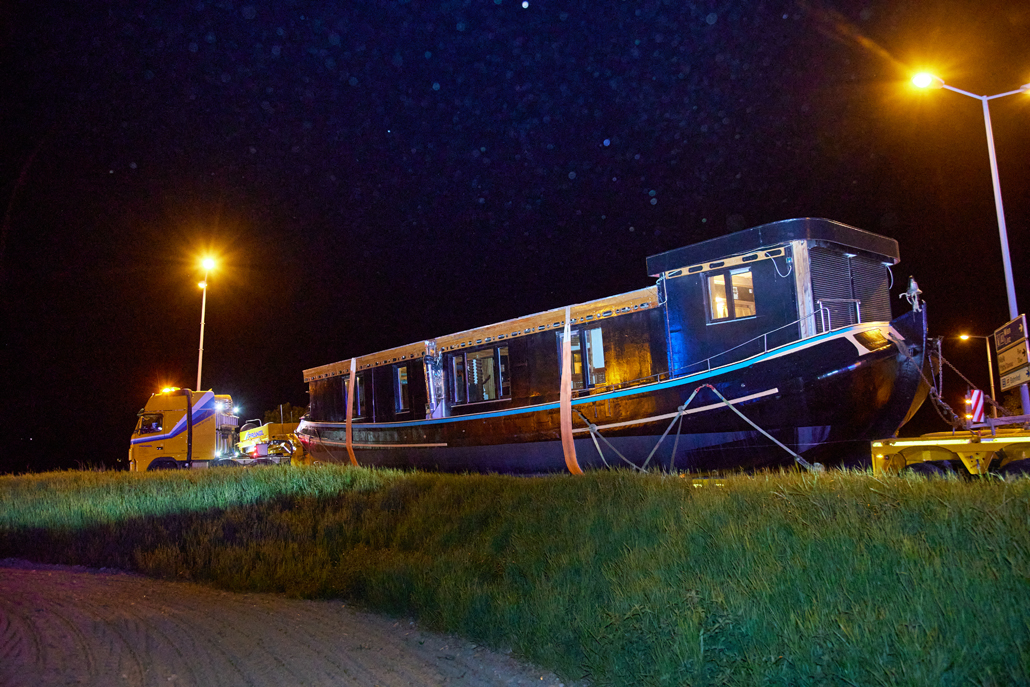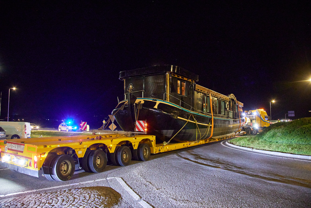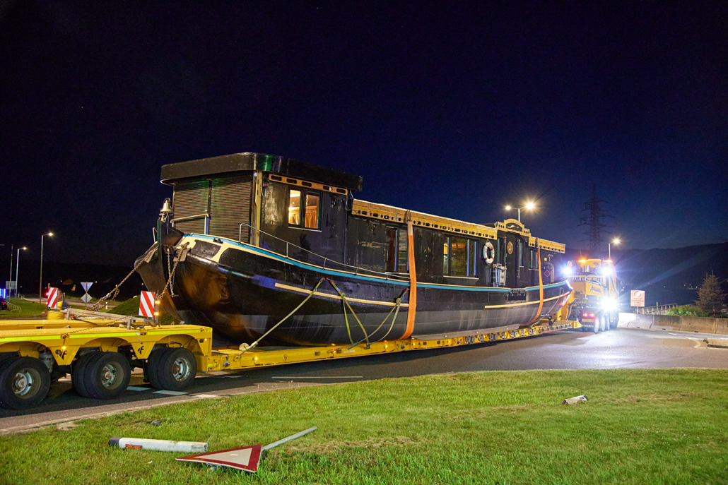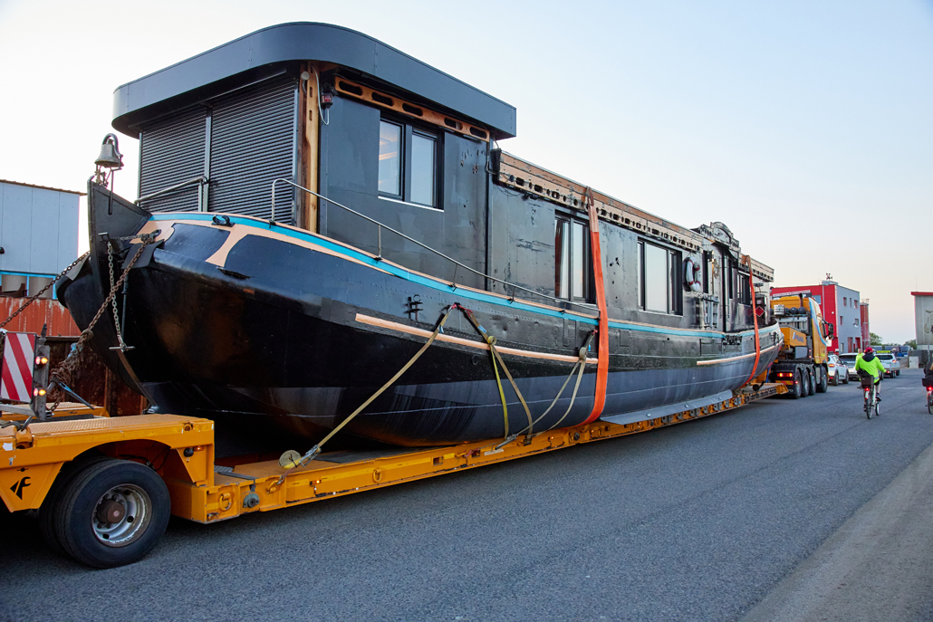 Plutajuća kuća od 31 tone, duljine 20,0 metara, širine 4,3 metra i visine 4,0 metra, naravno, nije mala stvar. Prijevoz tereta ove veličine postavlja vrlo posebne zahtjeve pred prijevoznike. Naravno, bilo je potrebno unaprijed razjasniti koja ruta između Wilhelmsburga i Pöchlarna odgovara težini, širini i visini. Osim toga, trebalo je osigurati kompletnu transportnu opremu. U skladištu je za dizanje bila dostupna teleskopska dizalica nosivosti 250 tona, koja je brod-kuću podigla na 4-osovinski tegljač s 4-osovinskom niskom prikolicom.