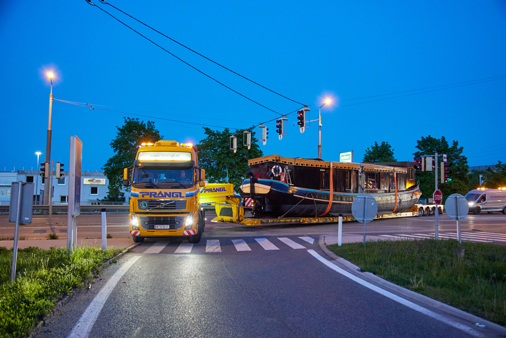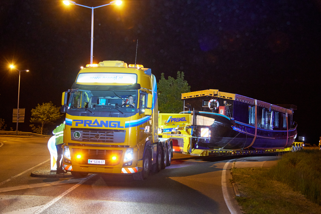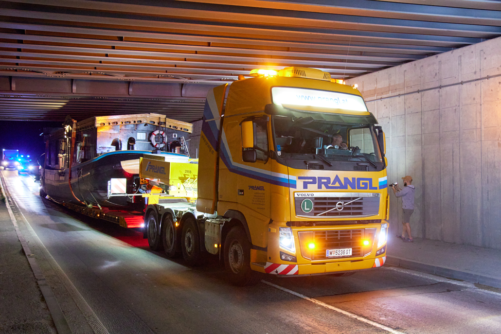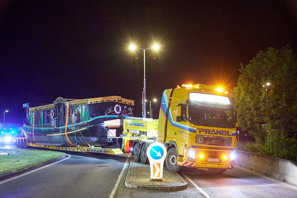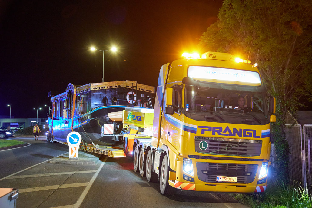 Trebalo je nekoliko sati da konvoj sigurno stigne na odredište na Dunavu, gdje je vozača i posadu čekao dodatni zadatak. Zadnjih 500 metara trebalo je prevladati u rikvercu. Na kraju ove rute, nakon posebno oštrog zavoja, slijedila je još jedna uzbrdica do Donauländea. I tu je prepreku savladao u hodu i uz podršku pažljivih pratitelja. U ranim jutarnjim satima ekipa Prangla konačno je uz pomoć teleskopske dizalice od 250 tona uspjela spustiti brod u vodu, na oduševljenje vlasnika.