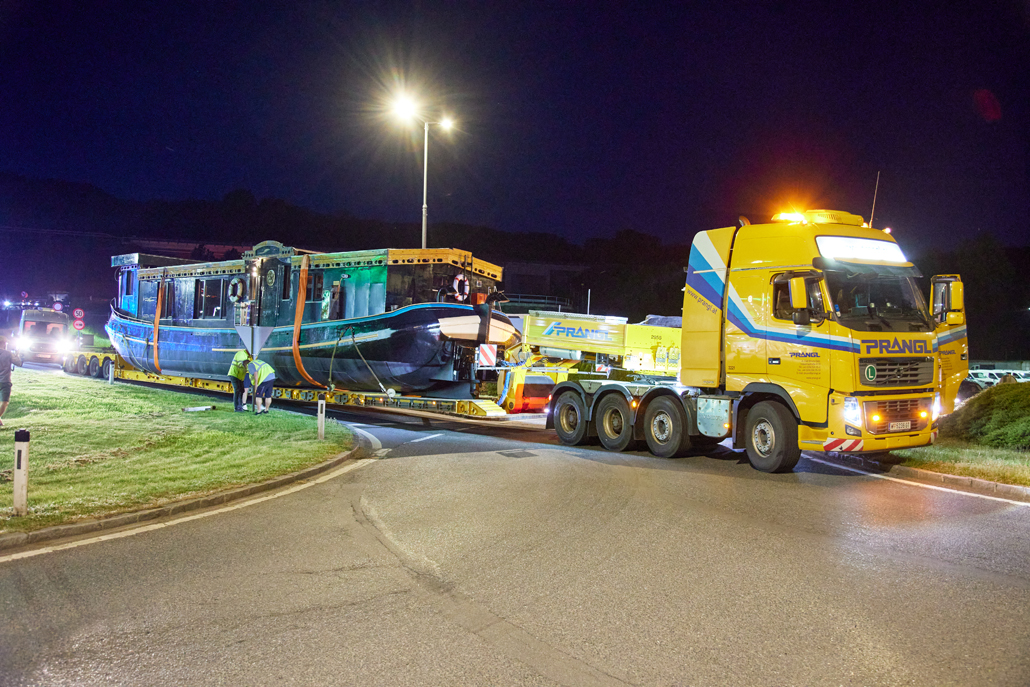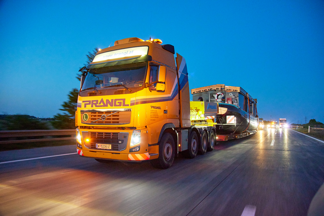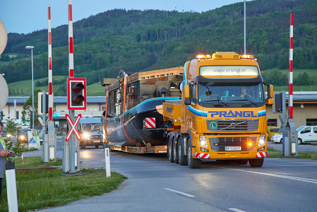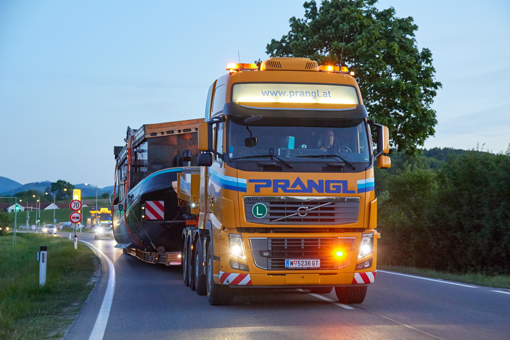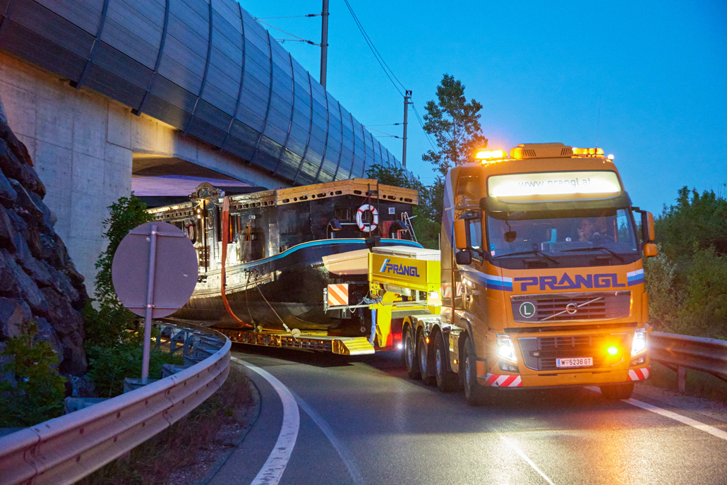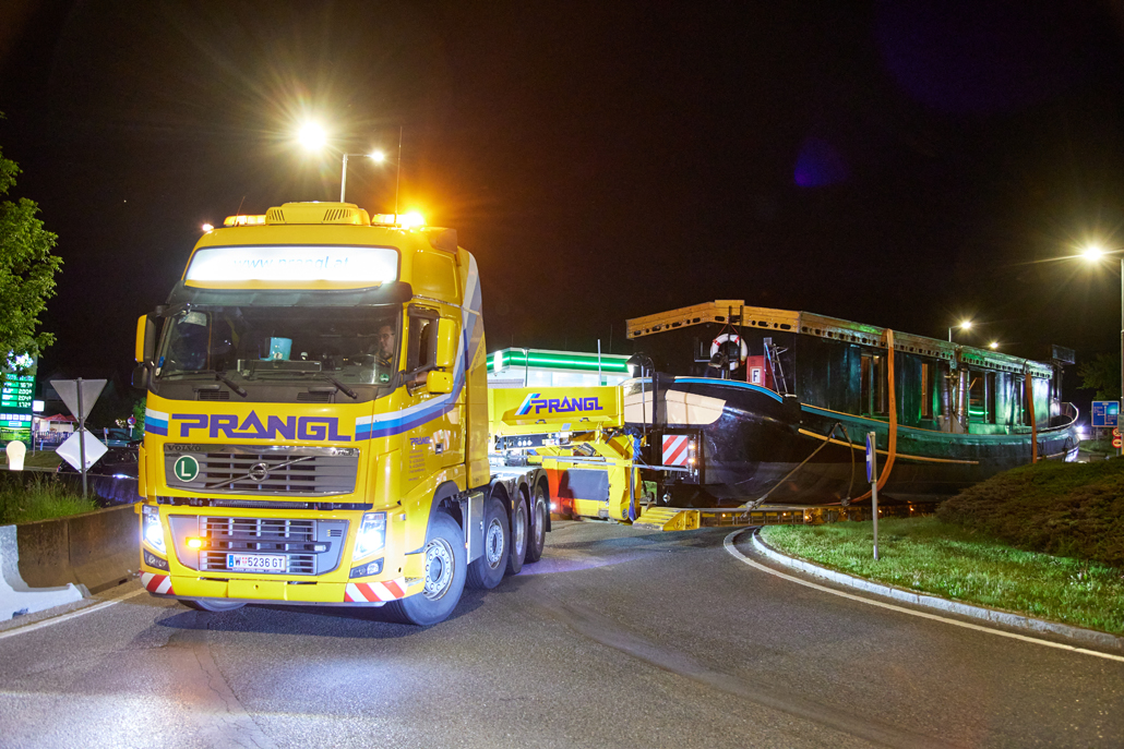 Trebalo je nekoliko sati da konvoj sigurno stigne na odredište na Dunavu, gdje je vozača i posadu čekao dodatni zadatak. Zadnjih 500 metara trebalo je prevladati u rikvercu. Na kraju ove rute, nakon posebno oštrog zavoja, slijedila je još jedna uzbrdica do Donauländea. I tu je prepreku savladao u hodu i uz podršku pažljivih pratitelja. U ranim jutarnjim satima ekipa Prangla konačno je uz pomoć teleskopske dizalice od 250 tona uspjela spustiti brod u vodu, na oduševljenje vlasnika.