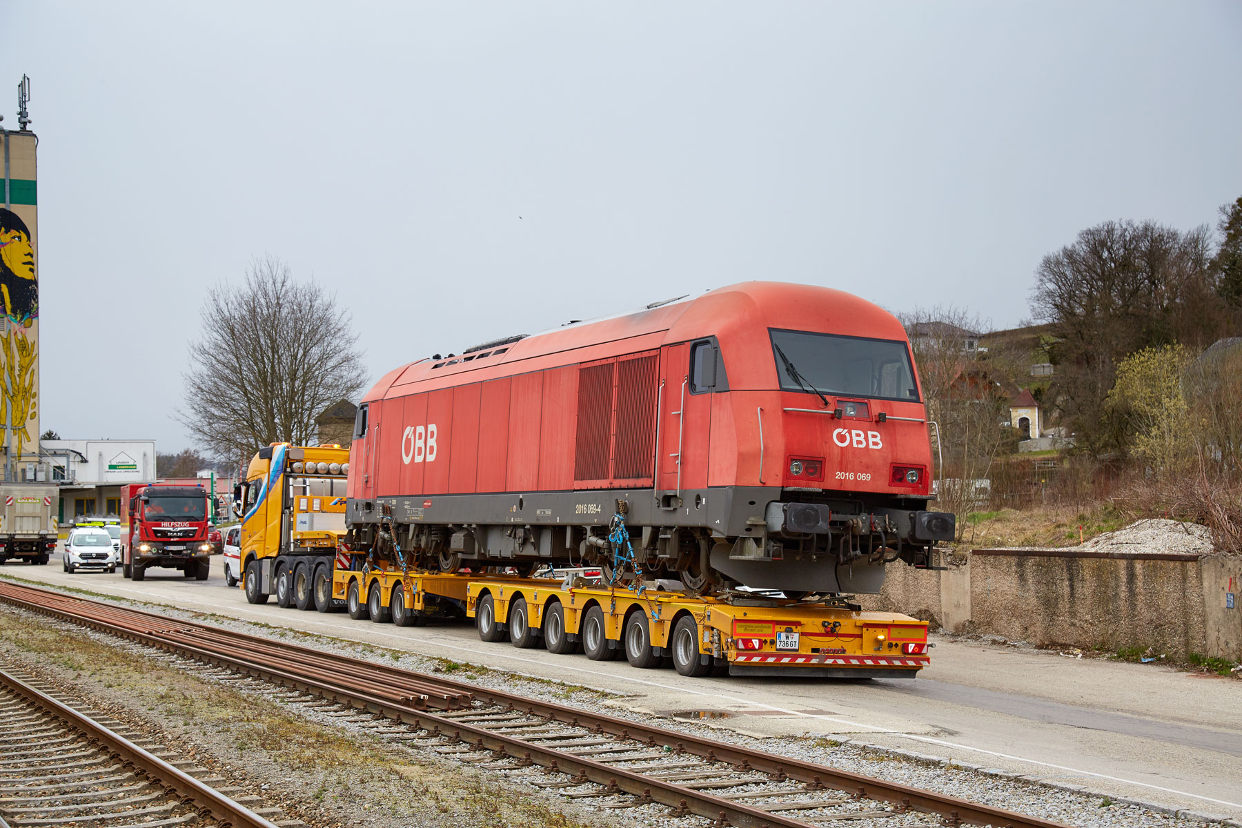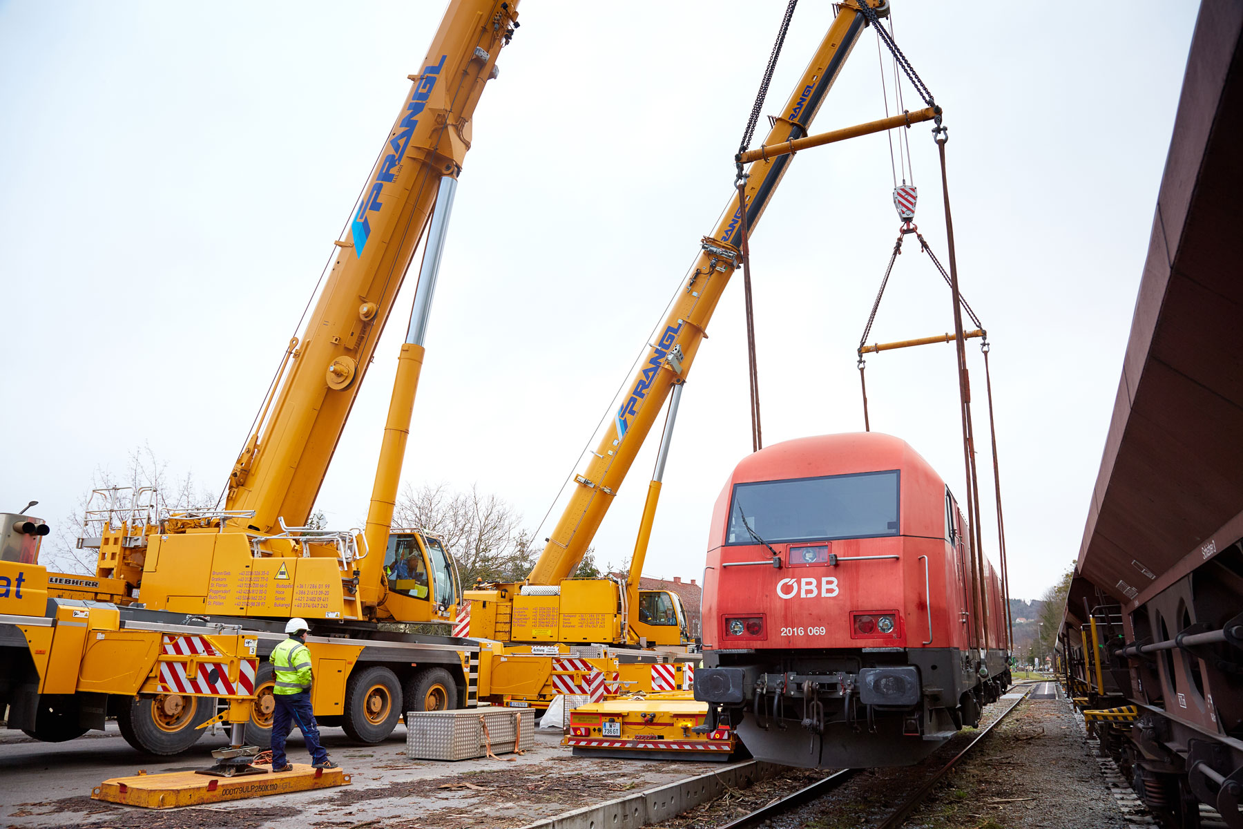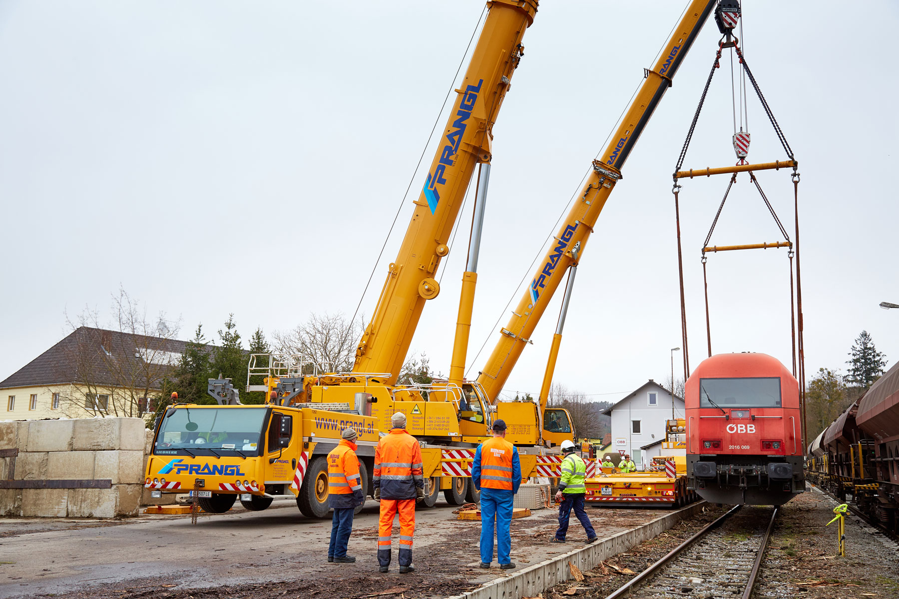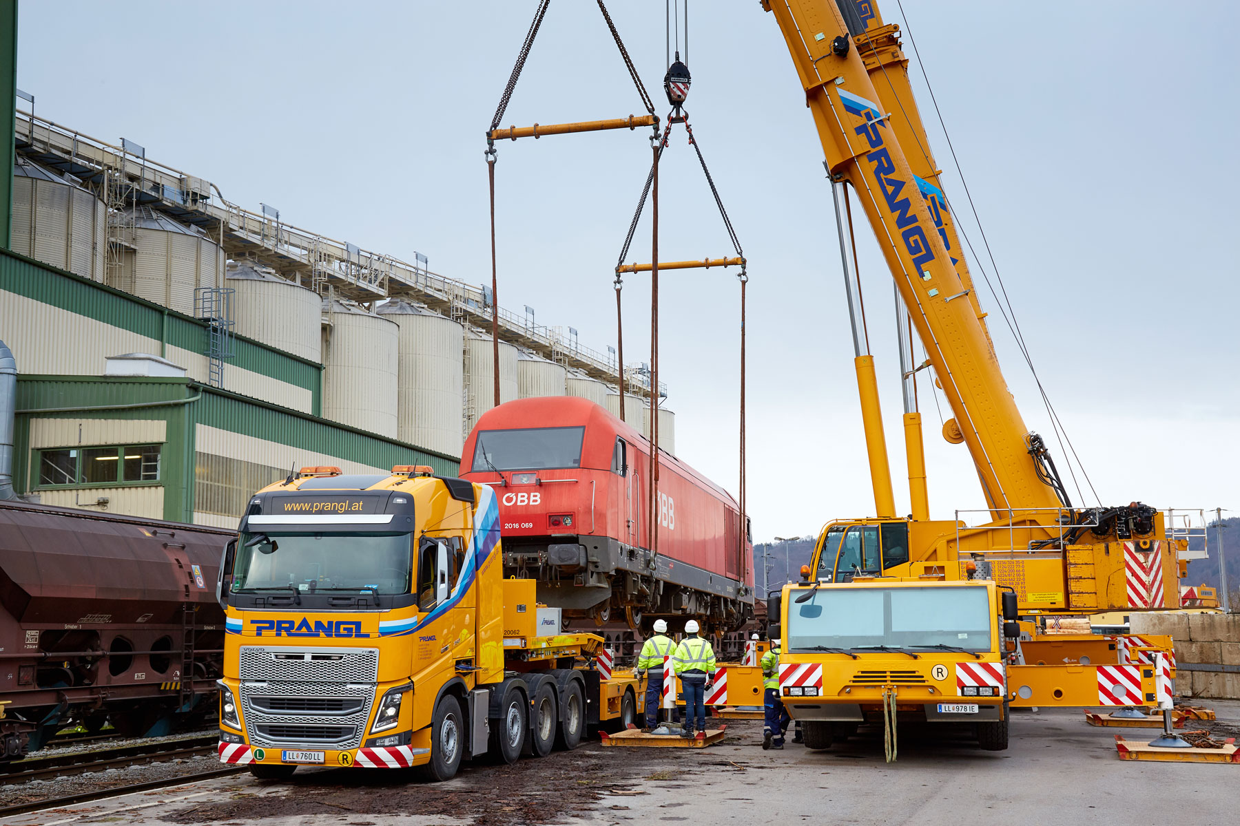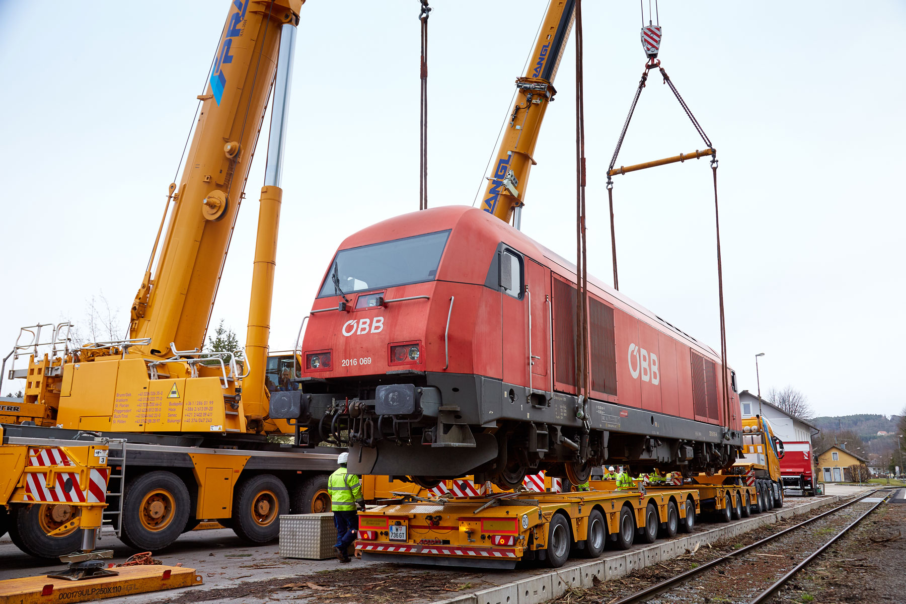 Podizanje dizelske lokomotive dužine 19,7 metara, širine 2,9 i visine od 4,3 metra, obavljeno tandemskim podizanjem s dizalicom na gusjenicama koja teži 350 tona i teleskopskom dizalicom koja teži 160 tona. Takvi manevri uvijek zahtijevaju savršenu koordinaciju između oba operatera dizalica. Dobro uigran tim tvrtke Prangl i ovaj put je izvrsno obavio svoj posao. Željeznički gigant konačno je prevezen 4-osovinskim teškim tegljačem i 9-osovinskom niskopodnom poluprikolicom. Dimenzije transporta iznosile su 28,5 metara dužine i 5,5 metara visine. Sveukupno ta je kompozicija težila čak 133,2 tone.