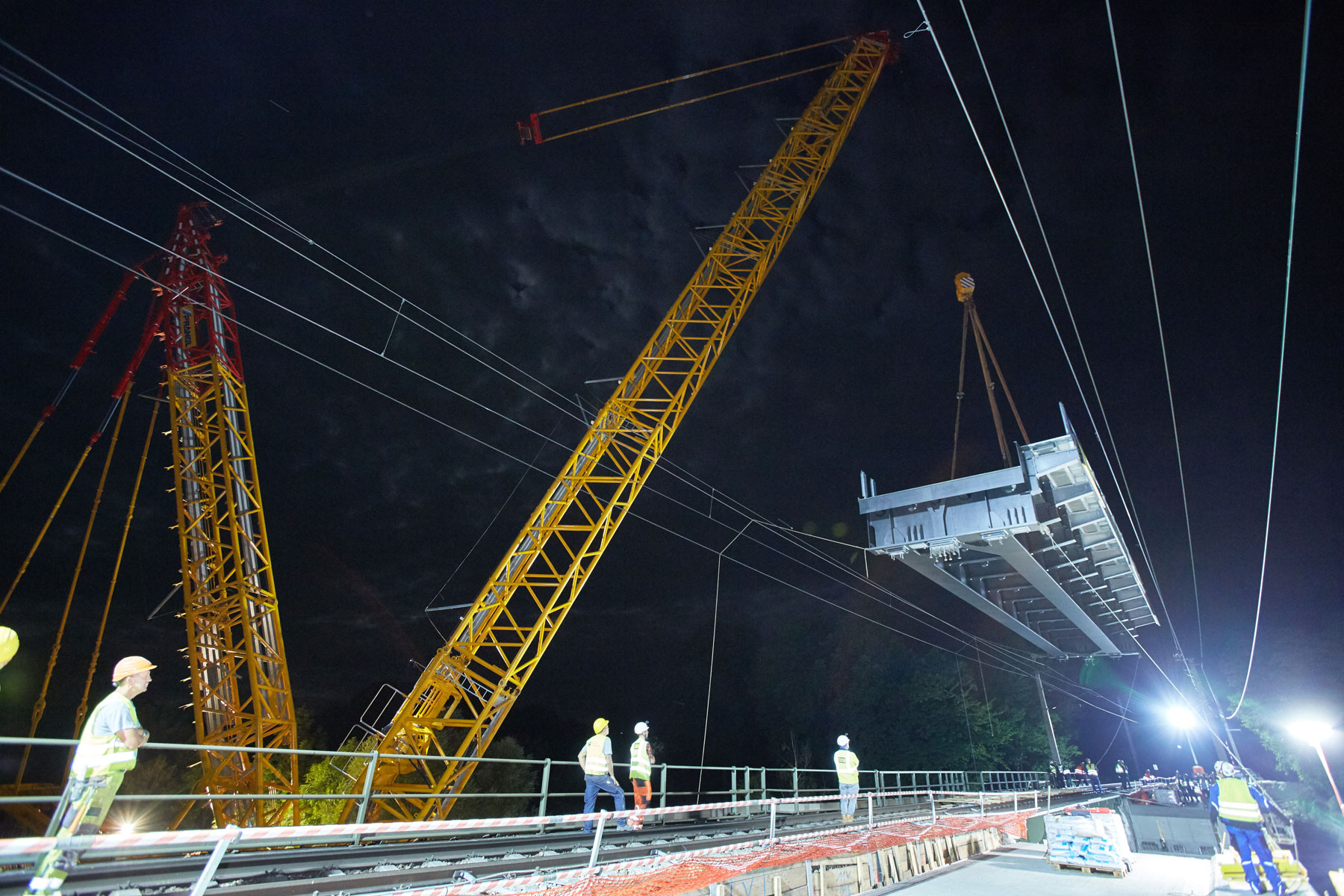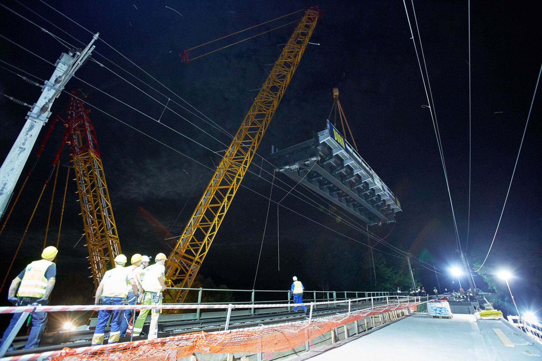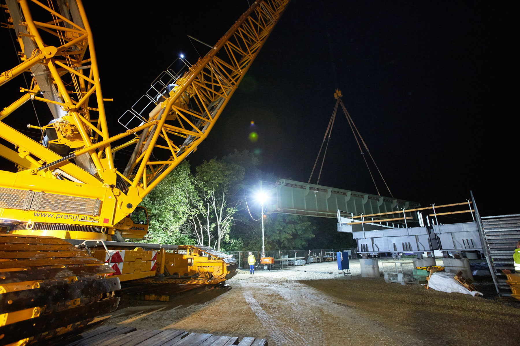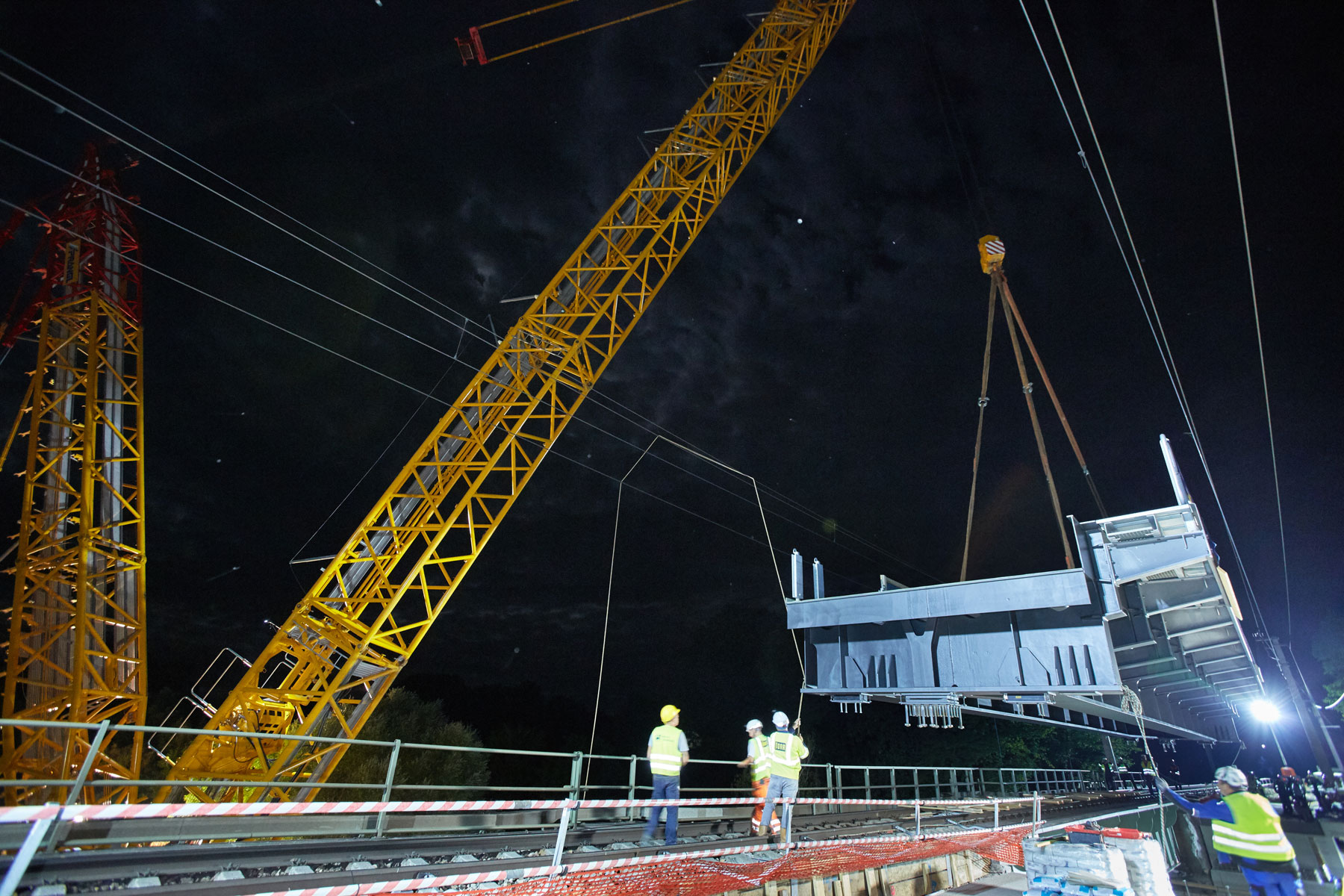 Zbog tijesnih prostornih uvjeta, susjedna staza za bicikle BMX kao i teren za odbojku na pijesku morali su se pretvoriti i prilagoditi u područje za dizalice. I pri tom zadatku su već od početka bili uključeni stručnjaci tvrtke Prangl. Kako se ne bi previše ometao željeznički promet, postojala su fiksna vremenska razdoblja (od 00:00 do 06:00 sati) tijekom kojih su kolosijeci bili blokirani s obje strane. Noćni radovi te vrste od vozača dizalica uvijek zahtijevaju dodatnu pozornost. Kako bi stvar bila još gora, dijelovi mosta morali su se podići iznad gornjih vodova napajanja.