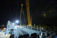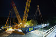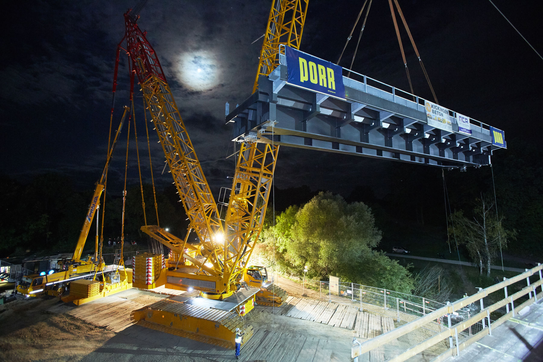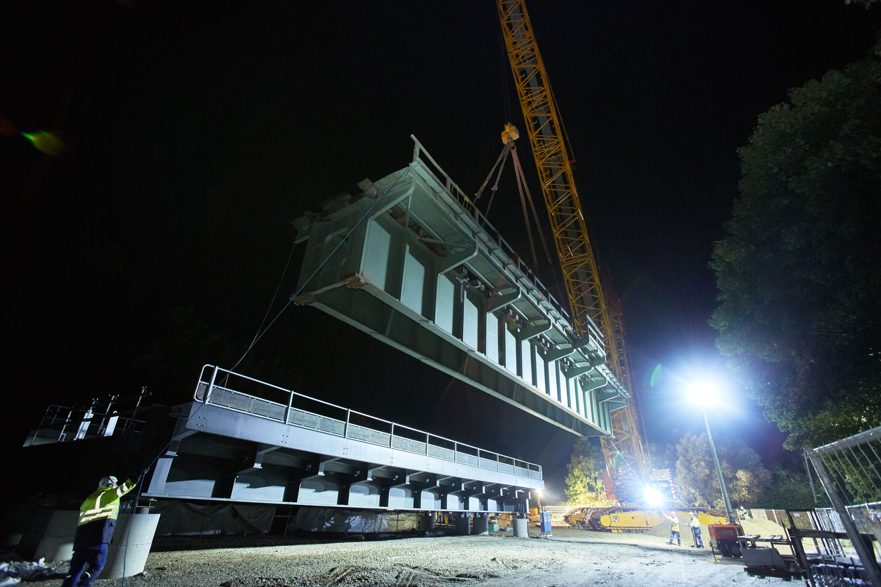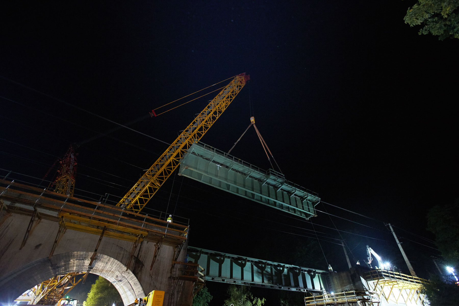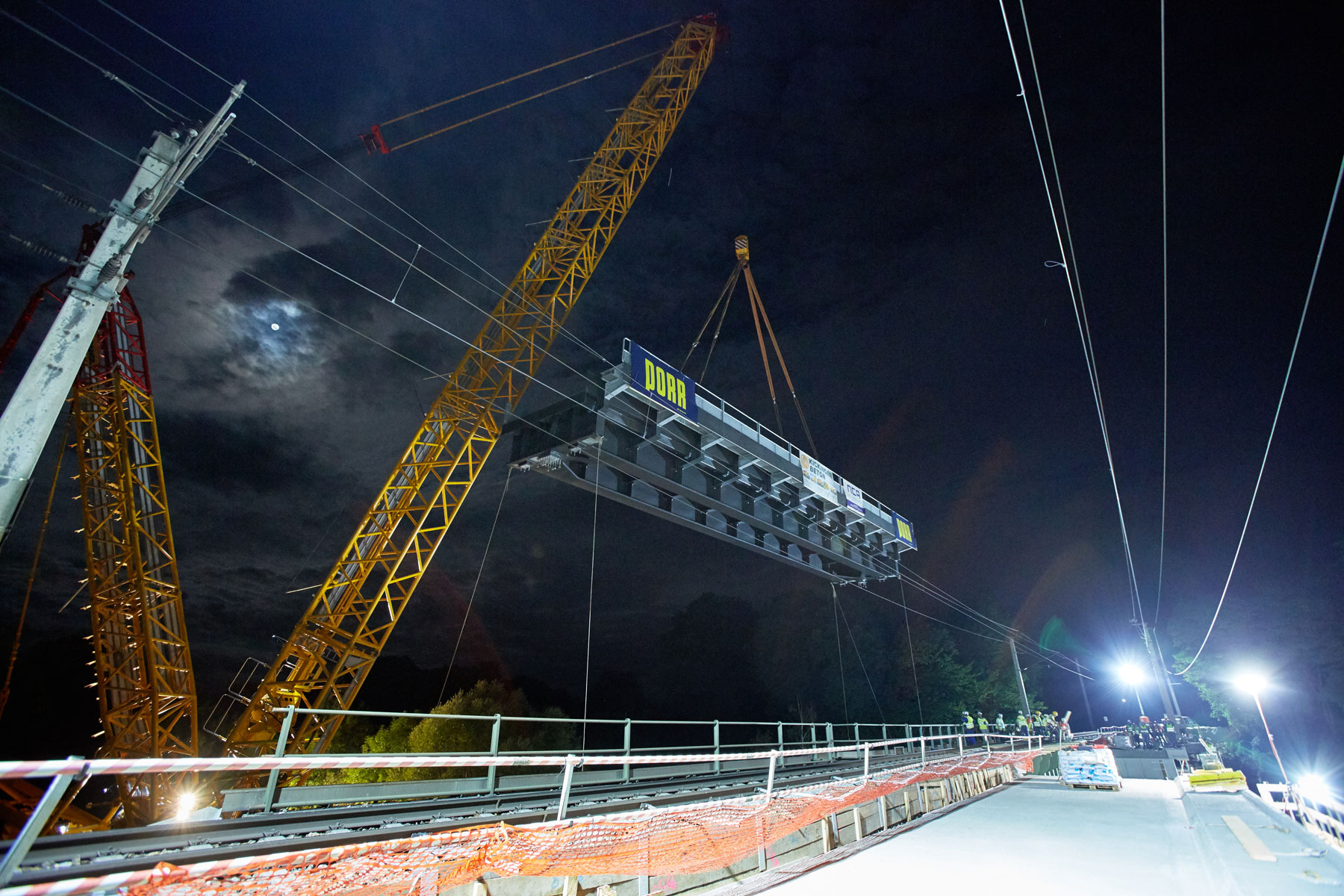 Zbog tijesnih prostornih uvjeta, susjedna staza za bicikle BMX kao i teren za odbojku na pijesku morali su se pretvoriti i prilagoditi u područje za dizalice. I pri tom zadatku su već od početka bili uključeni stručnjaci tvrtke Prangl. Kako se ne bi previše ometao željeznički promet, postojala su fiksna vremenska razdoblja (od 00:00 do 06:00 sati) tijekom kojih su kolosijeci bili blokirani s obje strane. Noćni radovi te vrste od vozača dizalica uvijek zahtijevaju dodatnu pozornost. Kako bi stvar bila još gora, dijelovi mosta morali su se podići iznad gornjih vodova napajanja.