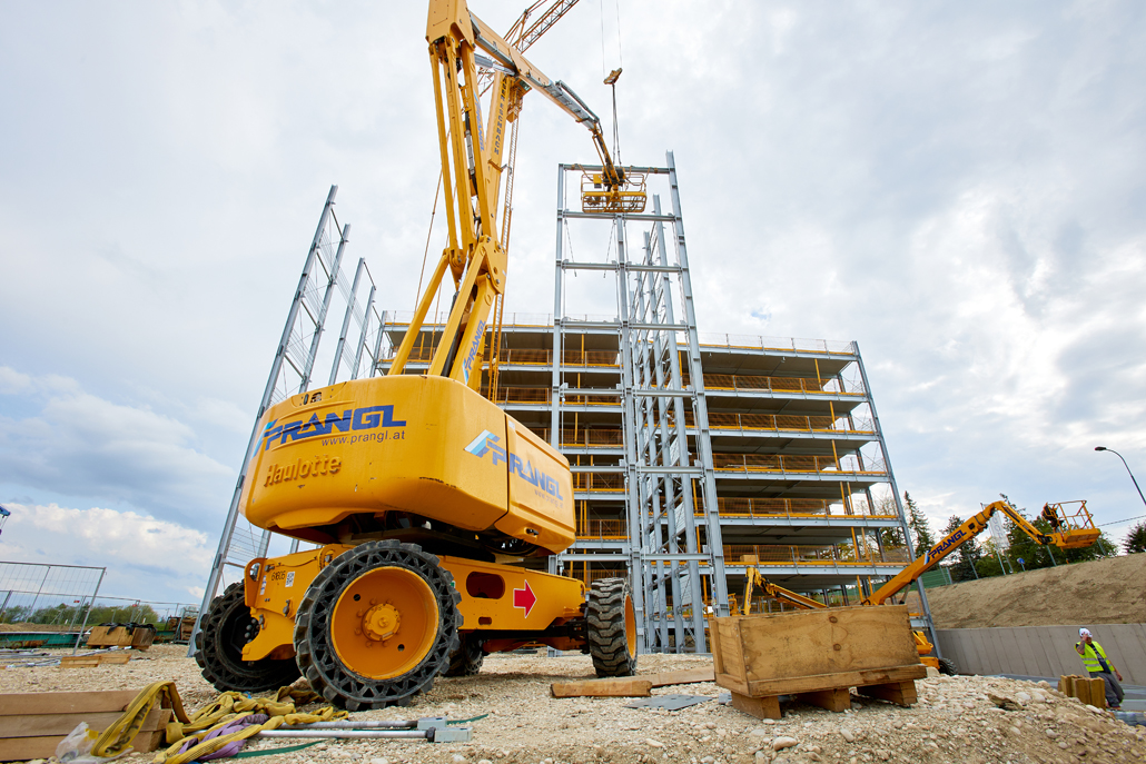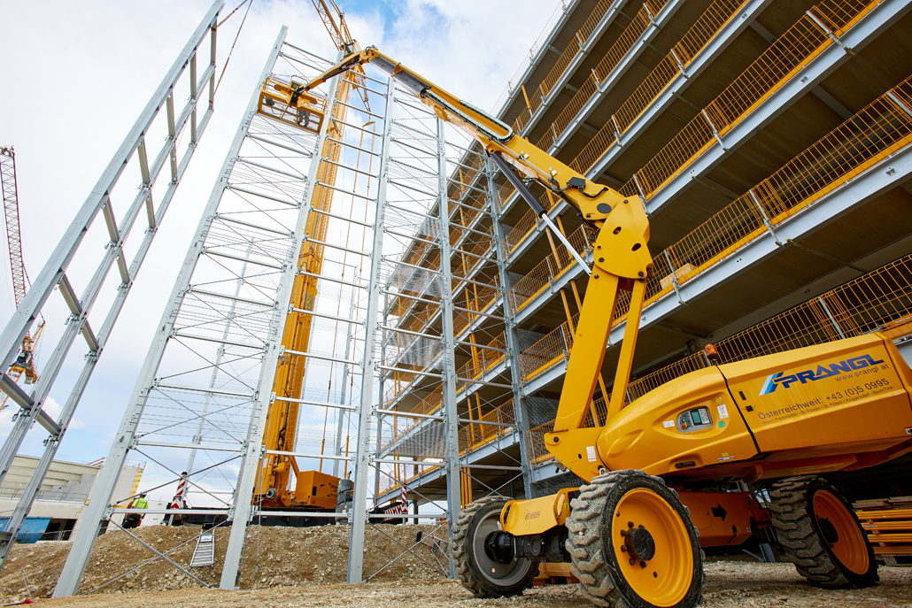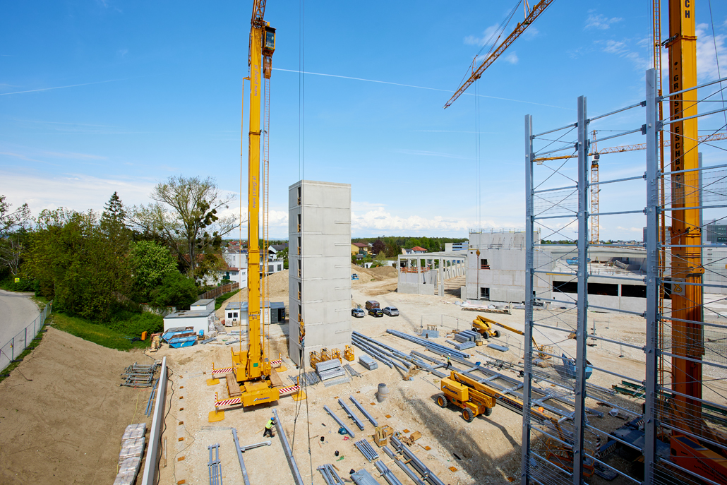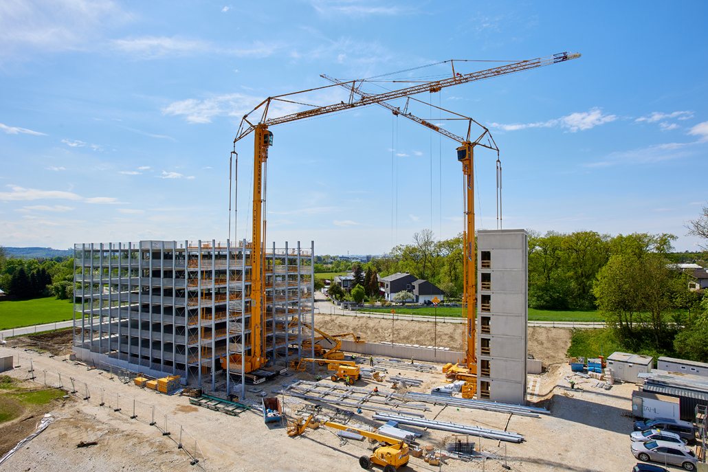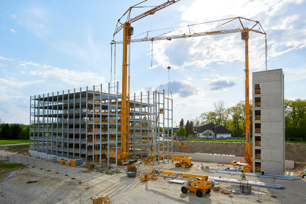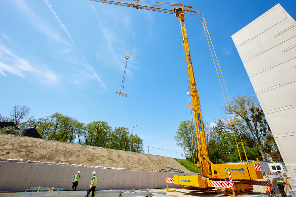 Mobilna građevinska dizalica obavila je sve dizalne radove – prvenstveno podizanje i pozicioniranje čeličnih konstrukcija, oplatnih elemenata i betonskih dijelova. Najspektakularniji zahvat bilo je podizanje konstrukcije sastavljene od tri prethodno spojena čelična stupa. Masivni element, dug 21 metar, širok 5,5 metara i težak približno 6 tona, premješten je u jednom komadu na konačnu lokaciju. Mobilna dizalica i njezin operater izvršili su ovaj precizni zahvat besprijekorno, postavivši središnji dio buduće garaže na ispravan položaj.