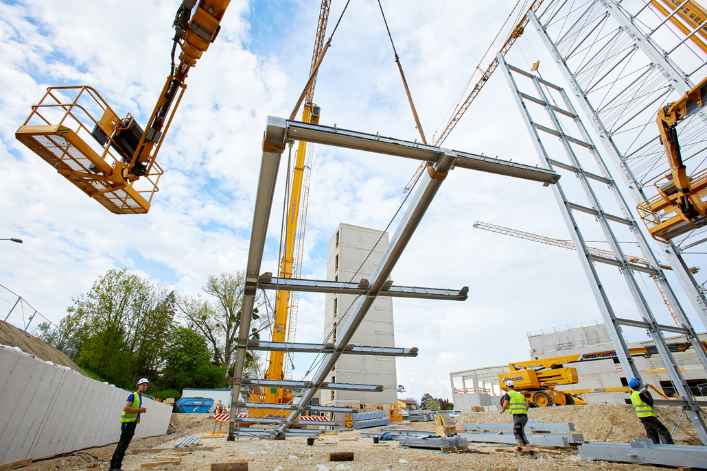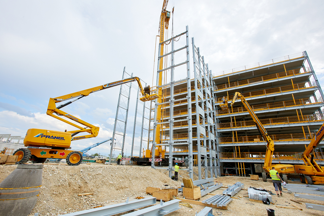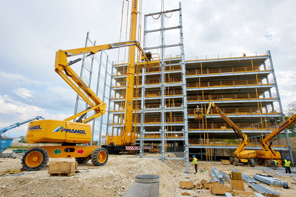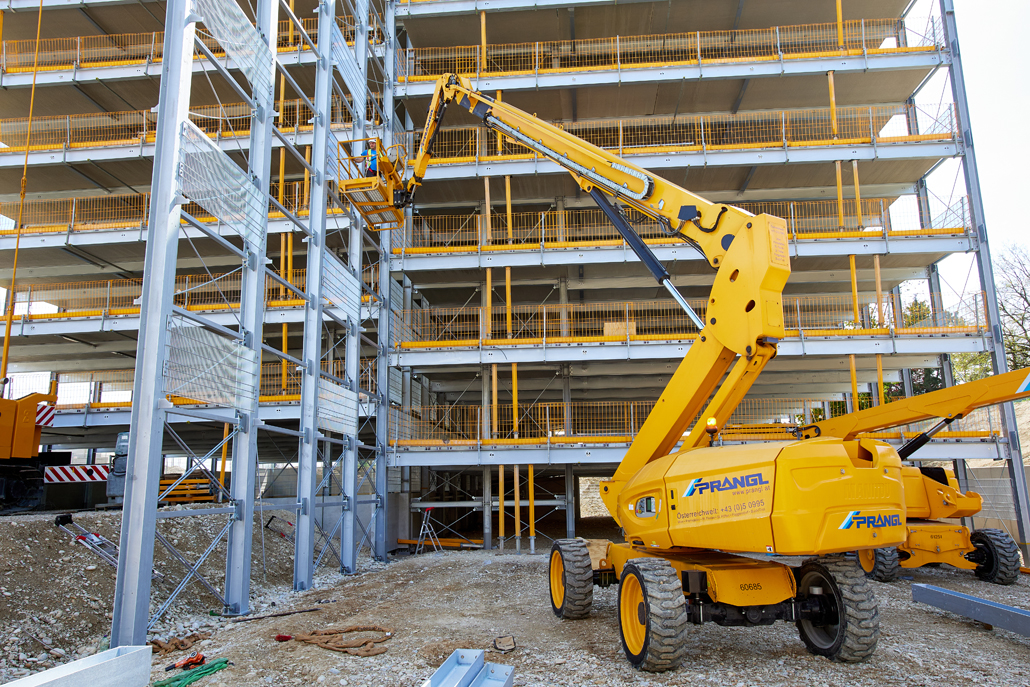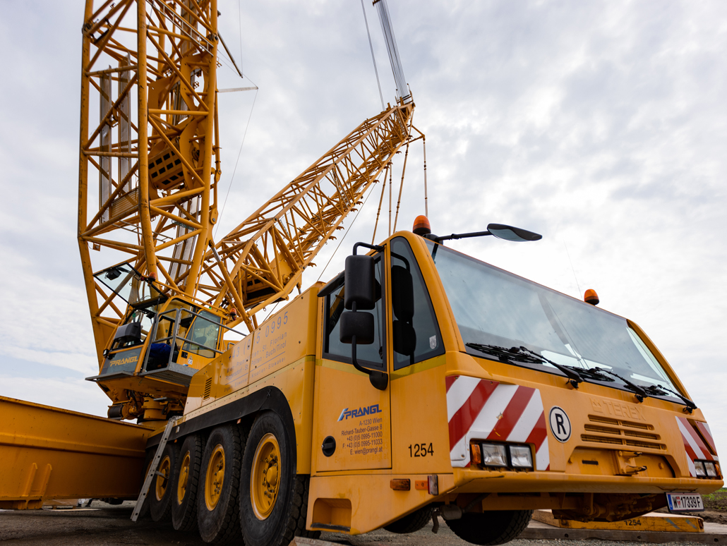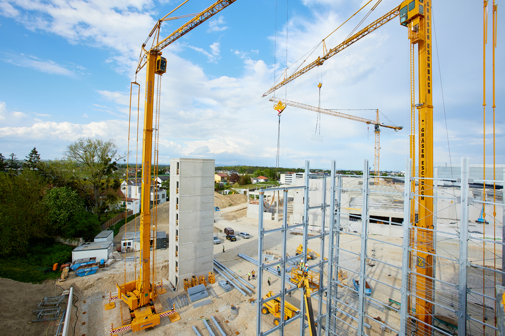 Mobilna građevinska dizalica obavila je sve dizalne radove – prvenstveno podizanje i pozicioniranje čeličnih konstrukcija, oplatnih elemenata i betonskih dijelova. Najspektakularniji zahvat bilo je podizanje konstrukcije sastavljene od tri prethodno spojena čelična stupa. Masivni element, dug 21 metar, širok 5,5 metara i težak približno 6 tona, premješten je u jednom komadu na konačnu lokaciju. Mobilna dizalica i njezin operater izvršili su ovaj precizni zahvat besprijekorno, postavivši središnji dio buduće garaže na ispravan položaj.