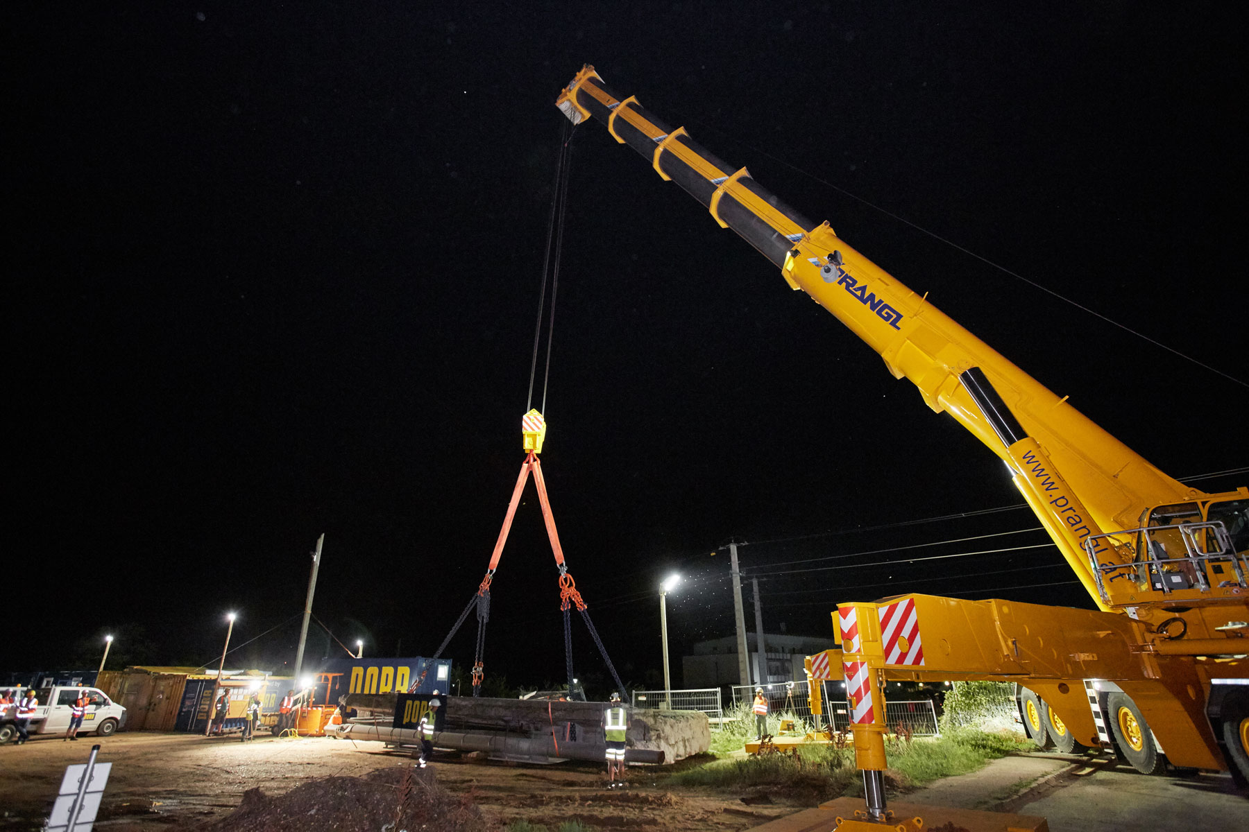 Zbog protuutega od 228 tona ukupna težina velike dizalice iznosila je 336 tona. Stoga je naravno trebalo pronaći odgovarajuće mjesto za njezino postavljanje. Zahvaljujući tehničkoj stručnosti tima tvrtke Prangl, bilo je moguće pronaći prostor koji nije zahtijevao nikakvu dodatnu pripremu. Iz tog razloga dostignuta je značajna ušteda troškova i pojednostavljenje projekta za stranku. Segment mosta odložen je neposredno uz područje gradilišta gdje je odgovarajuće rastavljen i transportiran od strane specijalizirane tvrtke. Kompletan postupak podizanja obavljen je unutar dogovorenih vremenskih rokova i na potpuno zadovoljstvo svih sudionika.