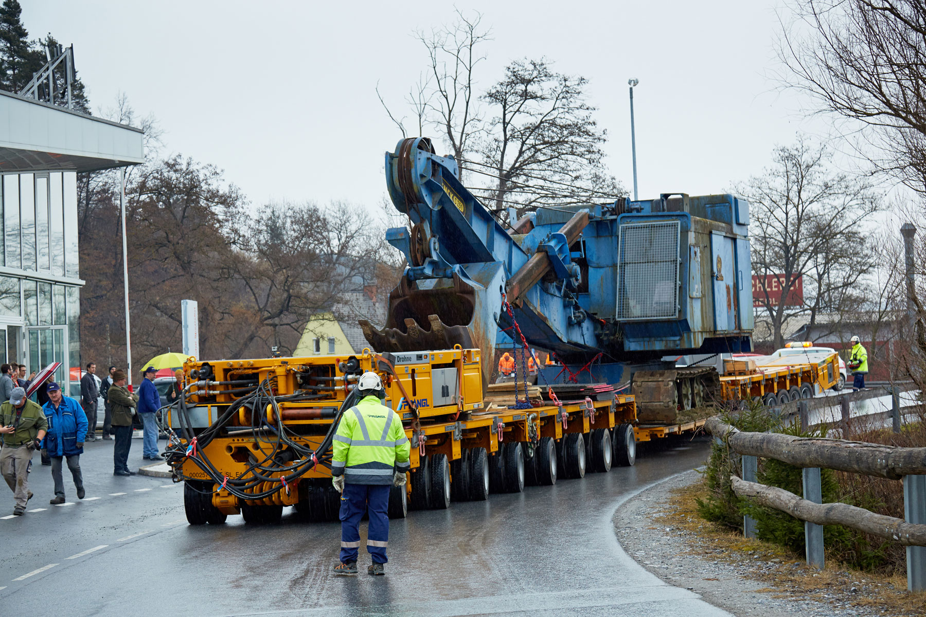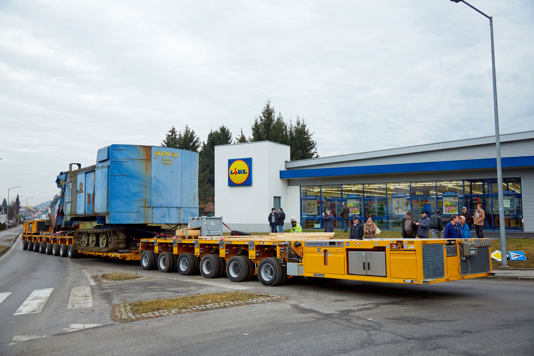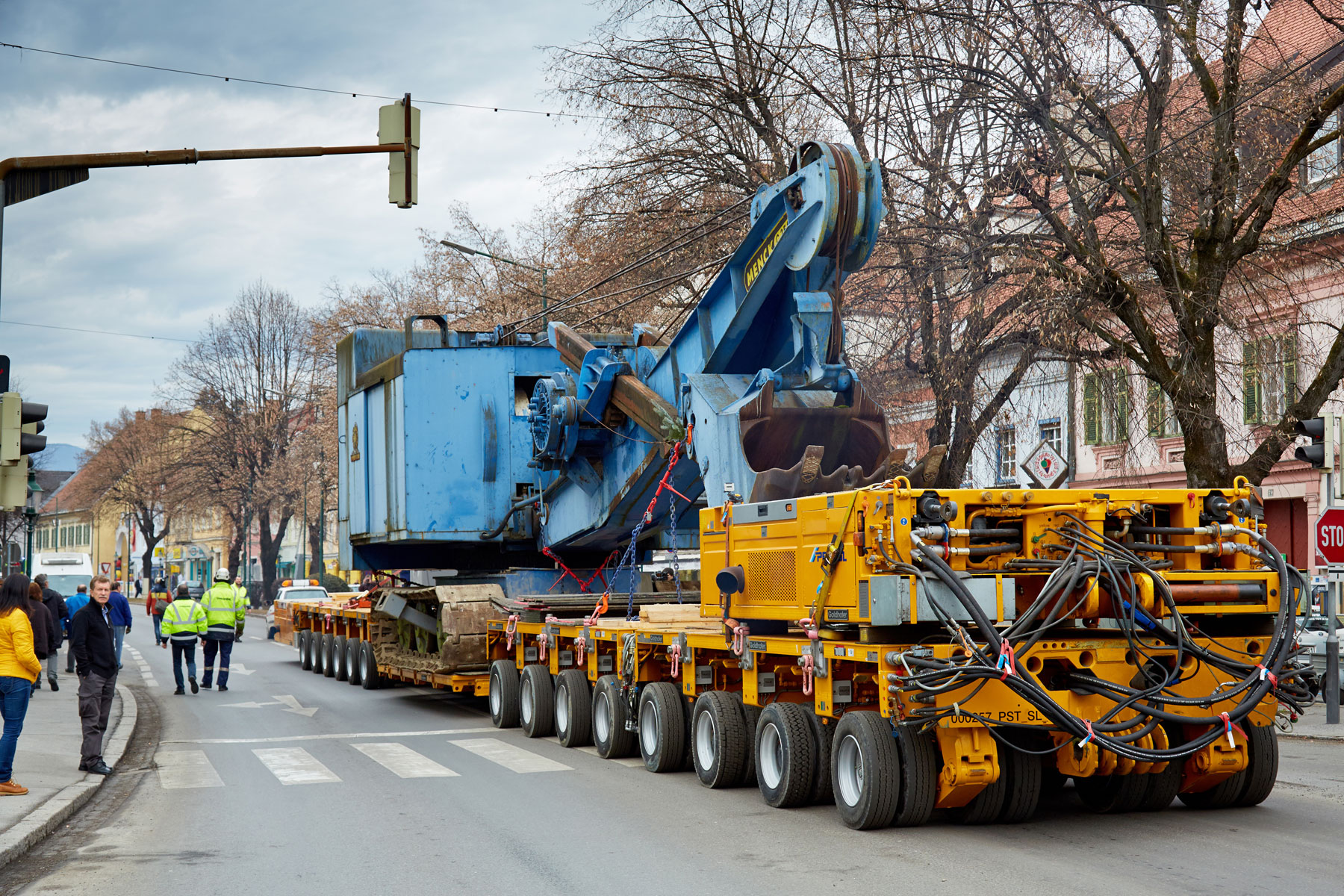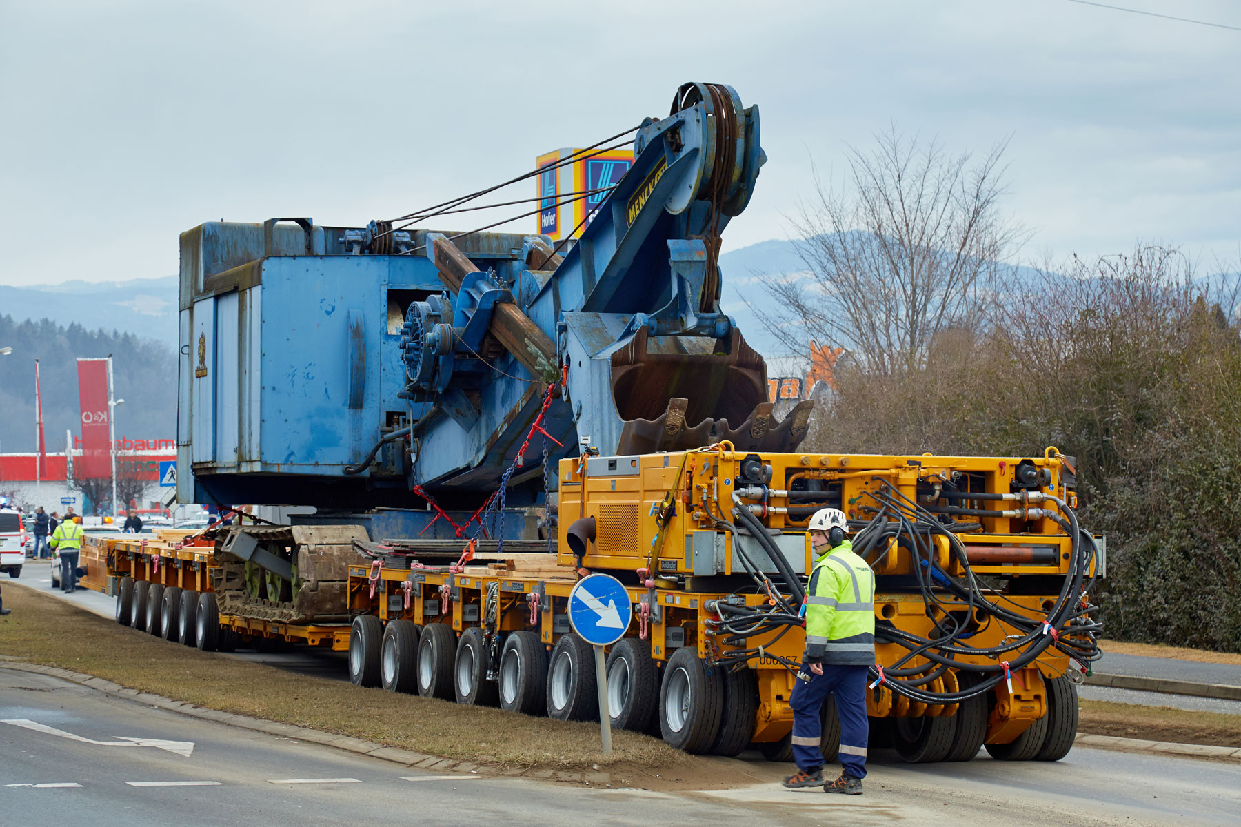 Zbog ograničenog prostora, bager, dug gotovo 17 metara, širok 4,35 metara i visok 4,77 metara, mogao se prevesti samo samohodnim modulima za teške terete. Jedina druga mogućnost - potpuno rastavljanje bagera - nije bila moguća iz razloga izvedivosti i troškova. Kad je prevezen, 14-osovinski modul za teške terete, uključujući bager, dosegao je ukupnu težinu od oko 160 tona. Kompozicija duga 38 metara morala je prevladati brojna uska grla i složene situacije prije nego što se trijumfalna povorka nastavila središtem grada Voitsberg.