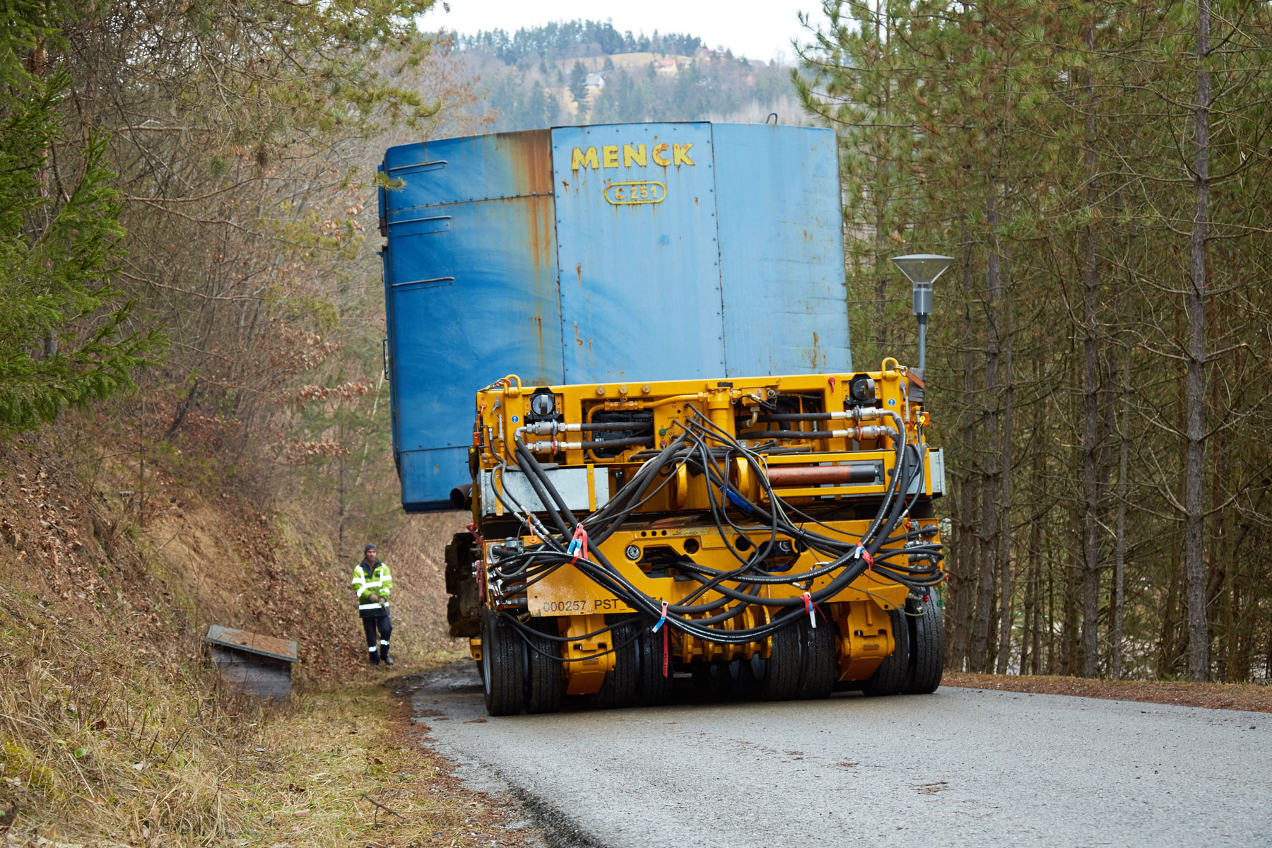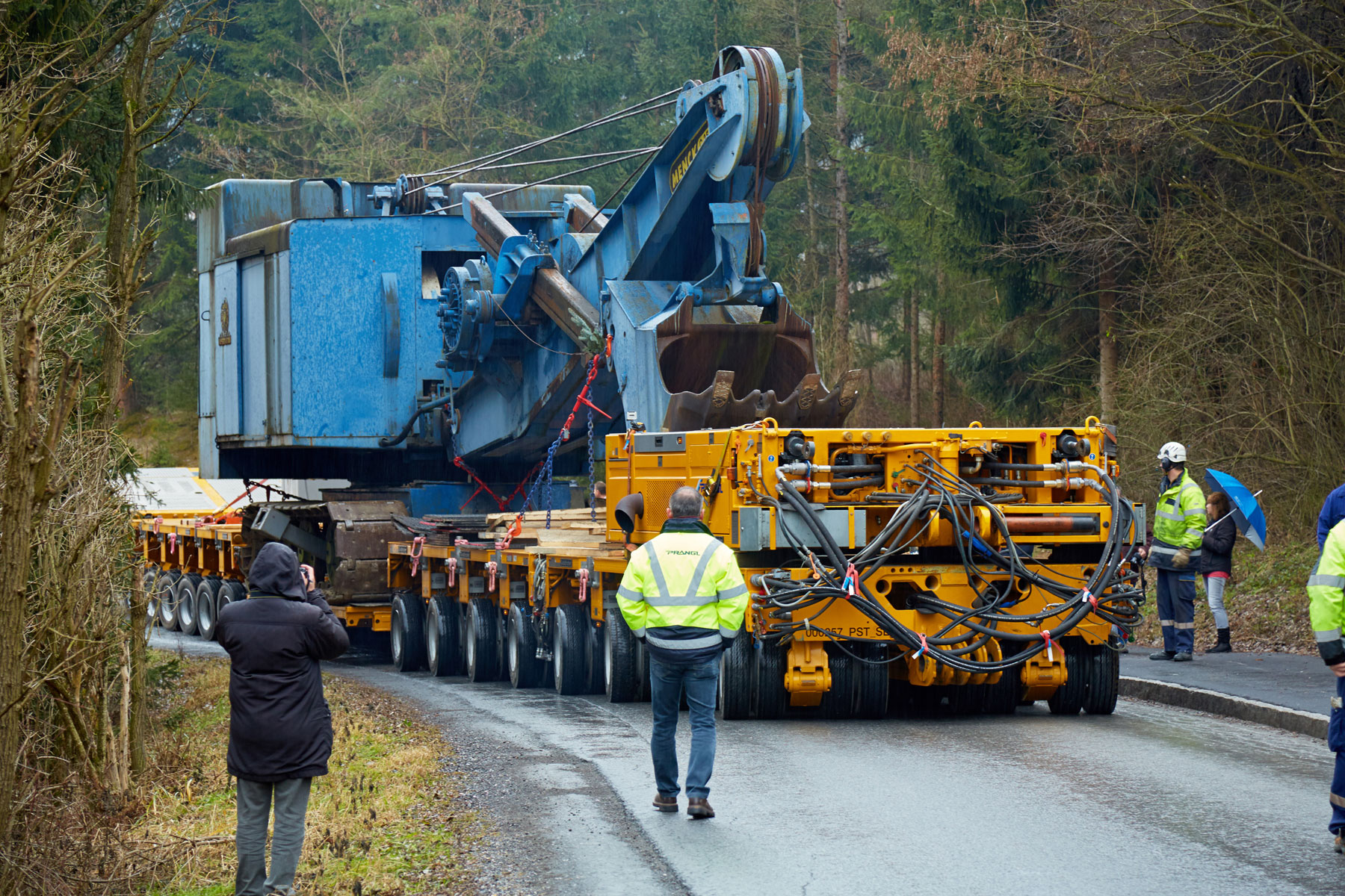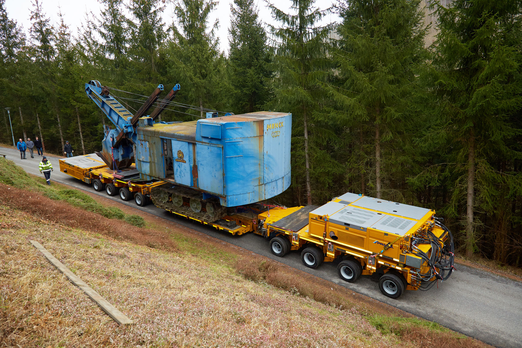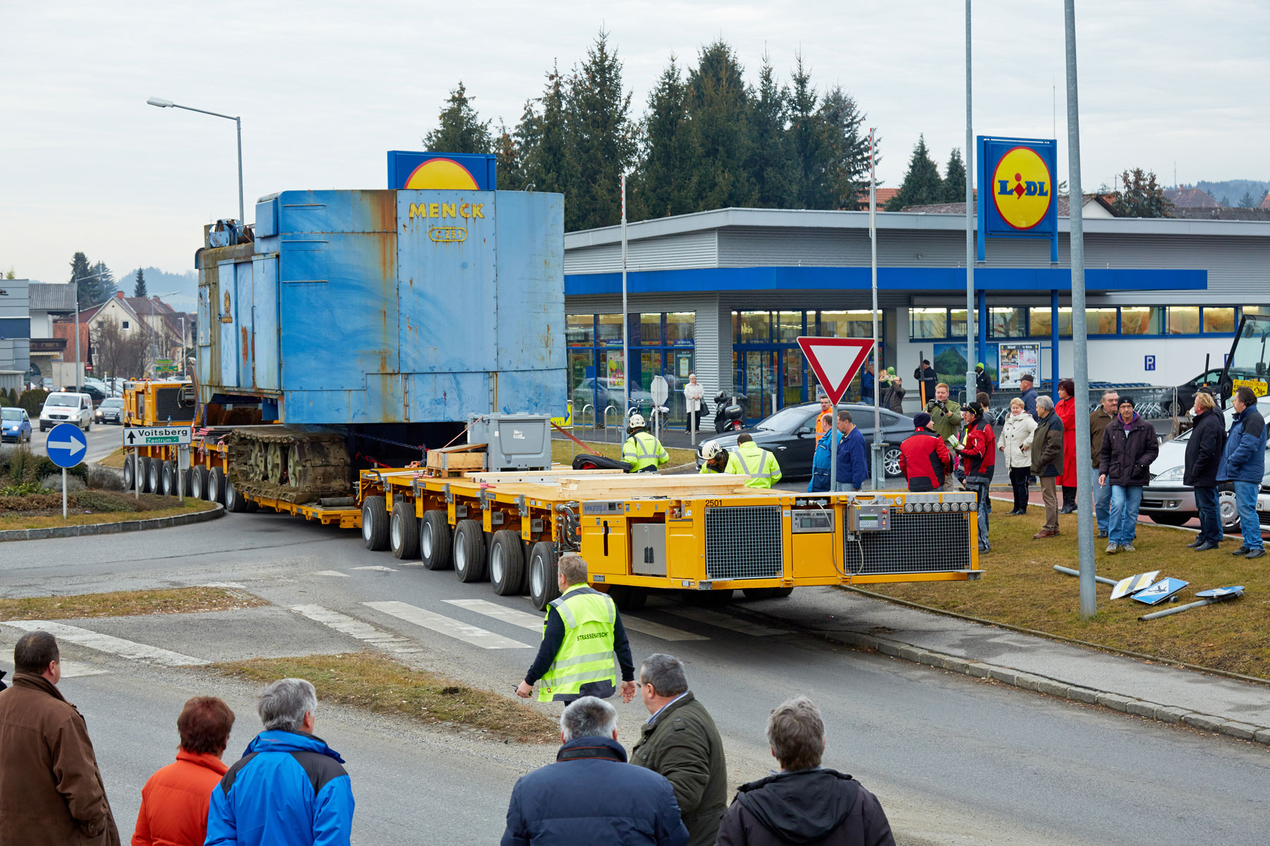 Zbog ograničenog prostora, bager, dug gotovo 17 metara, širok 4,35 metara i visok 4,77 metara, mogao se prevesti samo samohodnim modulima za teške terete. Jedina druga mogućnost - potpuno rastavljanje bagera - nije bila moguća iz razloga izvedivosti i troškova. Kad je prevezen, 14-osovinski modul za teške terete, uključujući bager, dosegao je ukupnu težinu od oko 160 tona. Kompozicija duga 38 metara morala je prevladati brojna uska grla i složene situacije prije nego što se trijumfalna povorka nastavila središtem grada Voitsberg.