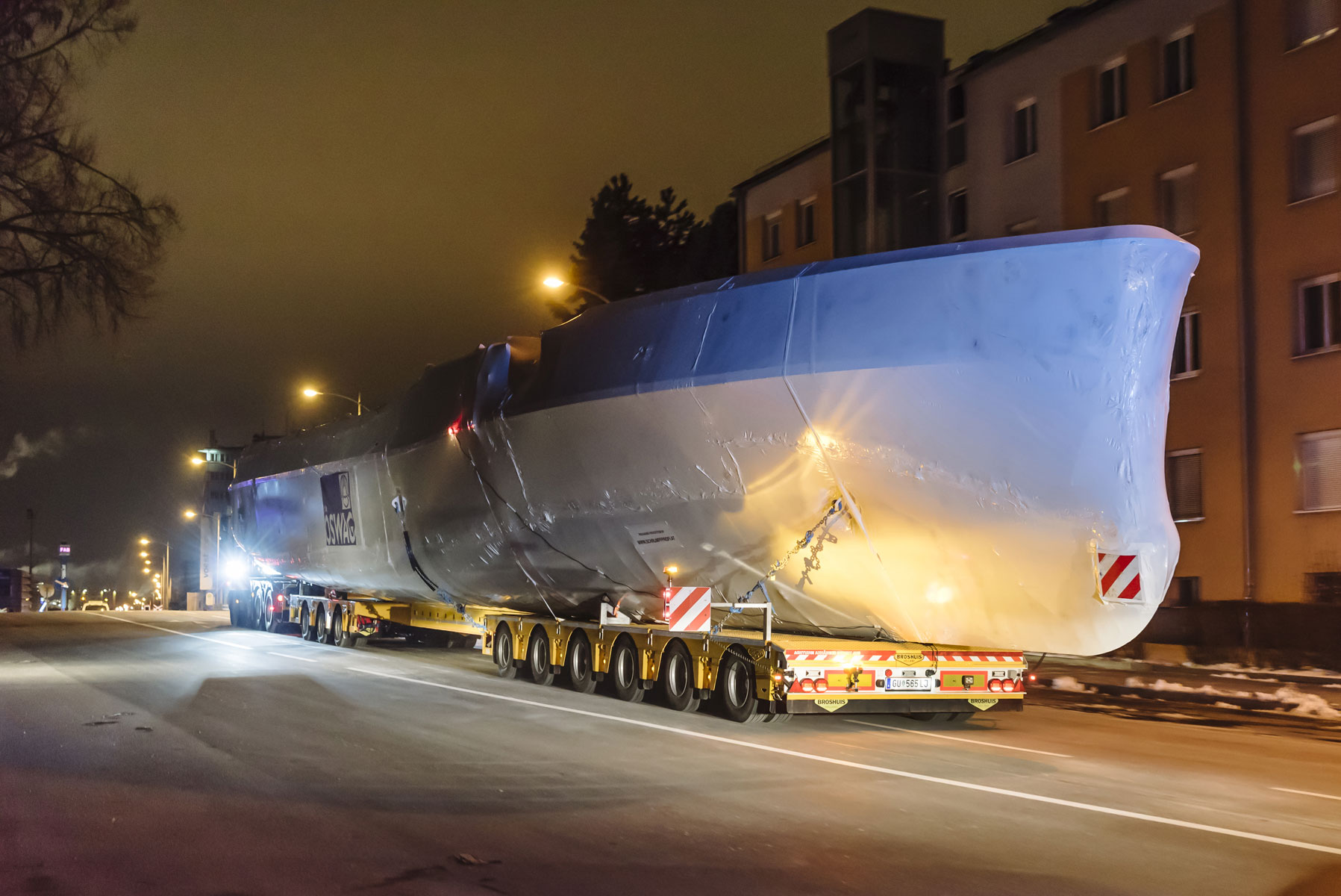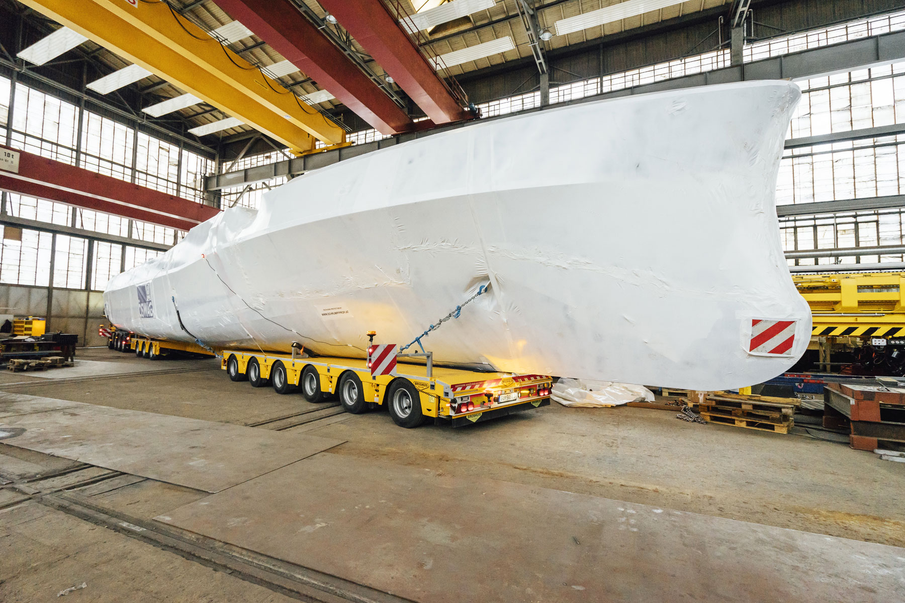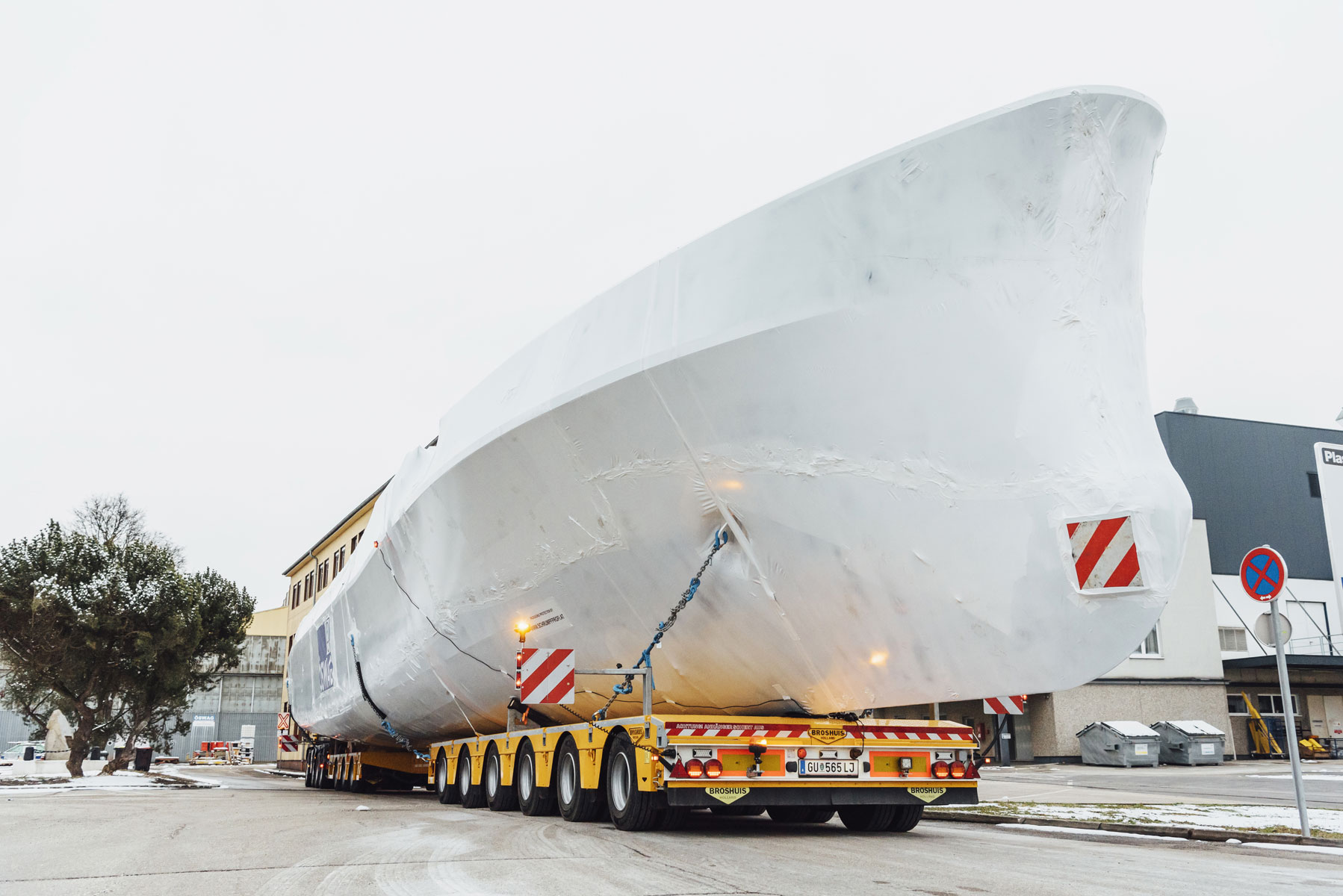 30-metarski trup izletničkog broda podignut je na opremu za teški transport u proizvodnoj hali. Zbog ogromnih proporcija ukupna dužina je iznosila 38 metara, širina 5,3 metra, a sveukupna težina iznosila je čak 104 tone. Gornja paluba od „samo“ 25 metara kompoziciji je pridodala dodatnih 40 tona. Pošto najbolje uvijek dolazi na kraju, pored navedenog, morali smo isporučiti još kormilarnicu, pogon i svu dodatnu opremu. Kako bi svi dijelovi stigli na svoje odredište sveukupno su bila potrebna tri odvojena transporta.
