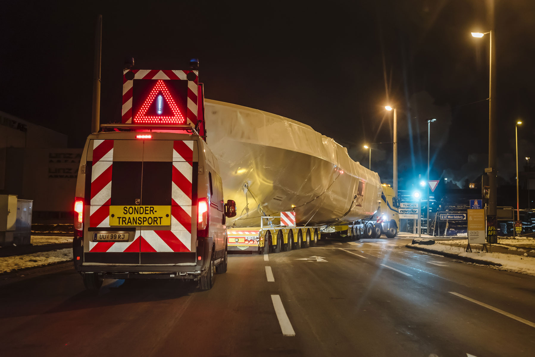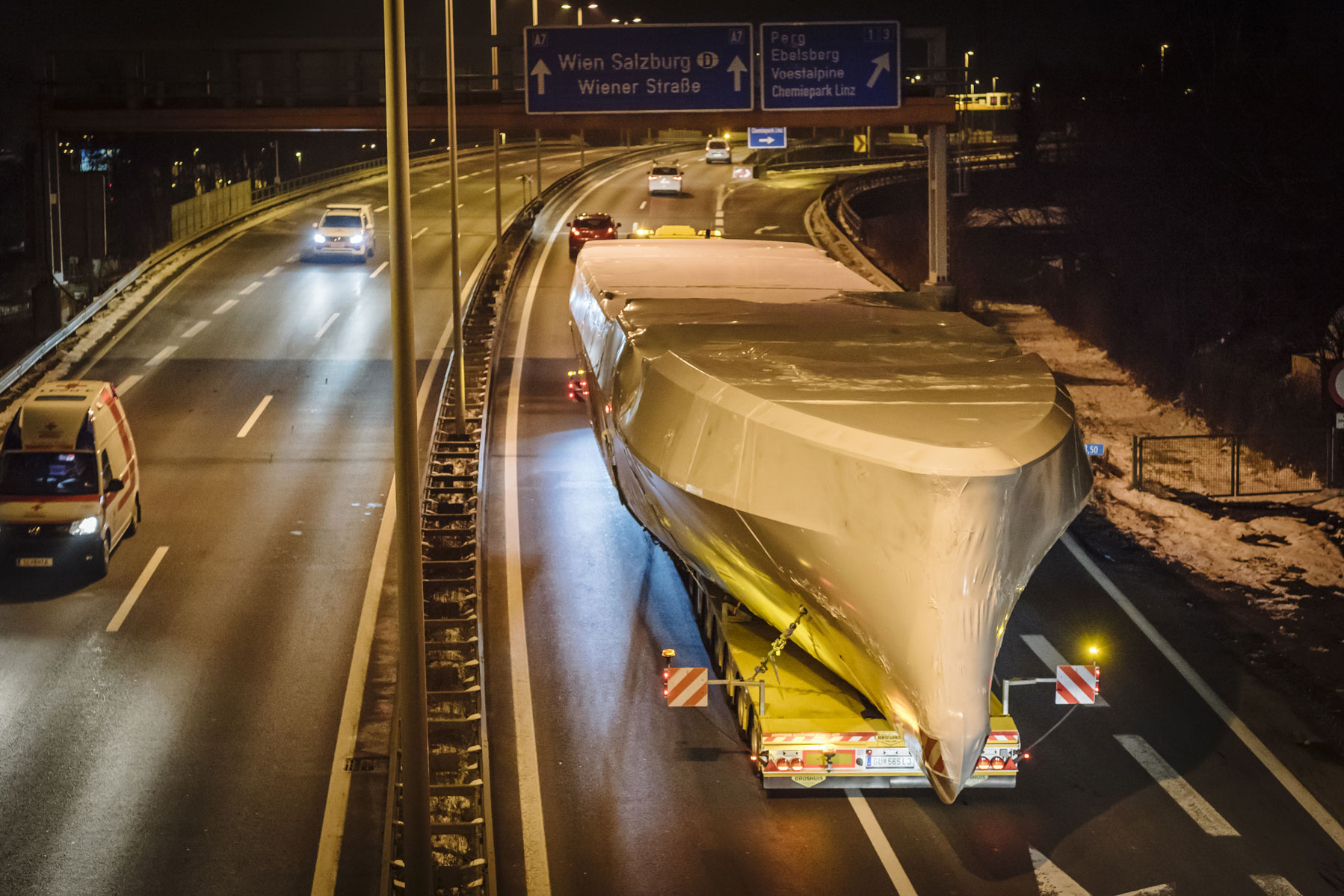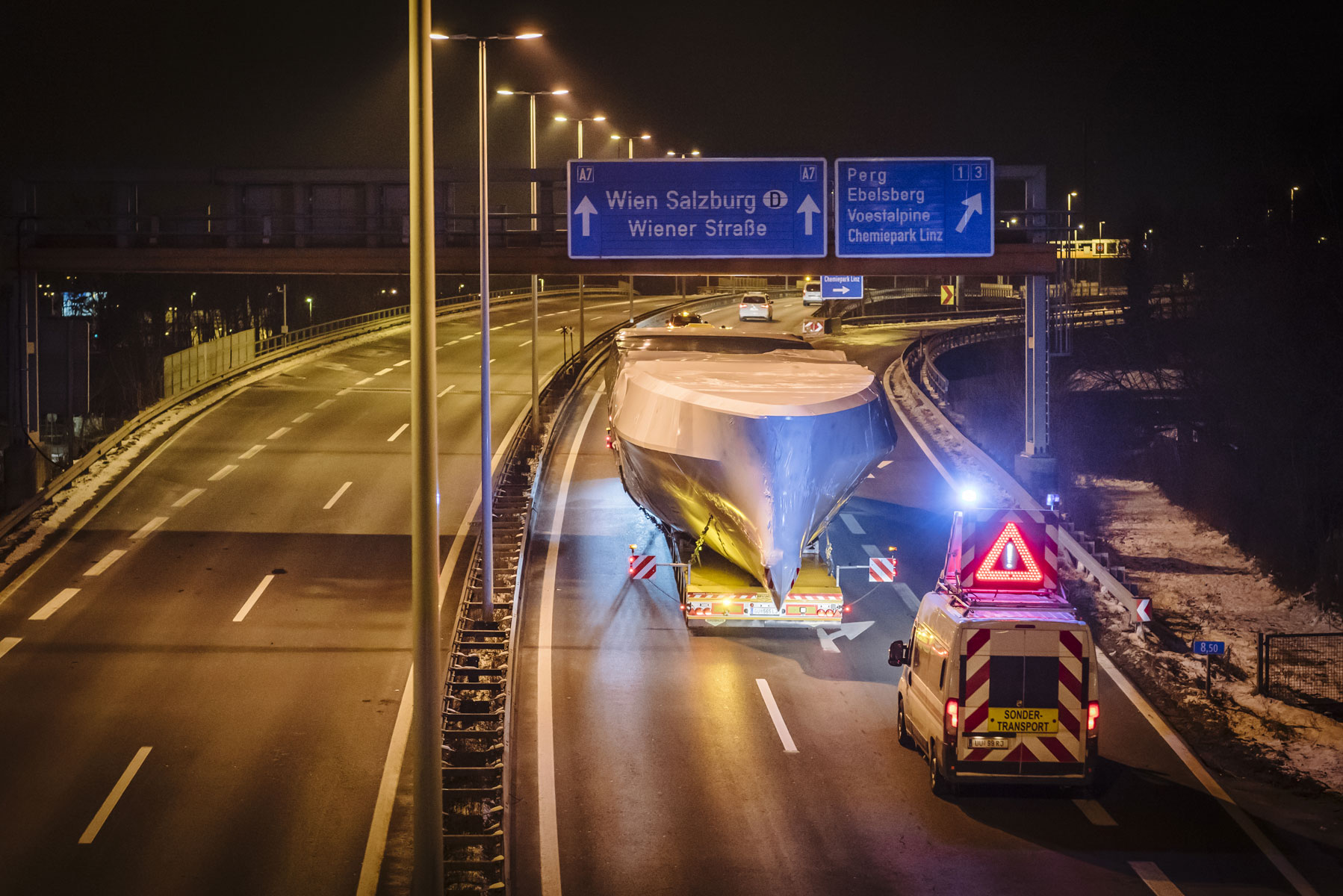 Najveći element, trup, transportiran je s 4-osovinskim vozilom za prijevoz teških tereta i 9-osovinskom niskopodnom poluprikolicom. Gornja paluba, kormilarnica, pogon i dodana oprema prevezeni su 3-osovinskim vozilom za prijevoz teških tereta i 4-osovinskom poluprikolicom s ravnim platoom. Cjelokupnu rutu nije bilo moguće prevoziti u jednom konvoju. Zbog velikih dimenzija konvojski prijevoz nije bio odobren na svim trasama. Na nekim područjima tri transportna vozila morala su voziti po različitim rutama. Unatoč tome, stručnjaci iz tvrtke Prangl zadržali su pregled nad projektom. Zahvaljujući temeljitom planiranju, cijeli je projekt dovršen na vrijeme i na potpuno zadovoljstvo svih sudionika.