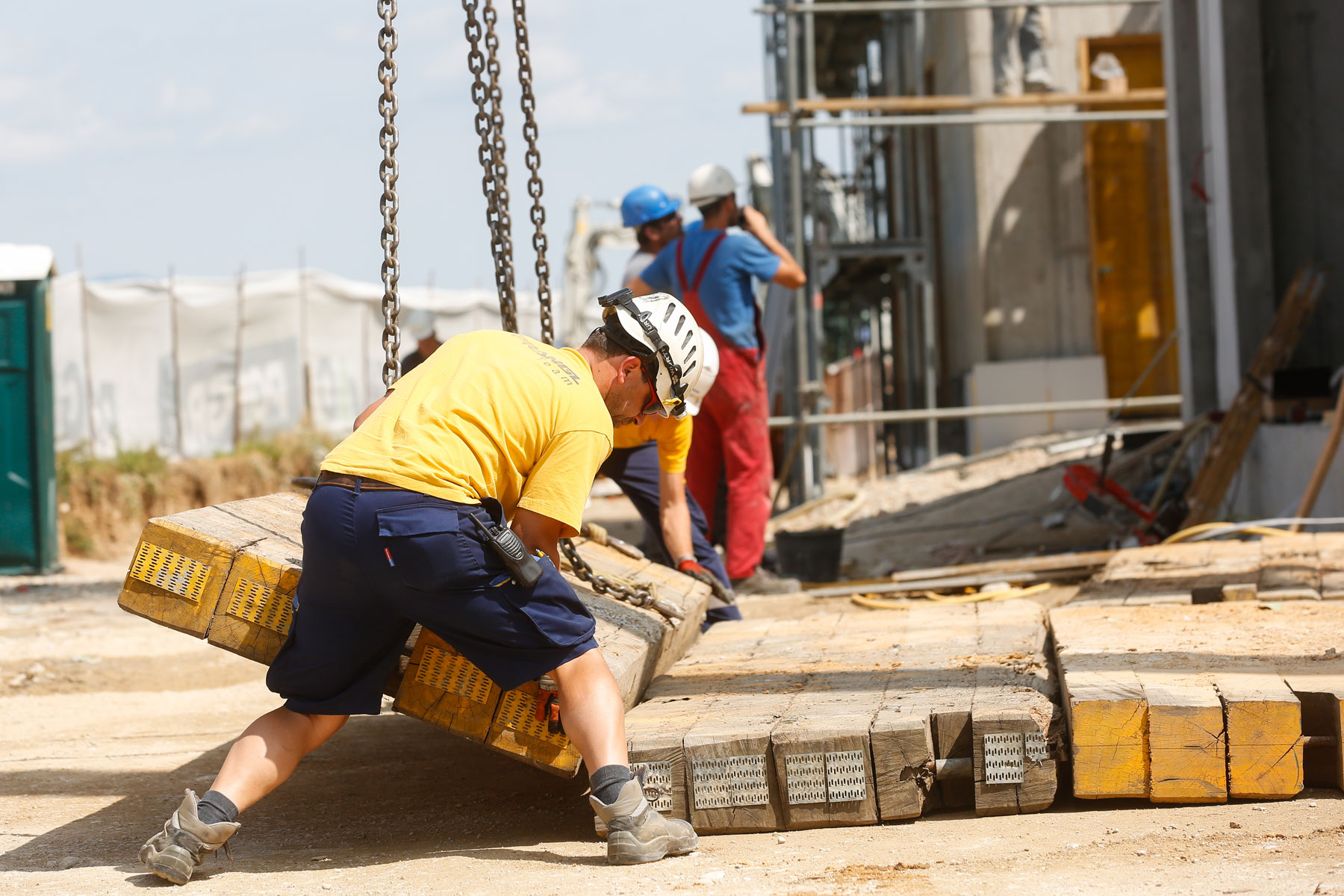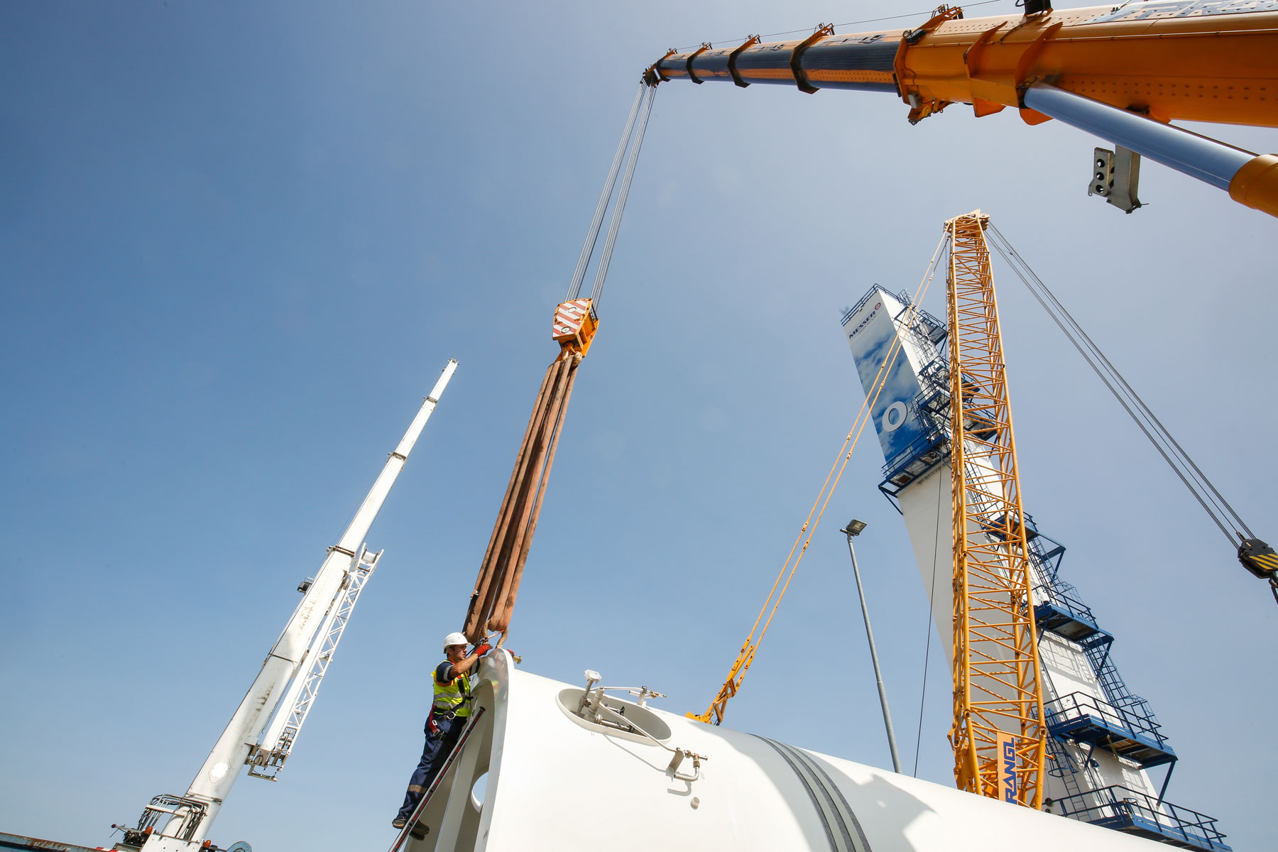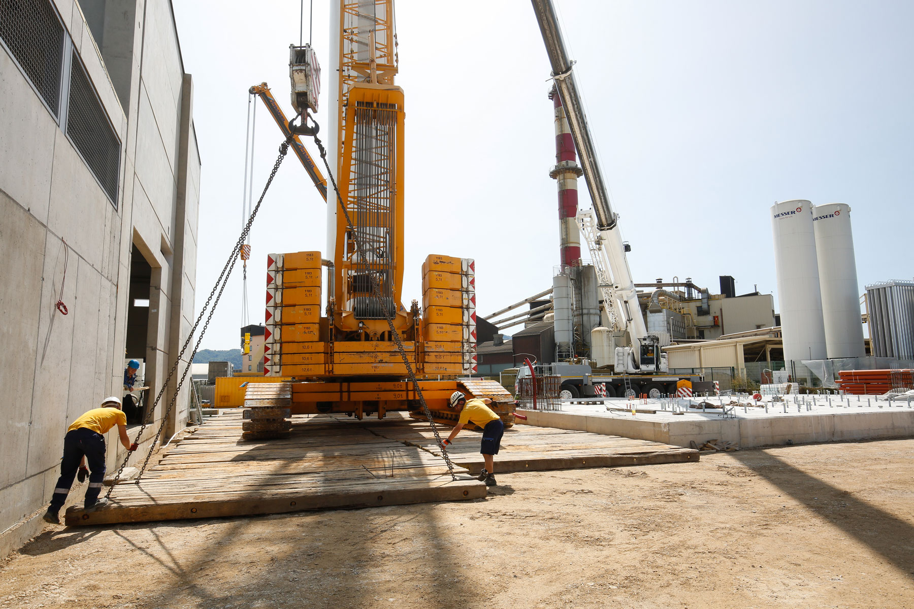 S obzirom na izuzetno skučene prostorne okolnosti, ovaj je zadatak bio poseban izazov. Prije svega je bilo izazovno podizanje prvog spremnika, koji je trebalo podići i vertikalno podignutog voziti čak 60 metara, kako bismo ga mogli pravilno odložiti i montirati. U uporabi je bila dizalica na gusjenicama koja teži 280 tona, dvije teleskopske dizalice, jedna je težila 200 tona, a druga od 100 tona, kao i teleskopski viličar. Zbog ograničenih mogućnosti upravljanja teretom dizalica na gusjenicama bila je jedino razumno rješenje.