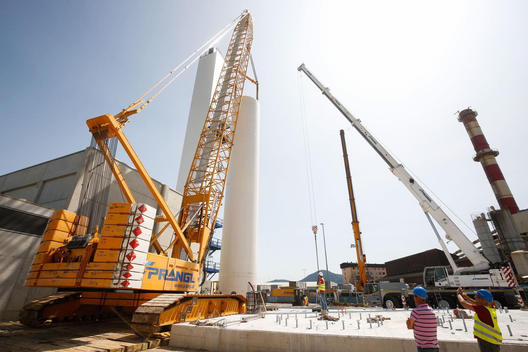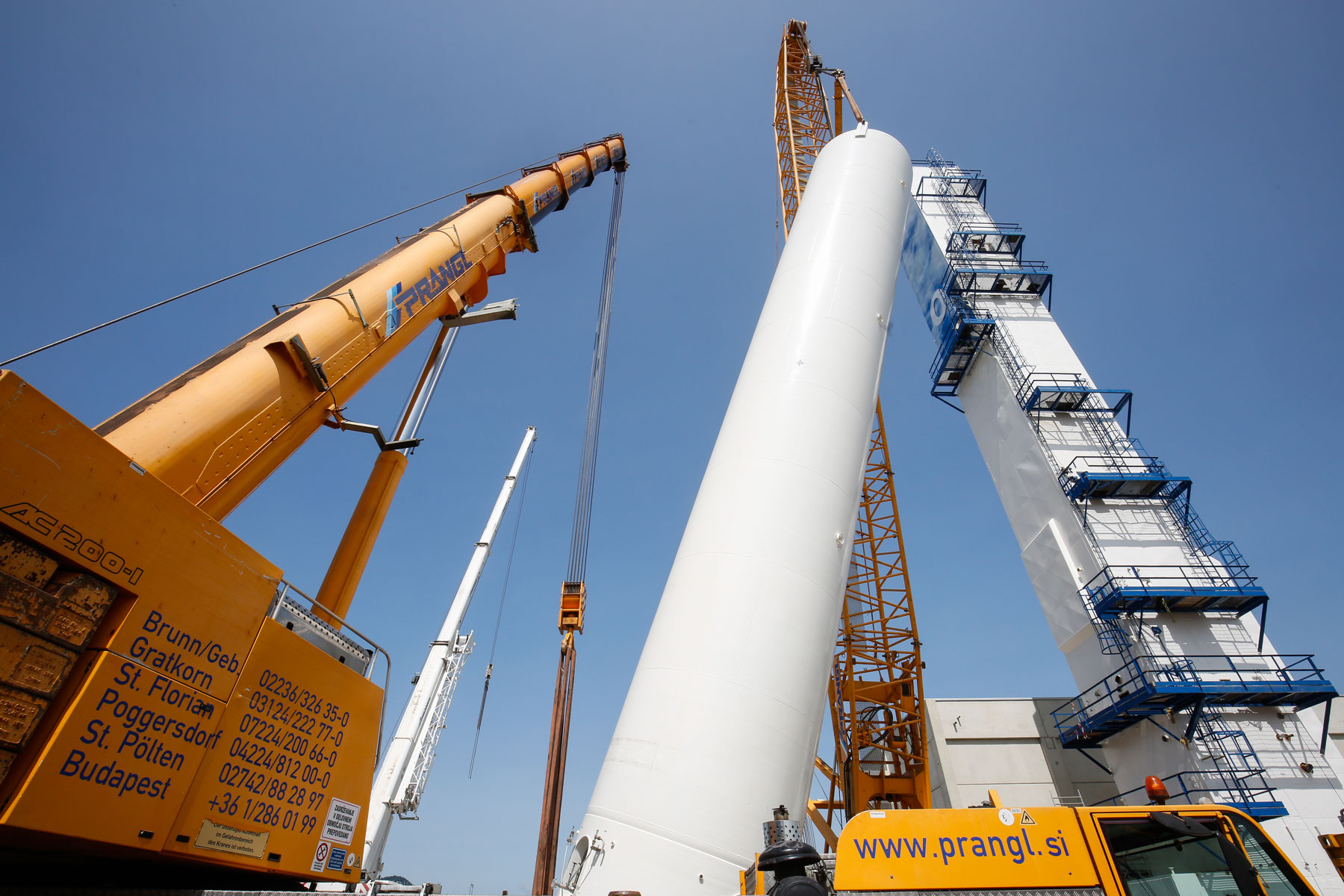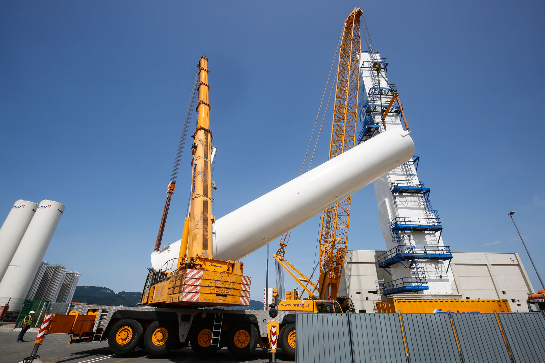 Zbog prostornog ograničenja morali smo naravno unaprijed izraditi točan plan gdje možemo postaviti koju dizalicu. Konačno, najznačajnije je bilo da ne smetamo i ne prekidamo sve druge procese i aktivnosti. Osim toga, stranka je predložila vrlo kratke rokove, koje nikako nismo smjeli prijeći. Zahvaljujući dobroj pripremi cijele ekipe tvrtke Prangl, sva tri spremnika pravovremeno su postavljena na svoje mjesto. Savršena prekogranična suradnja između tvrtke Prangl Slovenija i tvrtke Prangl Austrija također pokazuje da se uvijek možete pouzdati u kvalitetu žute boje - bez obzira na zemlju.