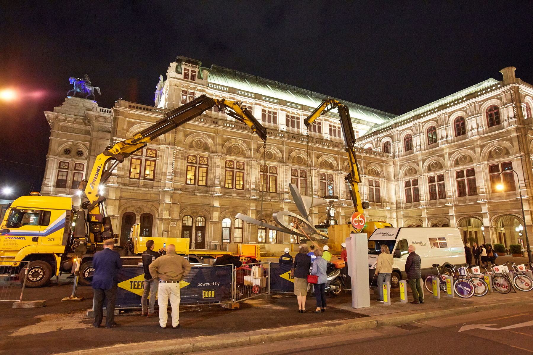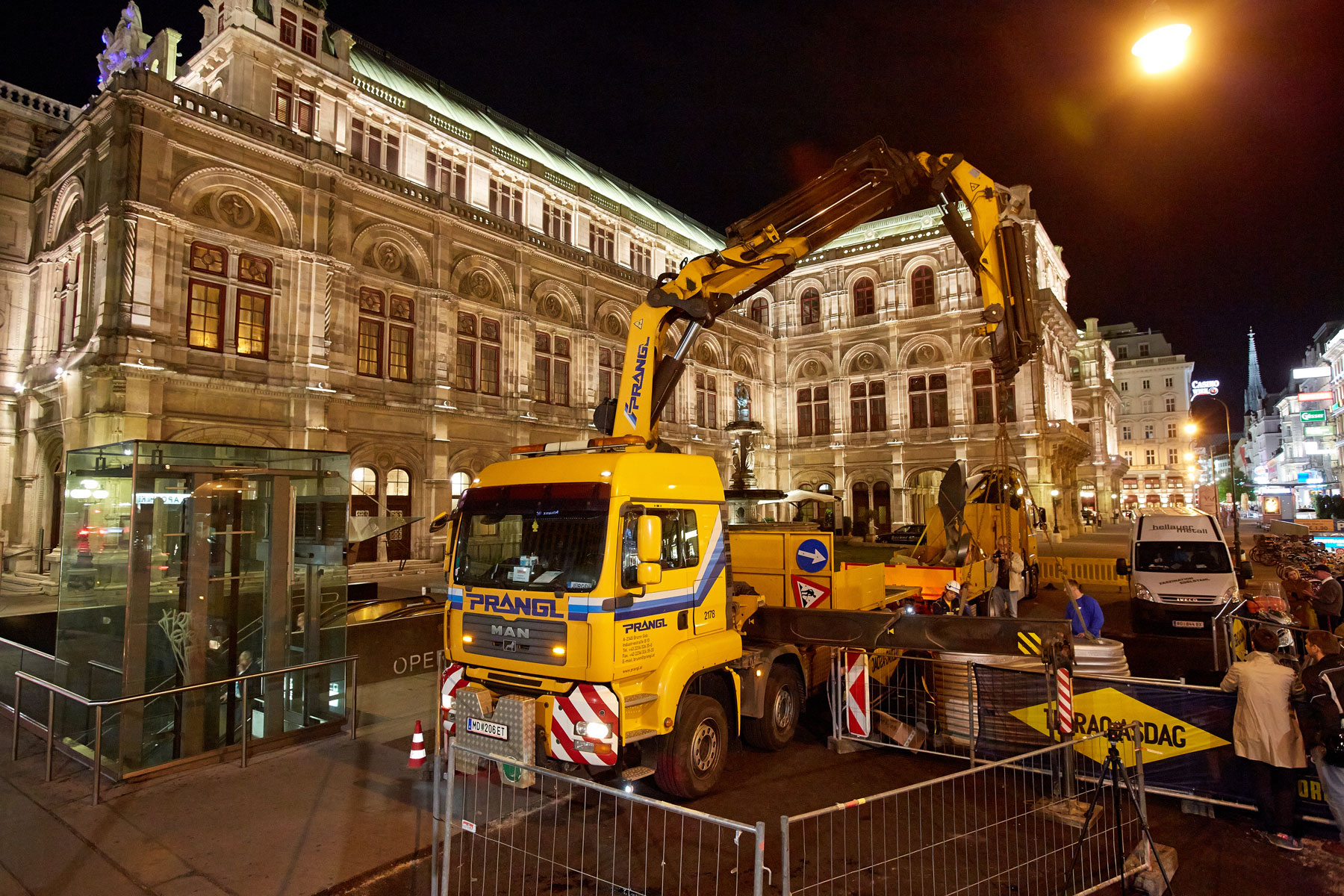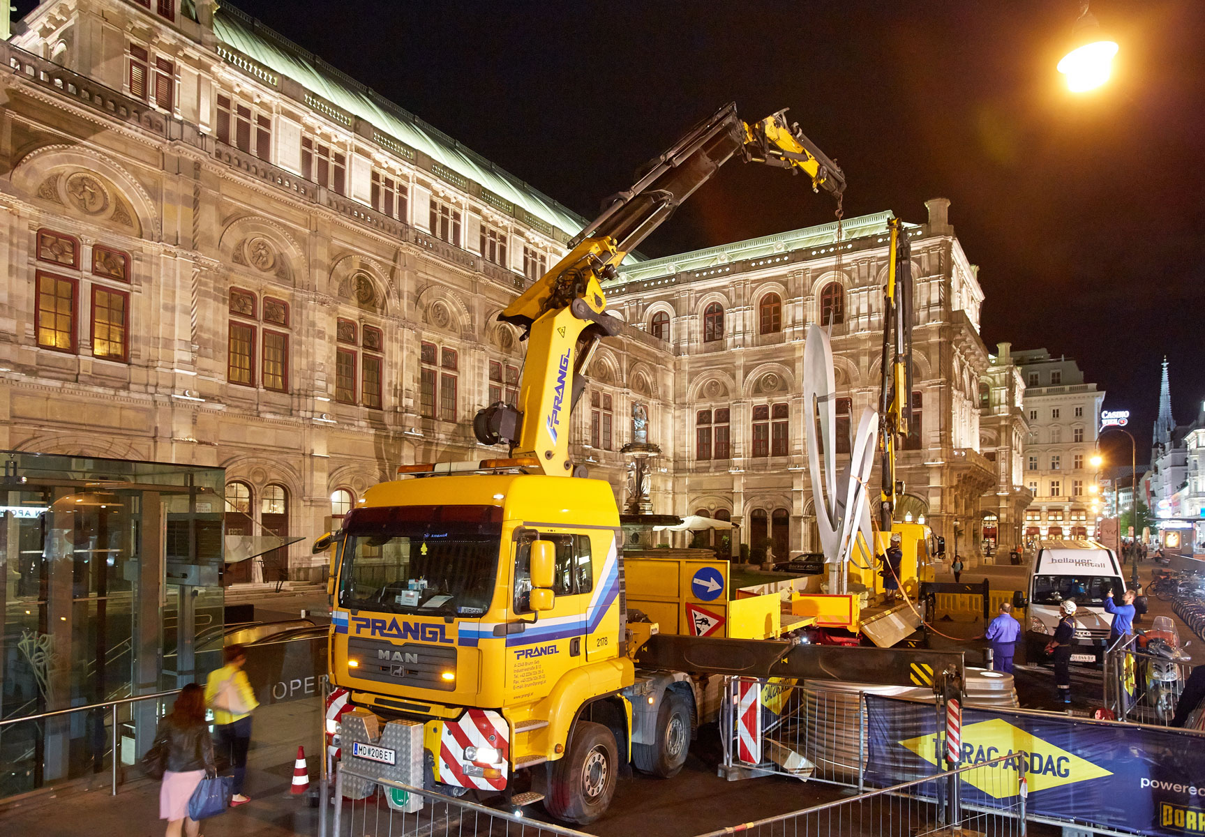 Stručnjaci iz tvrtke Prangl odlučili su se za ovu vrstu koncepta jer je radni prostor ispred Bečke državne opere ograničen. Još jedan razlog za dvije utovarne dizalice bila je njihova fleksibilnost i upravljivost - uostalom, podizanje je moralo biti dovršeno u vrlo kratkom roku. Zahvaljujući temeljitim pripremnim radovima, iskustvima iz drugih poslova na trgu Herbert-von-Karajan i preciznom radu na licu mjesta, ovaj je umjetnički projekt također uspješno završen na puno zadovoljstvo svih sudionika.