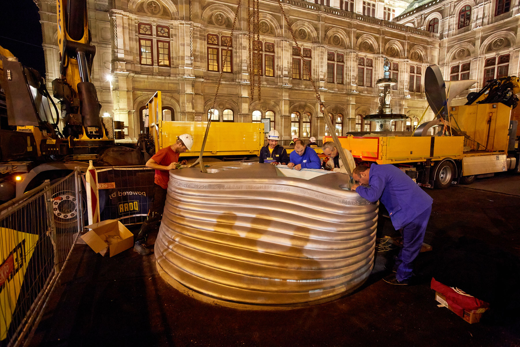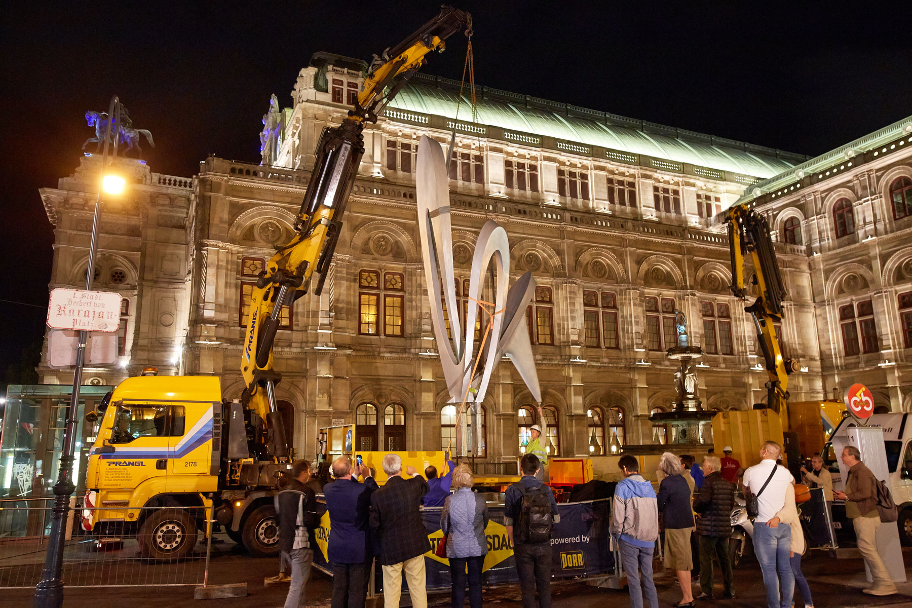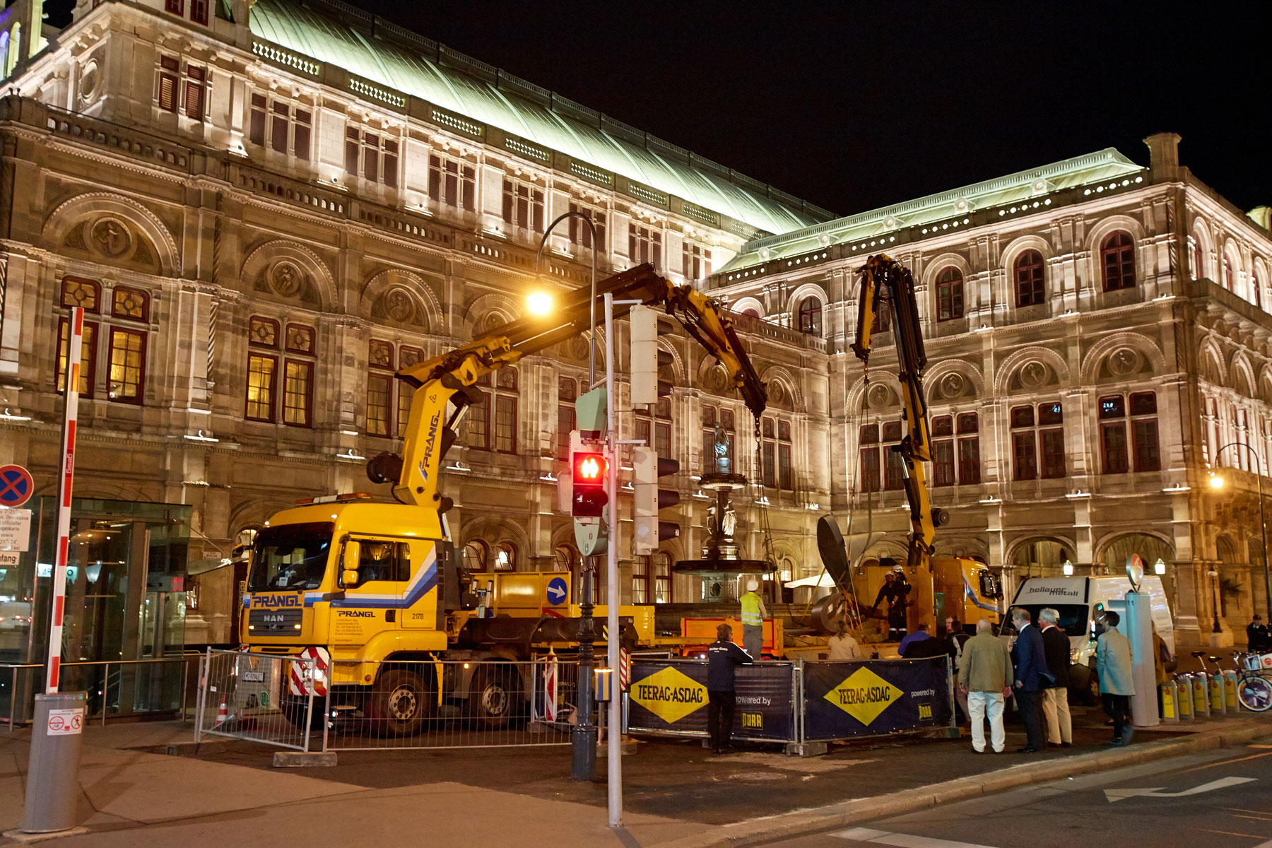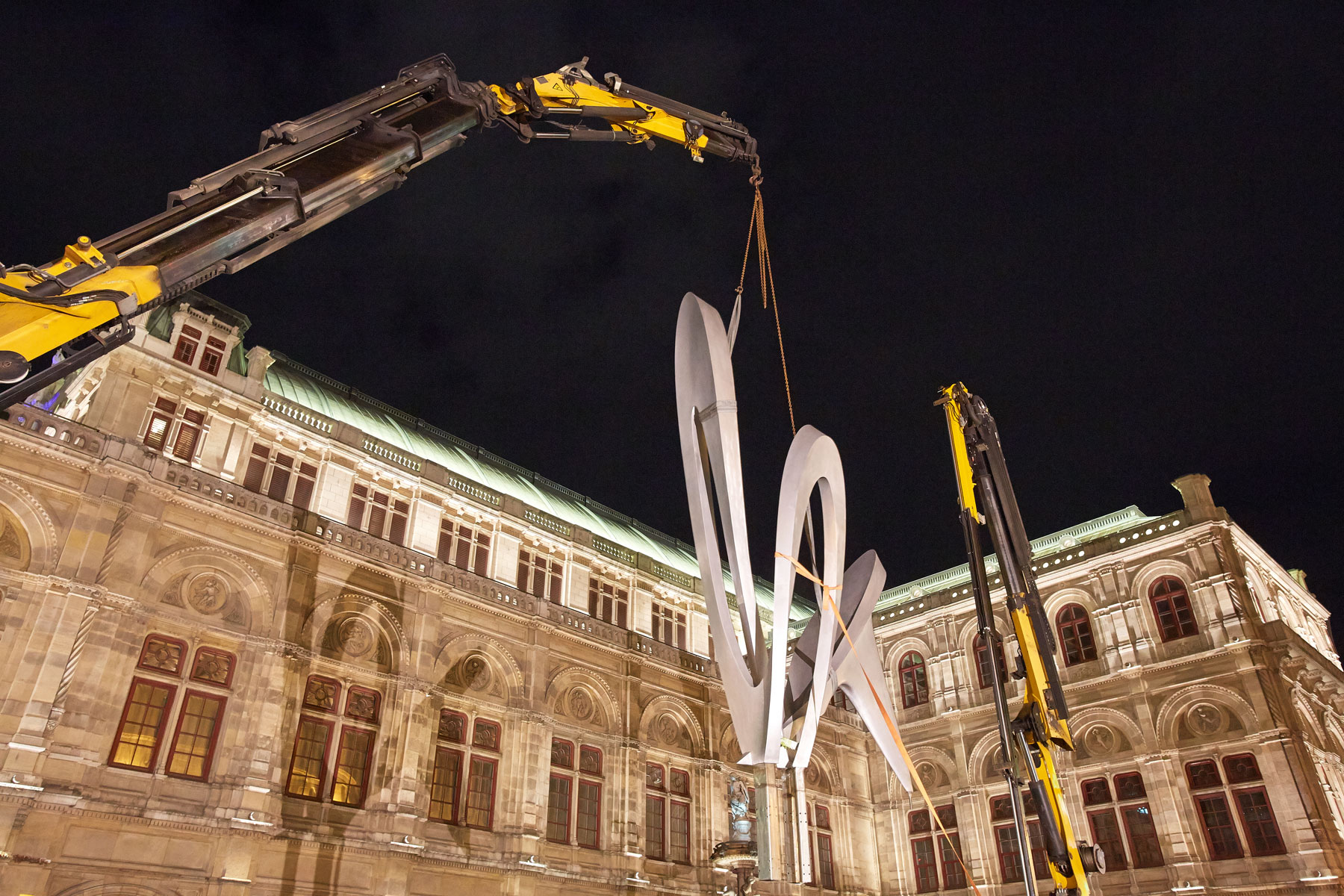 Stručnjaci iz tvrtke Prangl odlučili su se za ovu vrstu koncepta jer je radni prostor ispred Bečke državne opere ograničen. Još jedan razlog za dvije utovarne dizalice bila je njihova fleksibilnost i upravljivost - uostalom, podizanje je moralo biti dovršeno u vrlo kratkom roku. Zahvaljujući temeljitim pripremnim radovima, iskustvima iz drugih poslova na trgu Herbert-von-Karajan i preciznom radu na licu mjesta, ovaj je umjetnički projekt također uspješno završen na puno zadovoljstvo svih sudionika.