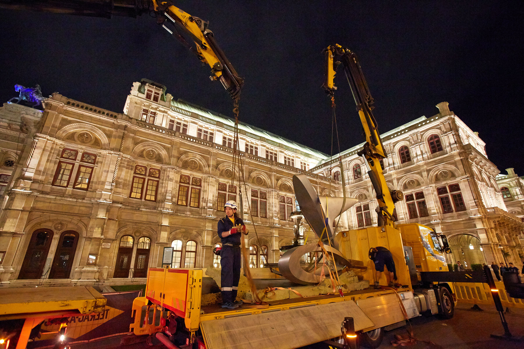 Zbog niske visine utovarnog prostora od 1,0 metra, utovarna dizalica teška 34 metra na motornom vozilu bila je pravo vozilo za prijevoz ove skulpture. Istovremeno, podnožje je do Beča prevezeno teretnom dizalicom teškom 85 tona. Ali ne prijevoz, već je postavljanje skulpture bilo posebno: Apsolutna osobitost ove operacije bila je u tome što je istovremeno podignuta s dvije dizalice za utovar. Tandemsko podizanje je za utovarne dizalice prilično neobično.