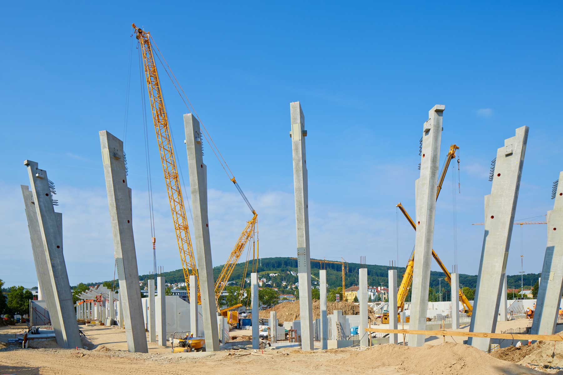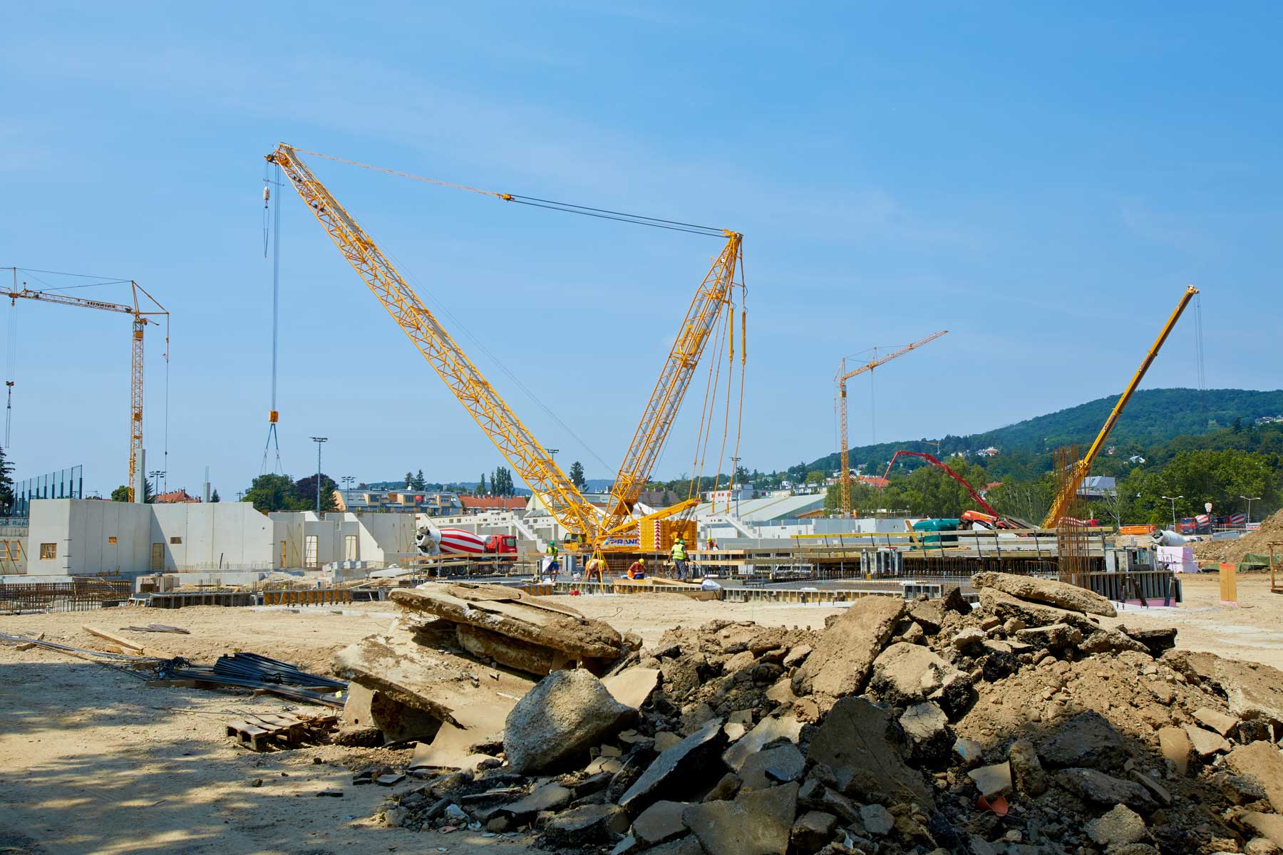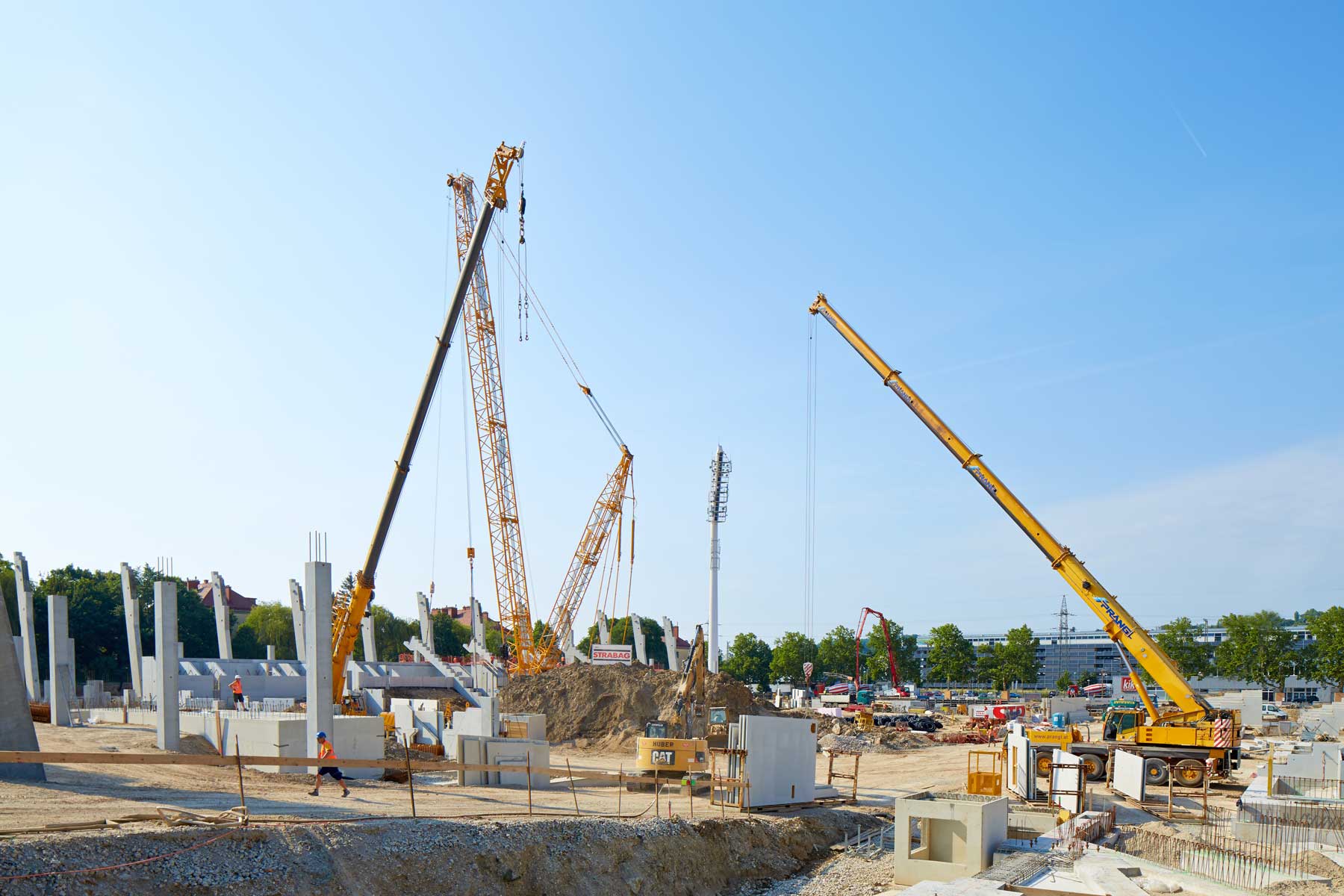 Na početku su postavljeni stupovi duljine 18 metara do 44 tone, nosači duljine 23 metra koji su težili 39 tona te paneli tribina dugi 10 metara koji su težili 15 tona. Uz to su podignuti stropovi i zidovi. Nekoliko strojeva tvrtke Prangl - majstora za dizanje teških tereta - istodobno je bilo u upotrebi: dizalica na gusjenicama koja teži 400 tona, teleskopska dizalica koja teži 100 tona, teleskopska dizalica koja teži 95 tona i teleskopska dizalica koja teži 50 tona.