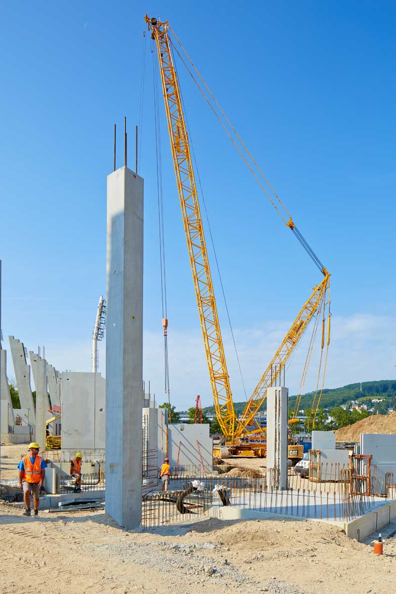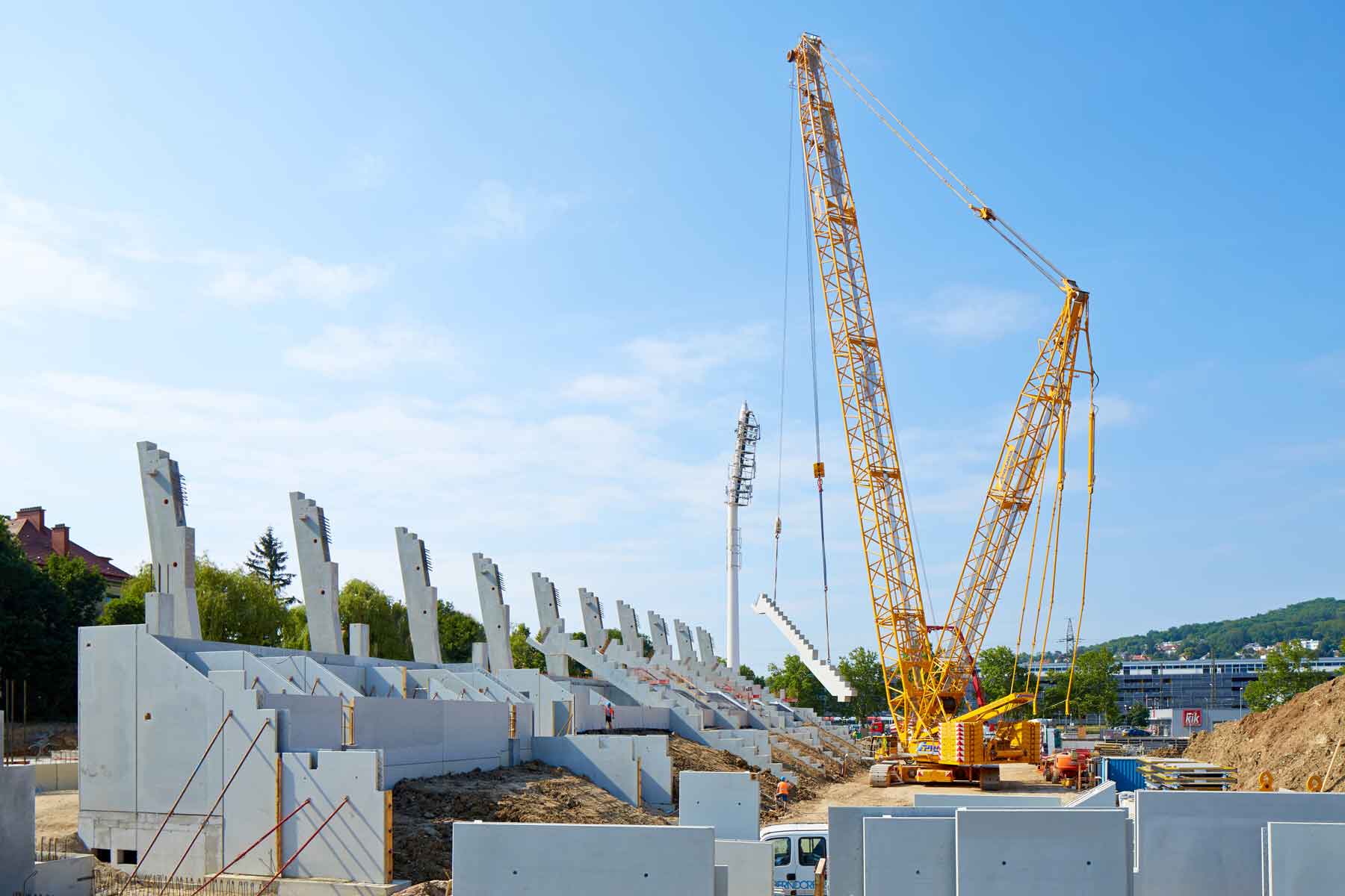 Pogotovo je stroj sa gusjenicama idealno pogodan za pomicanje velikog broja prefabriciranih betonskih elemenata u ekonomski razumnom vremenskom okviru. Kretanjem pod teretom 100 % je zajamčeno optimalno vrijeme postavljanja. Veoma rano smo se za taj koncept odlučili zajedno sa strankom. Ali to nije sve. Tim tvrtke Prangl već priprema početne blokove za sljedeću fazu gradnje: montažu krova tribine. Zbog toga se na licu mjesta oprema ponovno povećava - za najmanje još jednu dodatnu dizalicu (nosivosti 200 tona).