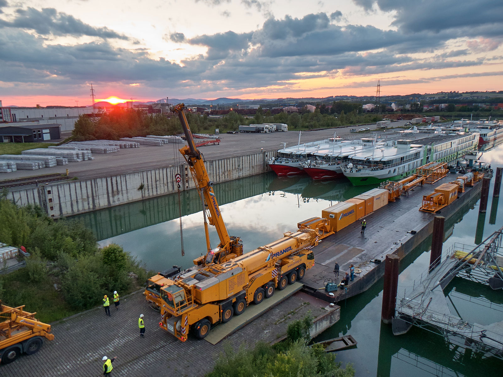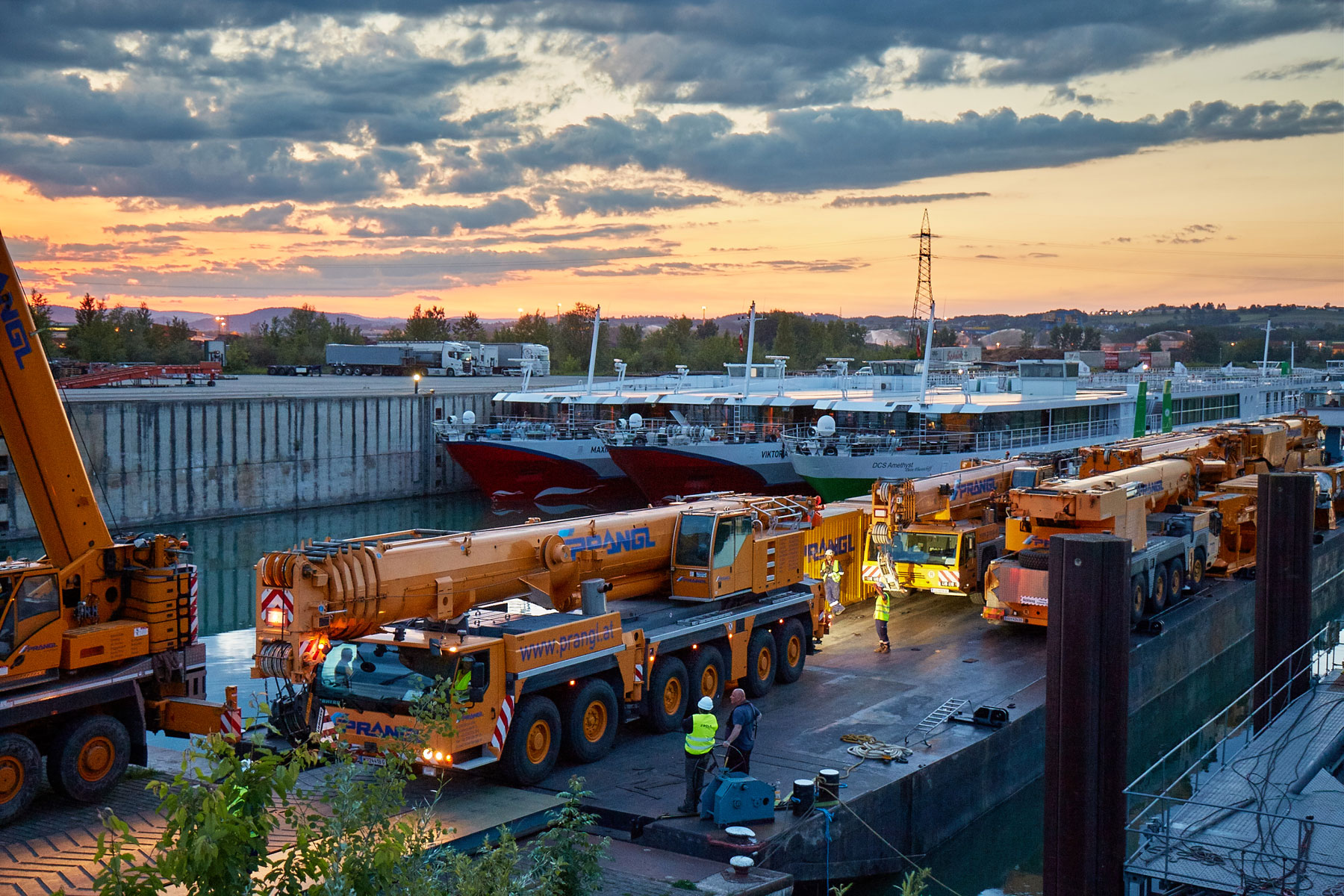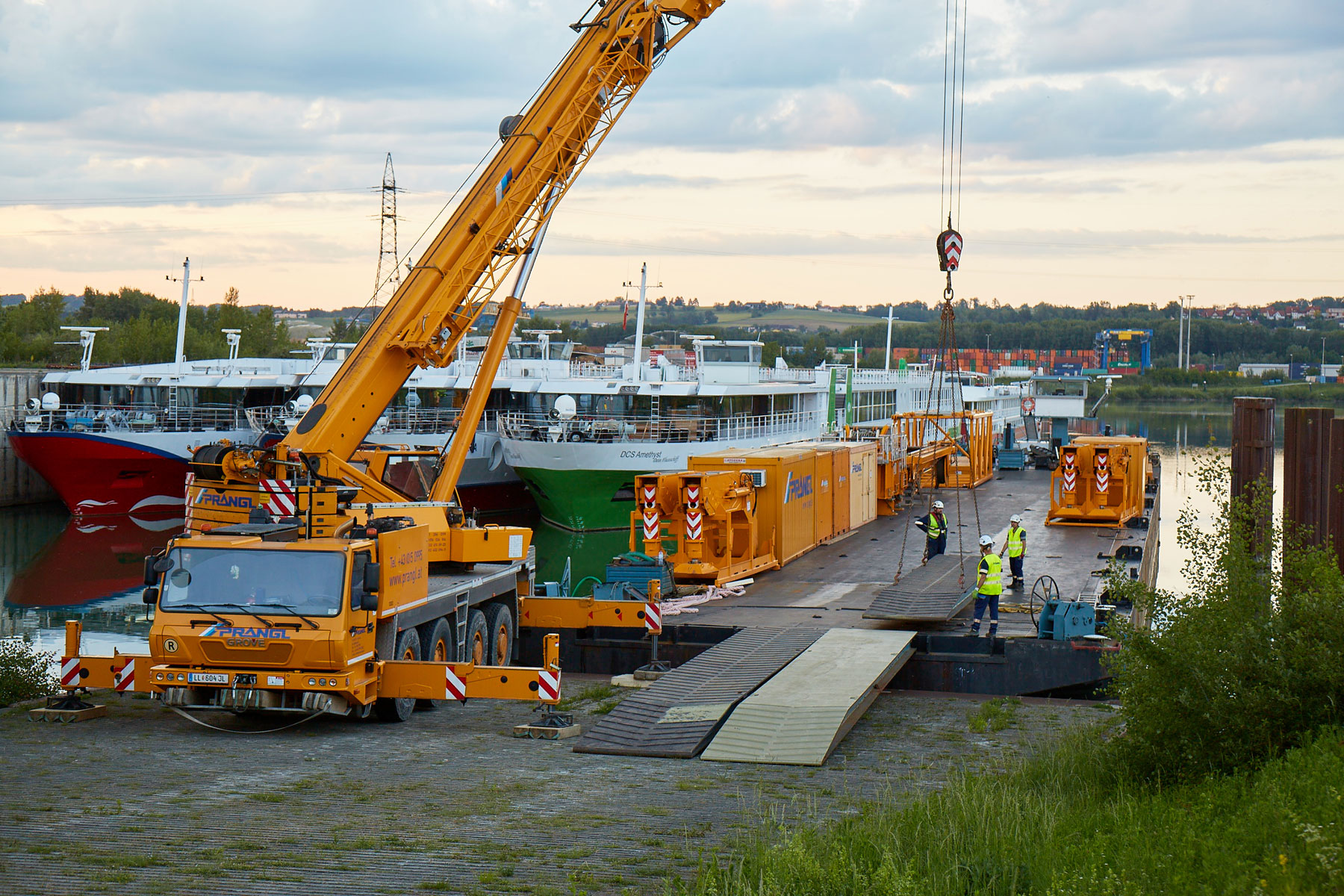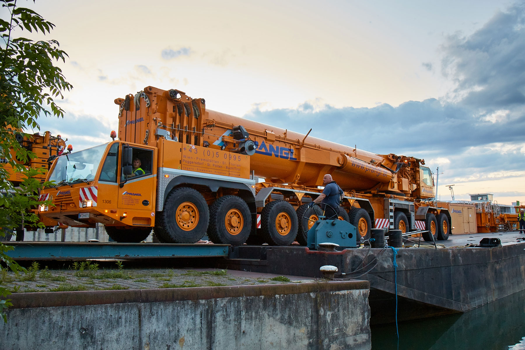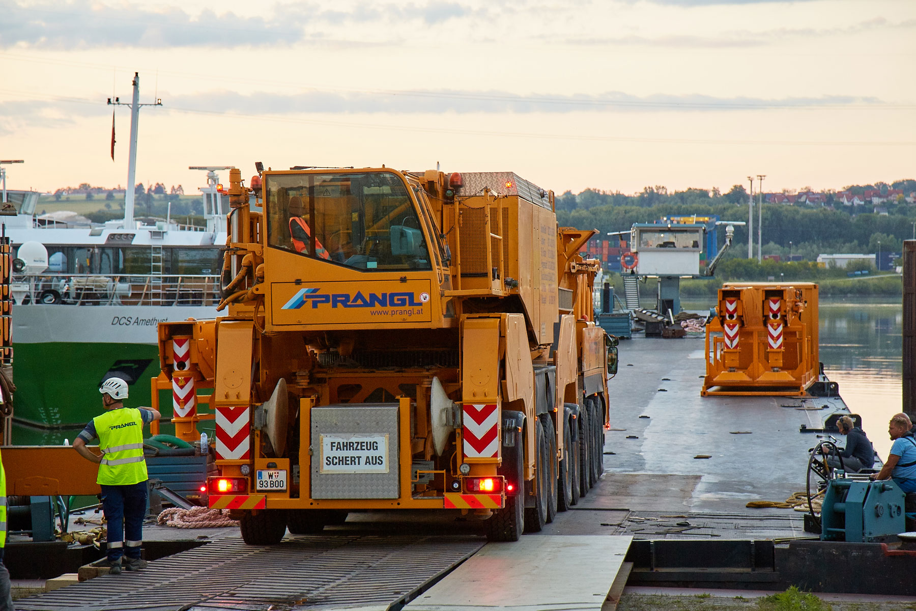 Navedeni paket dizalica isporučili smo multimodalno, i riječnim transportom i cestovnim prijevozom. Prve smo dijelove plovilima riječnog transporta prevezli iz luke Enns u luku Terneuzen (Nizozemska). Potiskivani sastav s RORO teglenicom bio je dugačak 80 metara, a širok 11,5 metara. U luci Enns RORO teglenica najprije se usidrila mobilnom rampom na mol pristaništa, a zatim smo na nju ukrcali mobilne dizalice. Dodatna oprema na brod utovarena je teleskopskom dizalicom koja teži 250 tona.