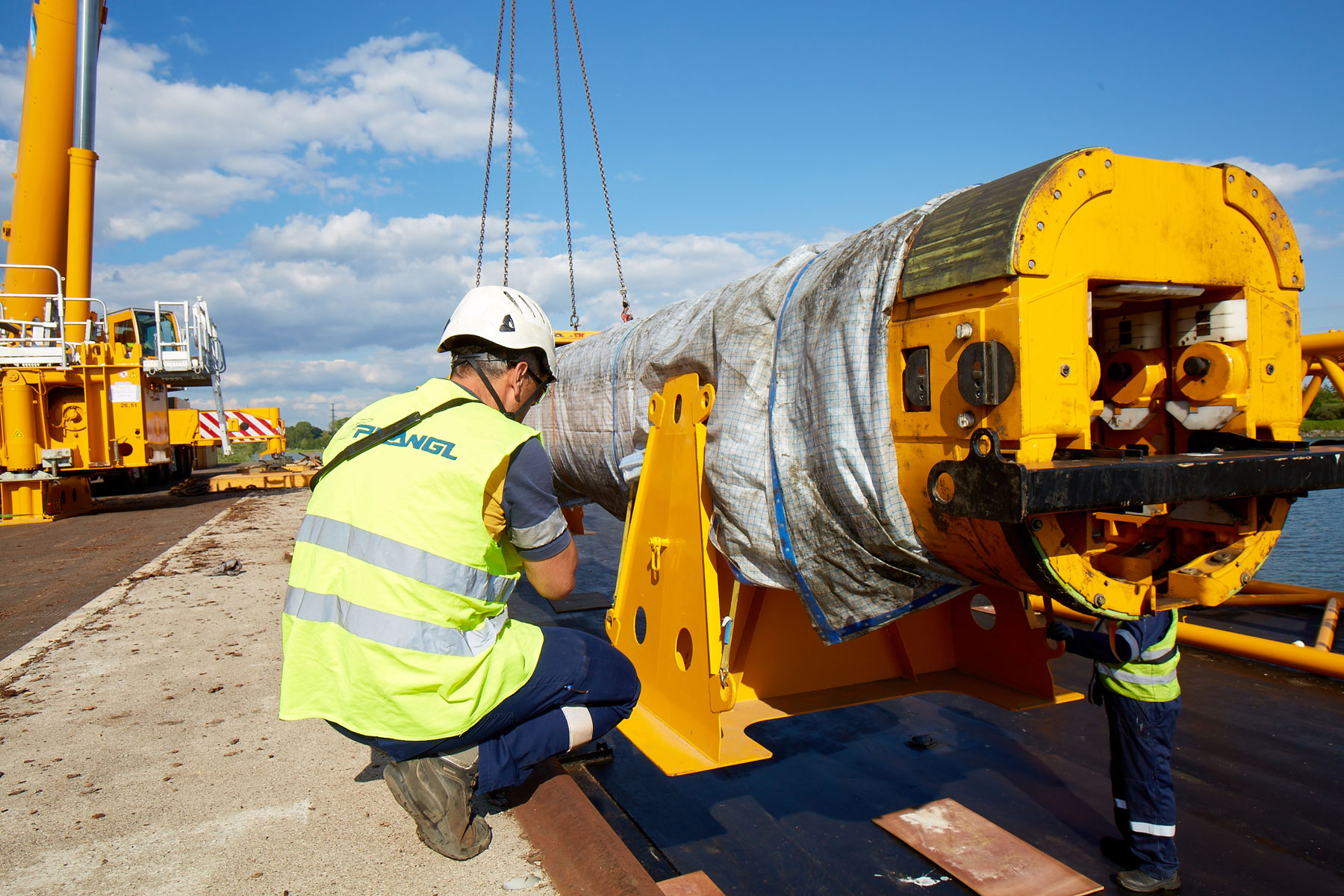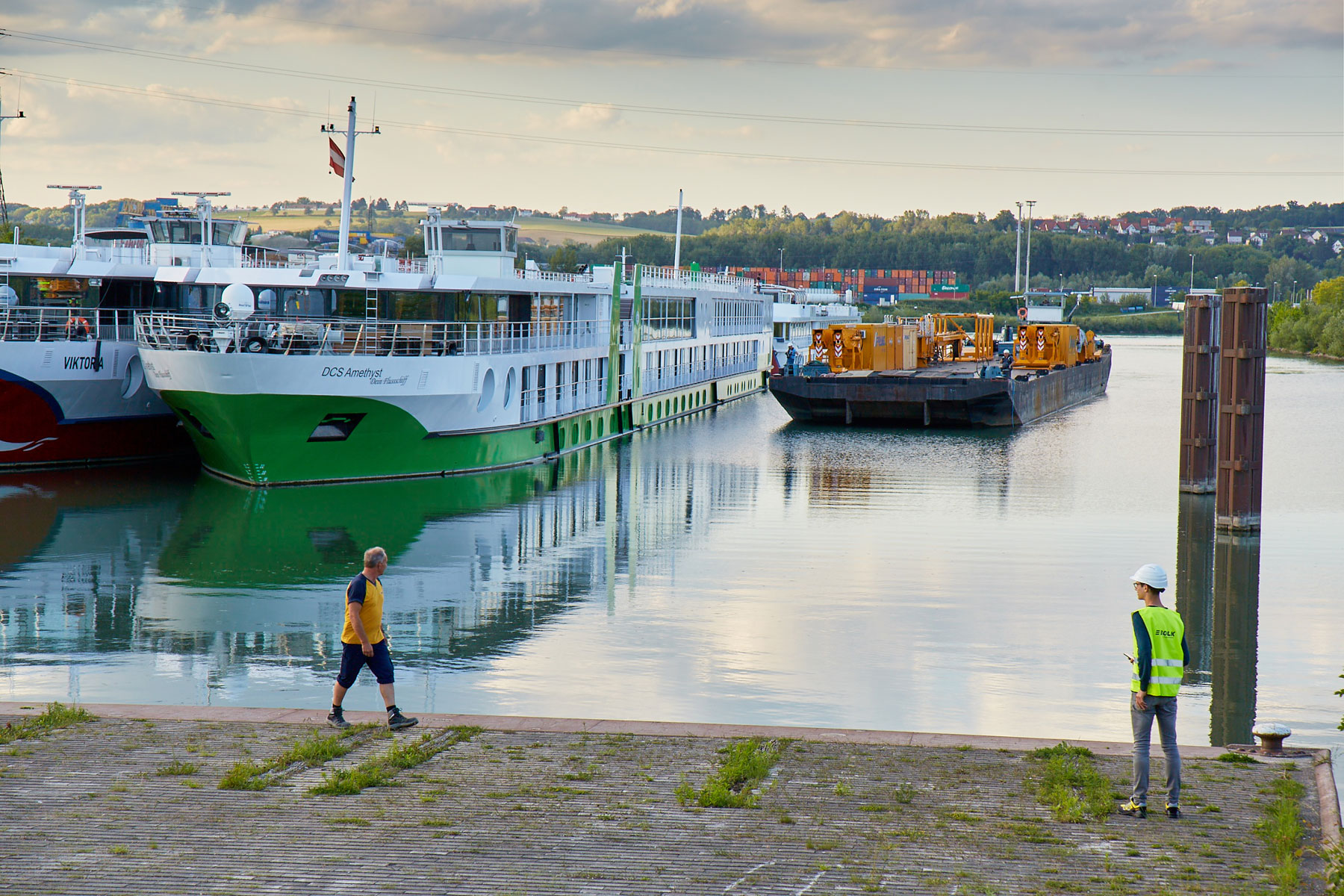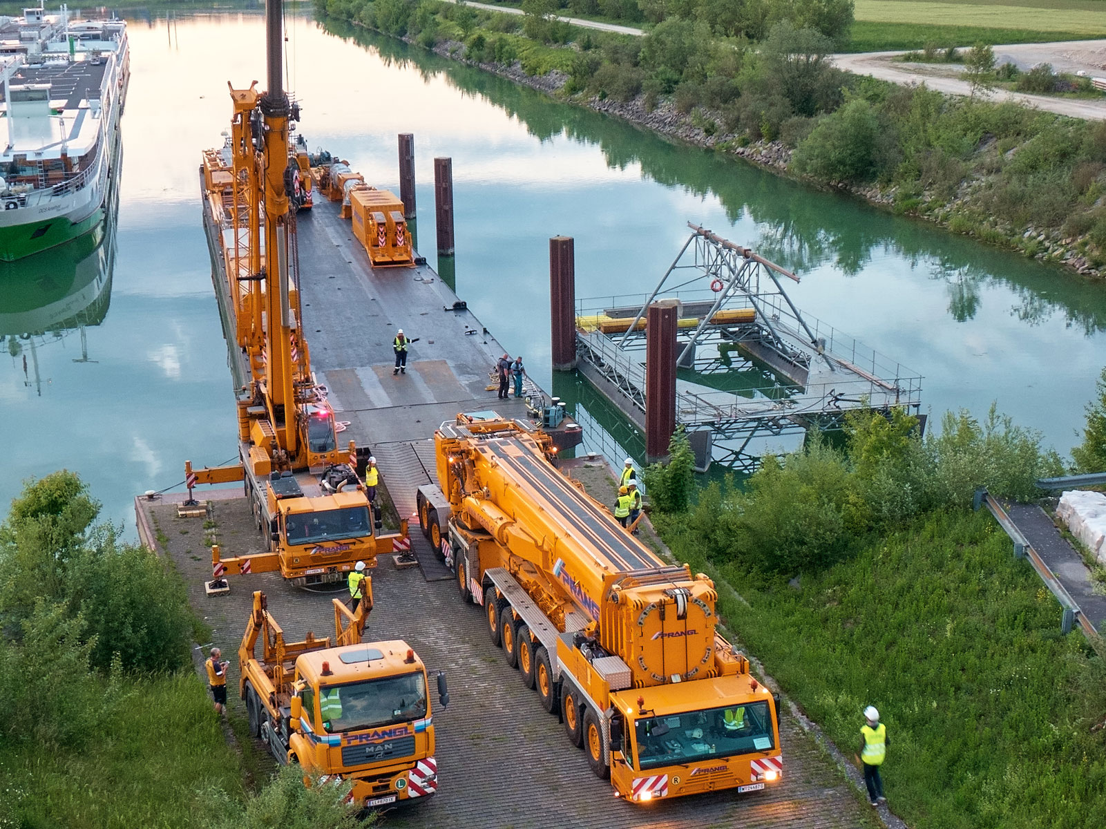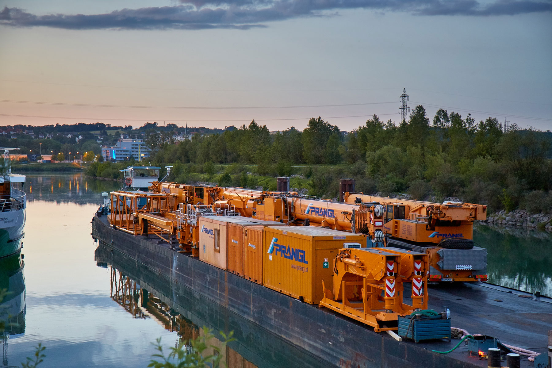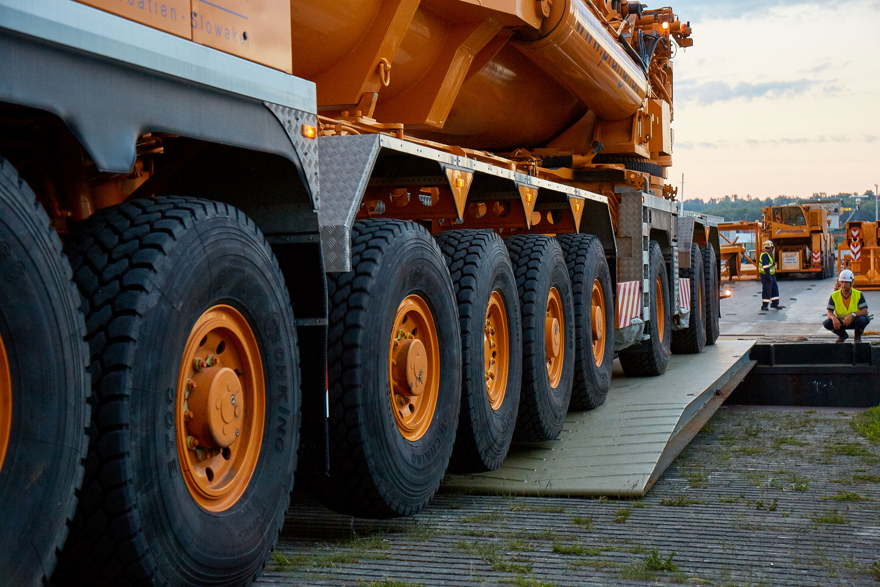Navedeni paket dizalica isporučili smo multimodalno, i riječnim transportom i cestovnim prijevozom. Prve smo dijelove plovilima riječnog transporta prevezli iz luke Enns u luku Terneuzen (Nizozemska). Potiskivani sastav s RORO teglenicom bio je dugačak 80 metara, a širok 11,5 metara. U luci Enns RORO teglenica najprije se usidrila mobilnom rampom na mol pristaništa, a zatim smo na nju ukrcali mobilne dizalice. Dodatna oprema na brod utovarena je teleskopskom dizalicom koja teži 250 tona.