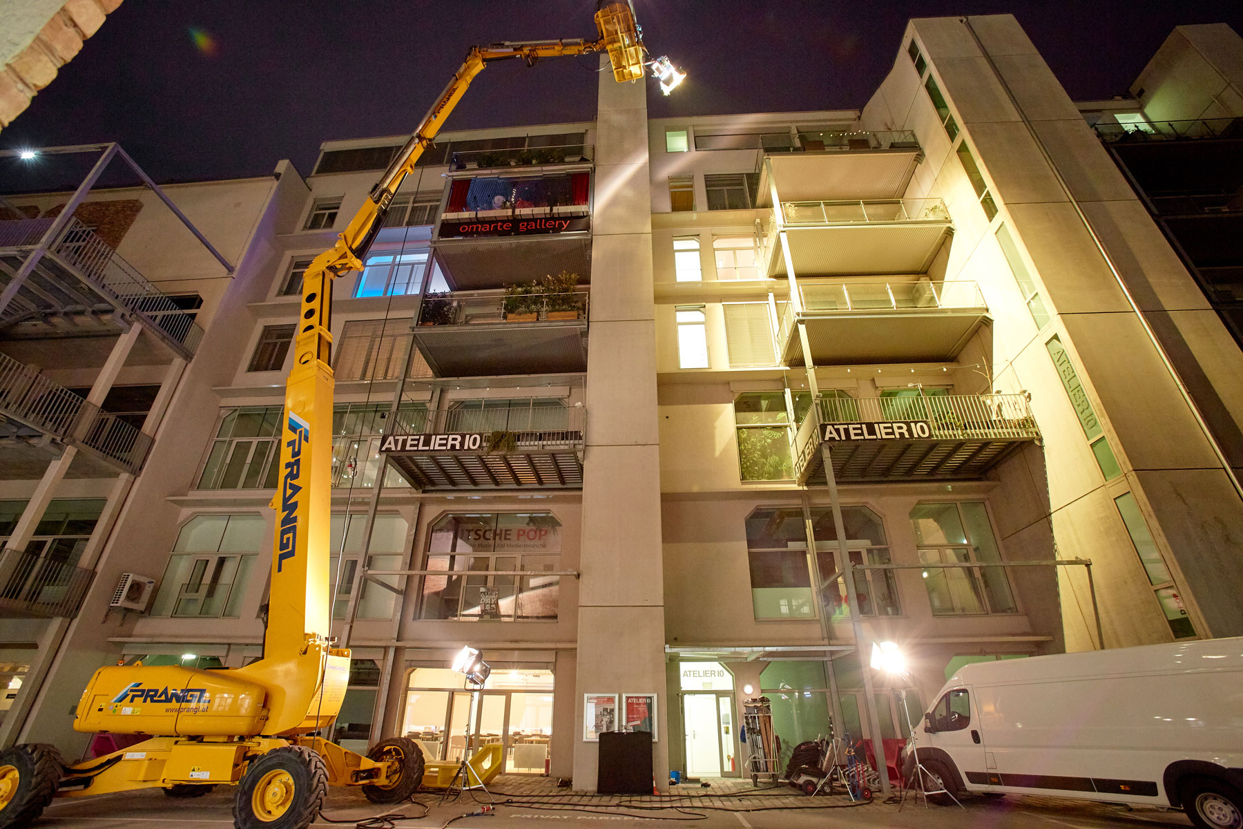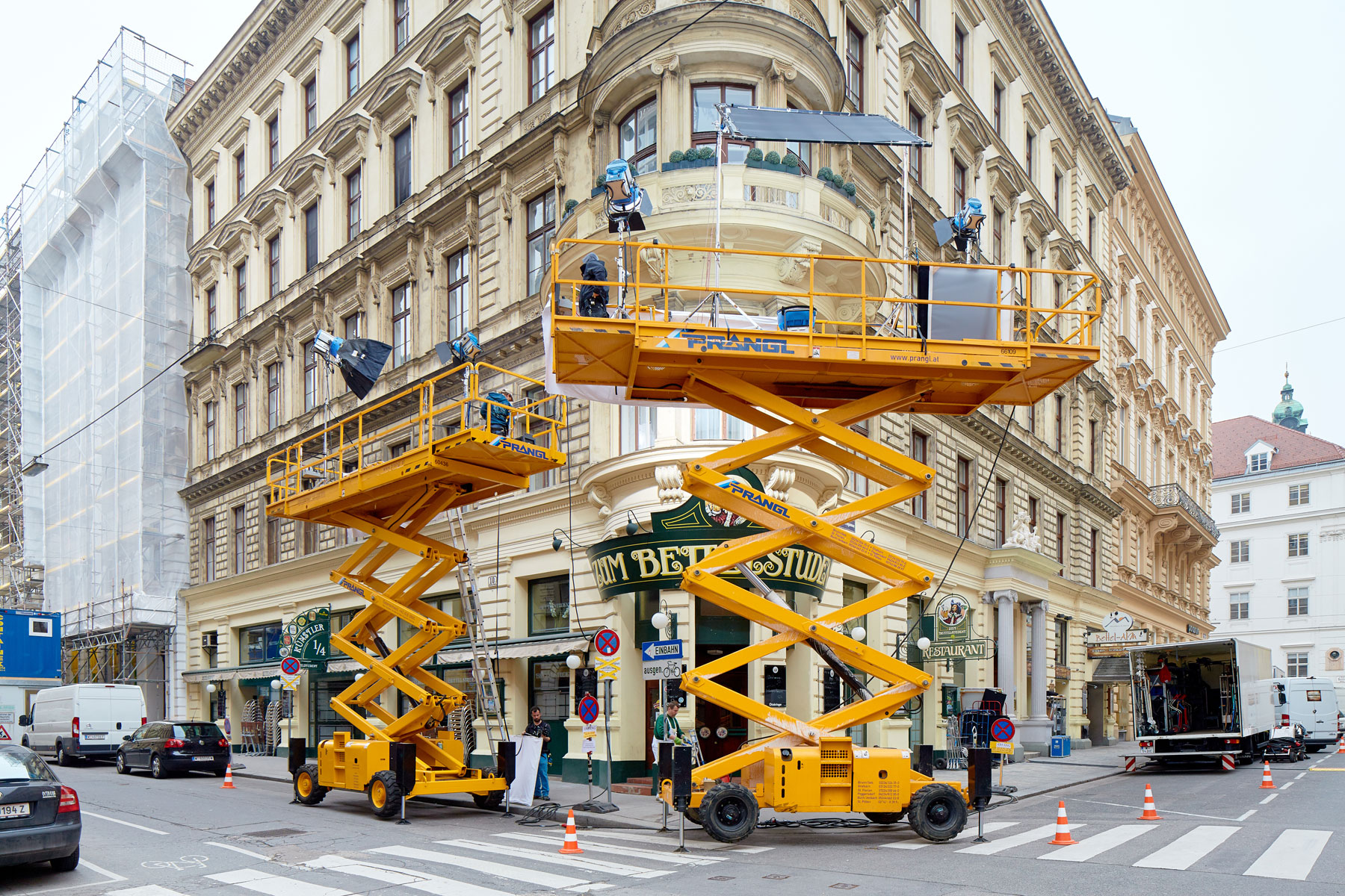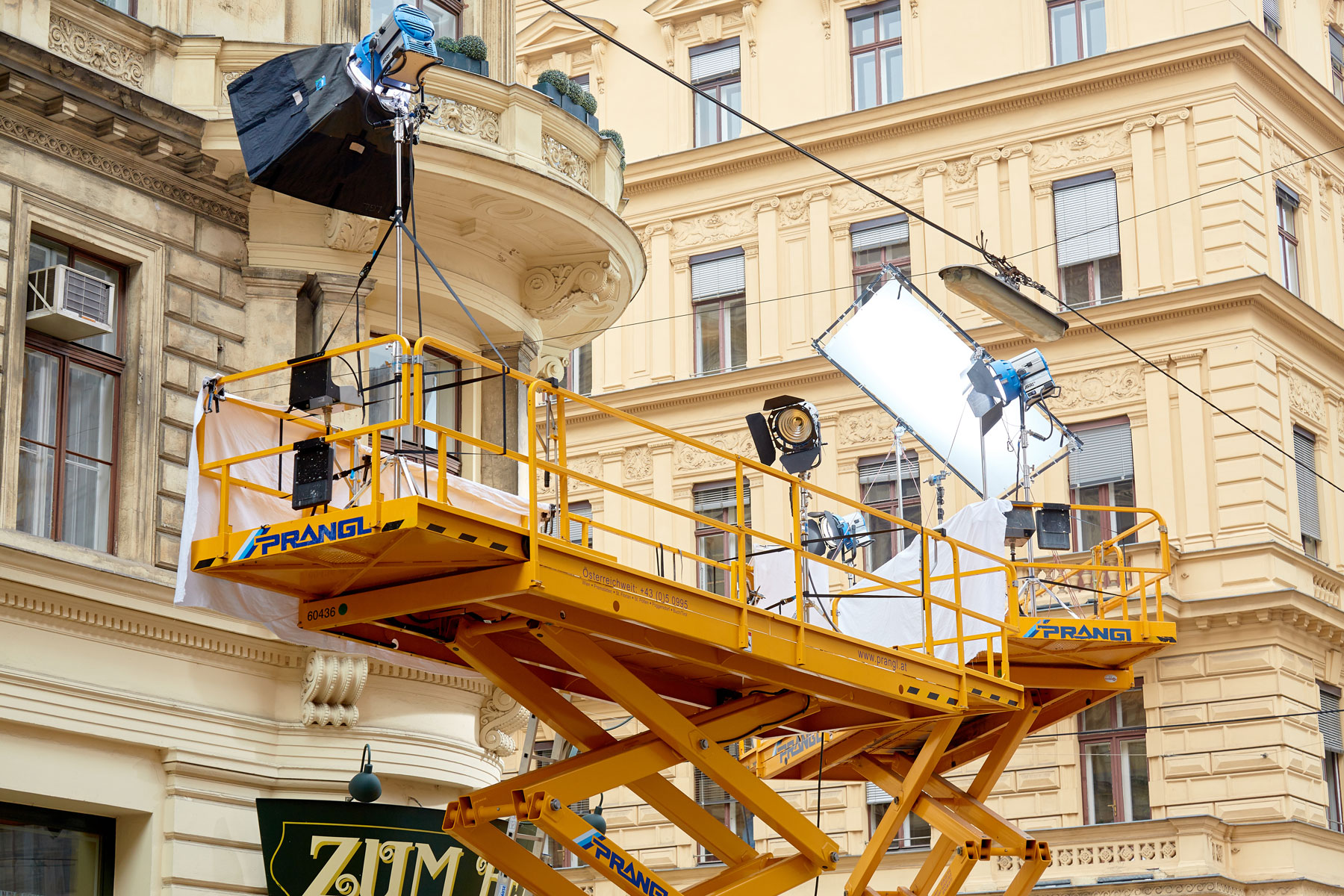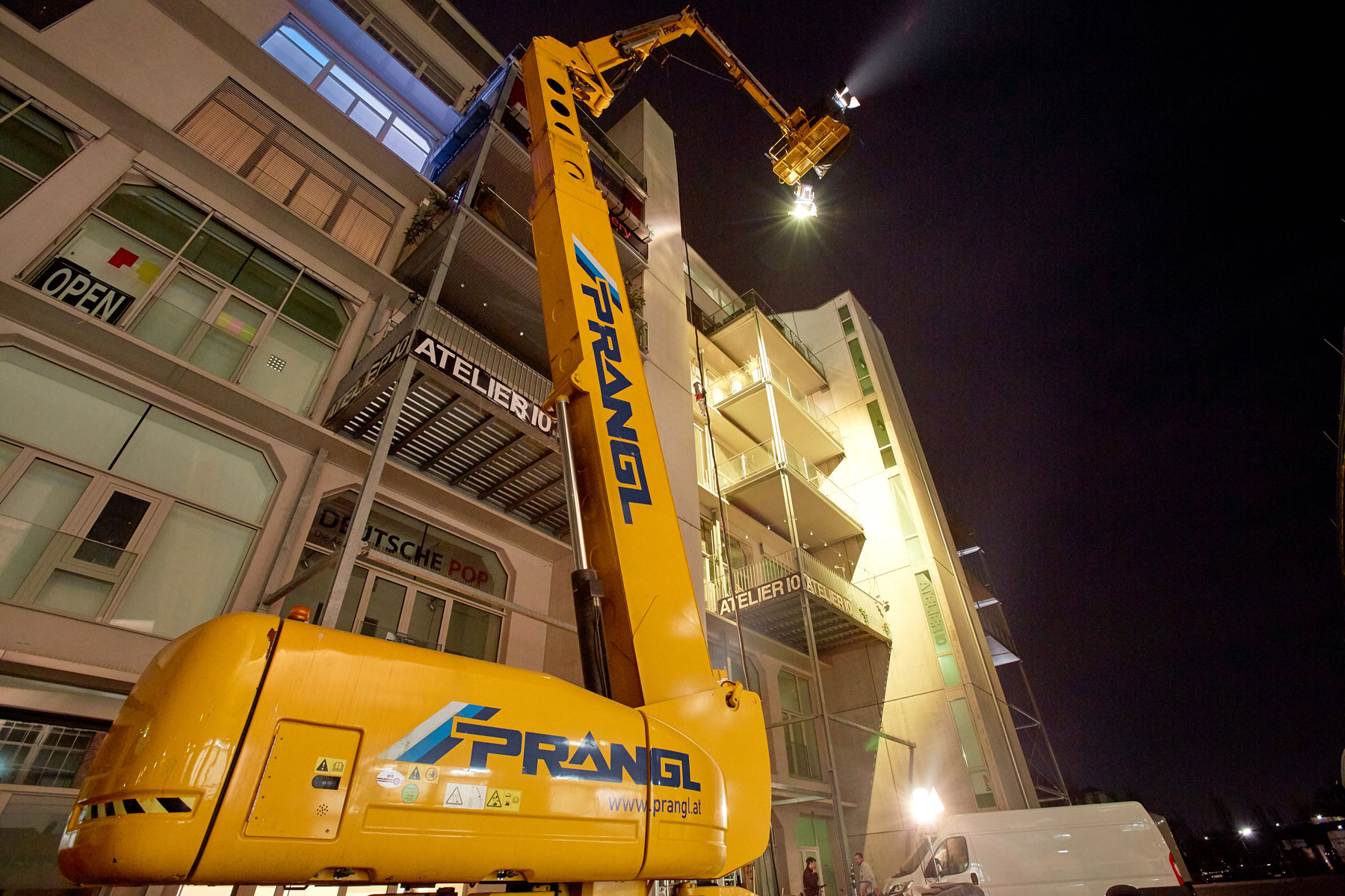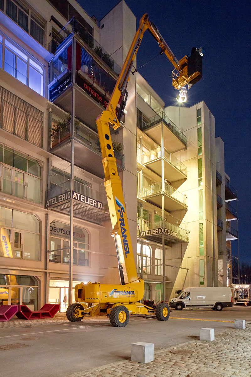 U roku od godine dana na austrijskoj televiziji ORF prikazat će se epizoda serije Tatort radnog naslova Die Faust (Pesnica). Između ostalog, optimalno osvjetljenje osiguravale su različite radne platforme tvrtke Prangl. Pri snimanju osam različitih scena korišten je jako raznolik vozni park: 5 škarastih radnih platformi od 15 metara, 2 škaraste platforme od 10 metara i jedna zglobna radna platfoma od 43 metra.